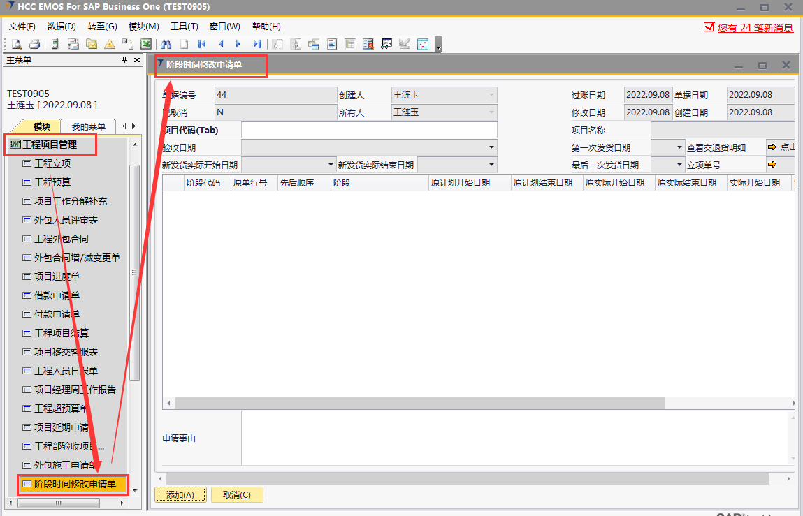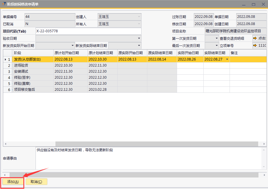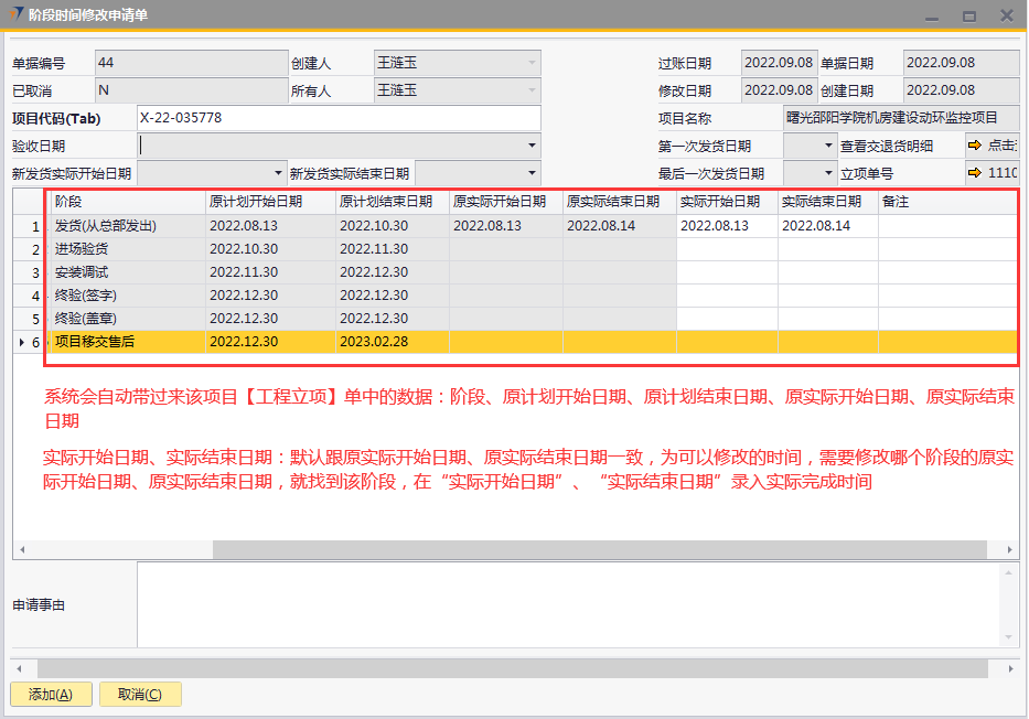 # 1 目的与作用 为了指导和规范工程人员、客服人员阶段时间修改申请操作,提升效率,规范管理 # 2 界面介绍 路径:工程项目管理 → 阶段时间修改申请单  # 3 操作说明 ## 3.1 表单  说明: * + **项目代码:**必填,按Tab选择,要修改阶段时间的项目 + **项目名称、第一次发货日期、最后一次发货日期、立项单号:**选择项目代码后,系统默认自动带出,不能录入也不能修改 + **申请事由:**必填,申请更改最后交货日期的原因 + **验收日期、新发货实际开始日期、新发货实际结束日期**,这些字段已关闭不启用 ## 3.2 操作说明 鼠标定位到项目代码(Tab),再按Tab键,会调取出来当前账号权限范围内所有可更修改阶段时间的项目  关键字搜索或直接鼠标滚动查找本次要更新的项目,双击或左下方选择,选择项目  系统会出来该项目【工程立项】单中所有阶段、原计划开始日期、原计划结束日期、原实际开始日期、原实际结束日期 实际开始日期、实际结束日期:默认跟原实际开始日期、原实际结束日期一致,为可以修改的时间,需要修改哪个阶段的原实际开始日期、原实际结束日期,就找到该阶段,在“实际开始日期”、“实际结束日期”录入实际完成时间  修改实际开始日期、实际结束日期为正确的日期,点左下方“添加”  单据添加后,实际开始日期、实际结束日期,数据会回写到对应的工程立项单 # 4 注意事项 无