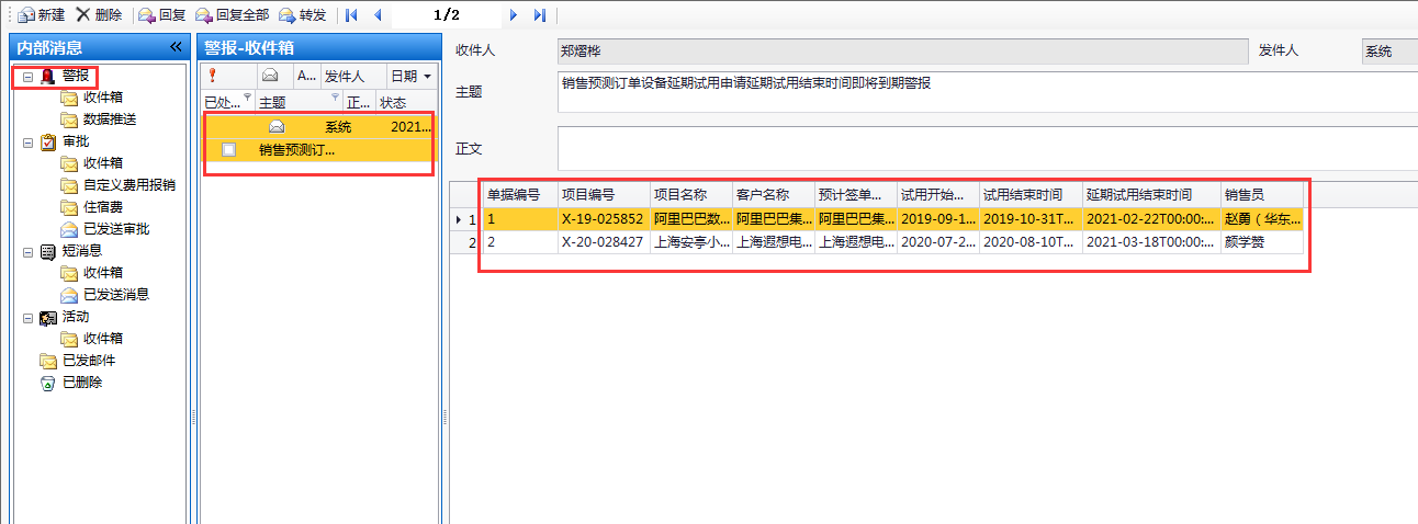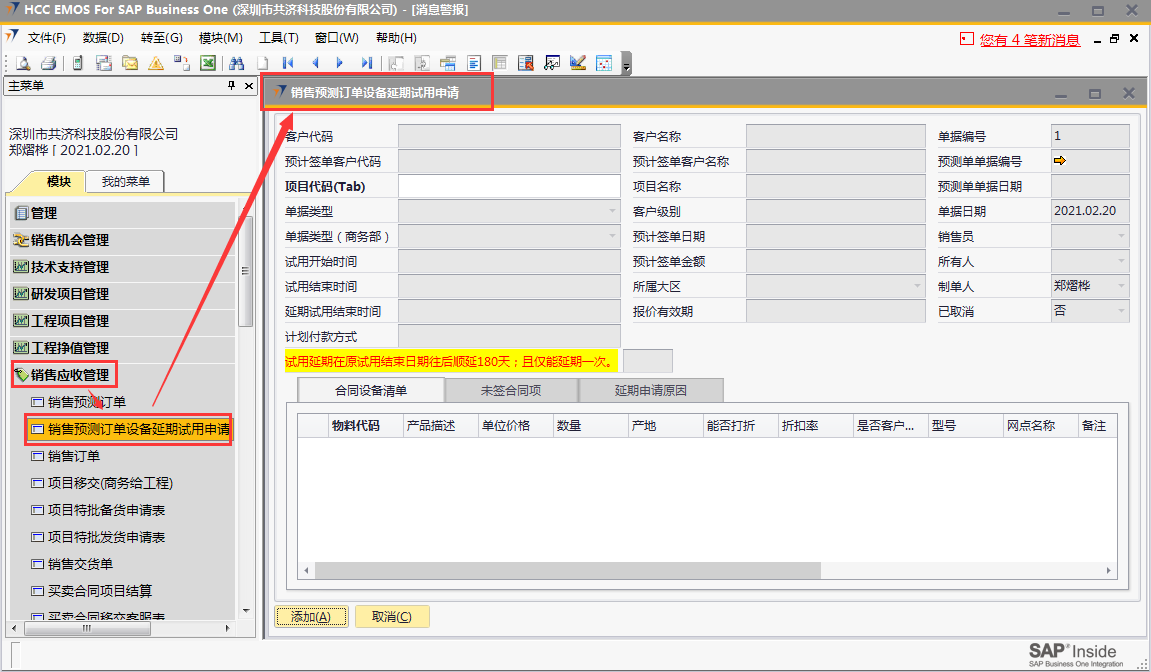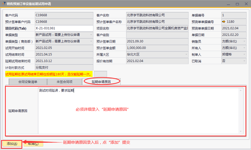 # 1 目的与作用 为了指导和规范销售人员申请延期销售预测订单设备试用结束时间,规范管理 # 2 界面介绍 路径:销售应收管理 → 销售预测订单设备延期试用申请  # 3 操作说明 ## 3.1 申请单录入 按Tab,选择要申请延期试用结束时间的销售预测订单,系统会自动将所选销售预测订单的内容填充过来  录入延期申请原因,点击“添加即可”  说明: * + 只能Tab出试用开始时间在2021.01.01后的销售预测单 + **延期试用结束时间:**在原试用结束日期往后延期180天,且仅能延期一次,由系统自动填写 + **延期申请原因:**必填,填写延期原因 + **其他内容从销售预测单带过来并自动填充** ## 3.2 警报 销售预测订单设备延期试用申请,距离延期试用结束时间小于等于30天时,系统会发送警报给对应销售员,警报效果如下