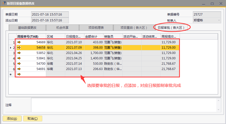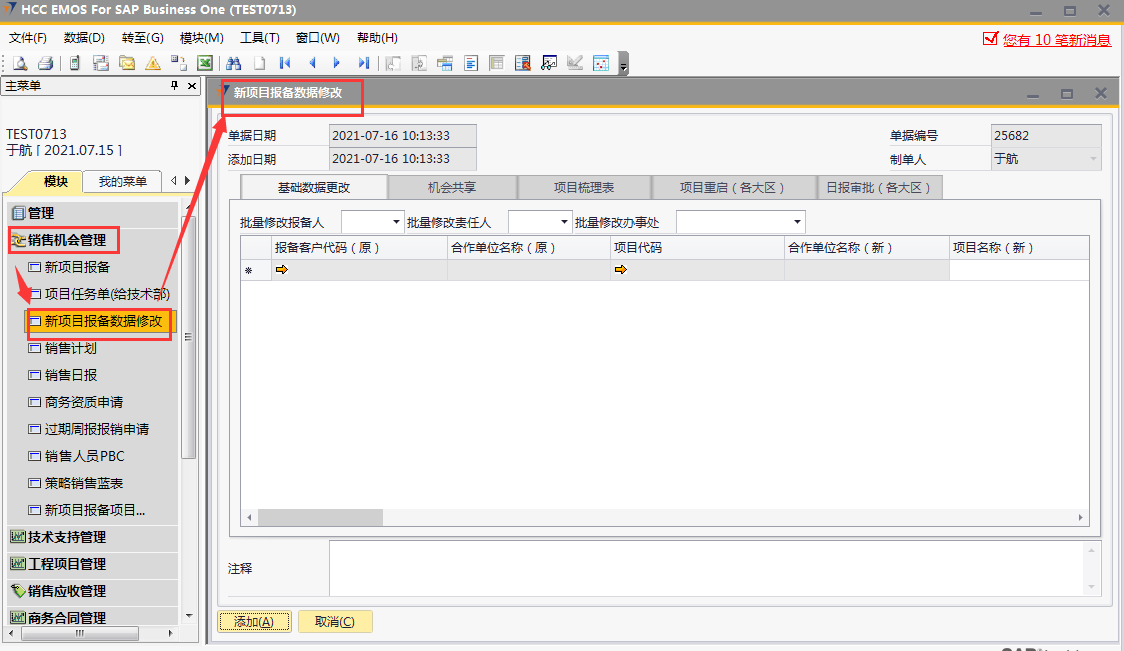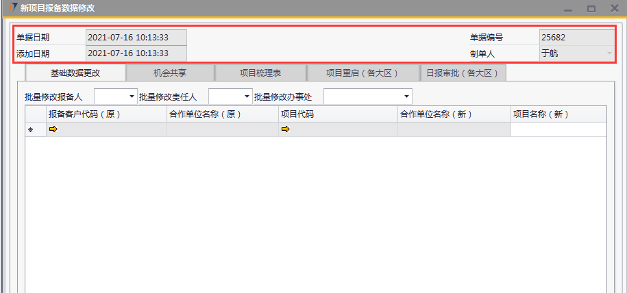 # 1 目的与作用 为了指导和规范销售人员新项目报备数据修改,规范管理 # 2 界面介绍 路径:销售机会管理 → 新项目报备数据修改  # 3 操作说明 ## 3.1 表头  说明: * + **单据日期、添加日期、单据编号、制单人**系统默认并自动带出 ## 3.2 表体 ## 基础数据更改  说明: * + 此页签用来修改新项目报备部分信息,按Tab选择要修改的新项目报备单,录入要修改的内容,左下方添加后,修改的内容会自动更新到对应的新项目报备单 + 如果报备时建设单位**为空**或设计单位**为空**,可修改成不为空 + 如果该报备项目没有后续单据,可修改**项目名称** + 行业、行业细分修改功能暂时**只对**营销中心助理开放,其他人无权操作 + **无效机会、重复项目、新报备人、新责任人、新项目区域、新办事处**:未做限制,业务实际情况需要修改时,可随时修改 + **批量修改报备人、批量修改责任人、批量修改办事处:**用来修改批量数据,操作时**先**选出要修改的批量数据,**再**选批量修改报备人、批量修改责任人、批量修改办事处,系统会自动填充到批量数据行里 + 基础数据如有修改并添加为正式单据后,修改的内容会自动更新到新项目报备单对应栏位 ## 3.2.1 机会共享  说明: * + 此页签用来共享新项目报备,按Tab选择要共享的新项目报备单,录入共享人员的名字,左下方添加后,新项目报备会自动共享到对方 + **批量共享给:**如果批量共享项目给同一人,操作时**先**选出要共享的批量数据,**再**选批量共享给,系统会自动填充到批量数据行里 ## 3.2.2 项目梳理表  说明: * + 此页签用来梳理新项目报备部分信息,按Tab选择要修改的新项目报备单,录入要梳理的内容,左下方添加后,梳理的内容会自动更新到对应的新项目报备单 + **可梳理的字段:**项目主产品、项目进度(新)、项目把握分类(新)、预计签单金额(新)、预计签单日期(新)、预计投标日期(新)、备注(新) ## 3.2.3 项目重启(行业总监权限)  说明: * + 项目重启功能只提供给行业总监使用 + 按Tab选择要重启的新项目报备(含丢单、无效机会、重复项目、项目终止),添加生成正式单据后,项目即刻重启为状态为“未清”的正常项目 ## 3.2.4 日报审批(行业总监权限)  说明: * + 日报审批功能只提供给行业总监使用 + 按Tab选择要审批的日报,添加生成正式单据后,对应日报即刻审批完成