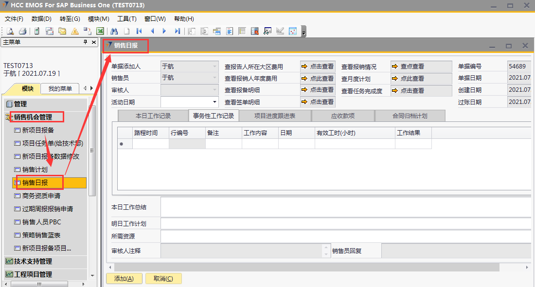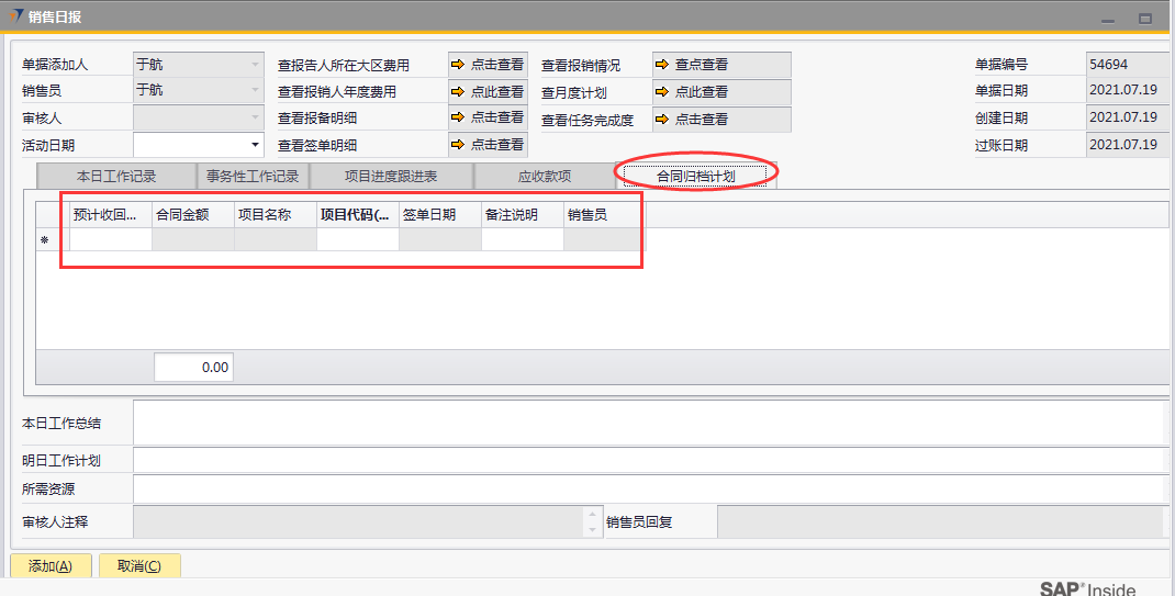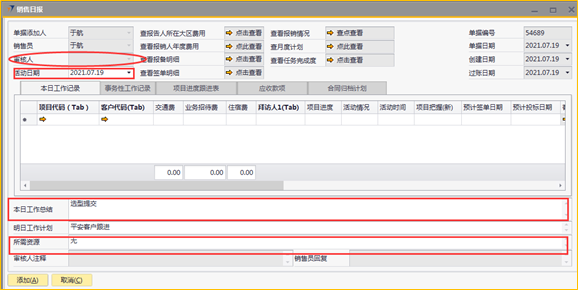 # 1 目的与作用 为了指导和规范销售人员销售日报填写,规范管理 # 2 界面介绍 路径:销售机会管理 → 销售日报  # 3 操作说明 ## 3.1 表头  说明: * + **活动日期:**必填,Tab选择,销售活动日期,可以是当天,也可以是前一天,同一活动日期只允许录入一张销售日报 。 + **审核人:**新建时为空,销售日报添加为正式单据后此字段会变白变亮 + **本日工作总结:**必填,当天的工作总结 + **明日工作计划:**非必填,明天的工作行程和计划 + **所需资源:**必填,跟进项目所需资源 + **单据添加人、销售员、单据编号、单据日期、创建日期、过账日期**系统默认自动带出 ## 3.2 表体 ### 3.2.1 本日工作记录(跟自定义费用报销关联)  说明: * + **客户代码:**必填,Tab选择拜访的客户代码 + **拜访人:**必填,Tab选择拜访的客户信息 + **项目代码:**如果是系统已经报备且已生成项目编号的项目,Tab选择;如果是还未在系统报备项目的,不录入。注意,先录入客户代码,才能选到对应报备的项目编号 + **项目进度:**必填,项目目前进度,销售日报中项目进度会自动回写到新项目报备 + **项目把握:**必填,项目目前把握程度,销售日报中项目把握会自动回写到新项目报备 + **活动情况:**必填,当天销售活动情况 + **活动时间:**必填,日报活动的时间 + **预计签单日期:**非必填,此字段目前不具回写功能 + **预计投标日期:**非必填,此字段目前不具回写功能 + **交通费:**如果产生交通费,录入 + **业务招待费:**如果产生业务招待费,录入 + **住宿费:**如果产生住宿费,录入 + **交通费、业务招待费、住宿费**金额会影响自定义报销金额,自定义费用报销中金额不可修改,所以销售日报的金额请务必按照发票金额准确无误录入 + 目前销售经理提交日报的主要作用有:汇报工作情况、关联自定义费用报销,所以一般只在**本日工作记录**页签中录入内容即可,其它页签可不用填写 ### 3.2.2 事务性工作记录  说明: * + **本日工作记录**、**事务性工作记录**必须满足有一个页签有明细内容,销售日报才能正常添加 + **事务性工作记录**跟自定义费用报销无关联 + 销售助理一般使用**事务性工作记录 + 应收款项**跟进应收 ### 3.2.3 项目进度跟进表  说明: * + 此页签内容功能暂停,可暂时不用录入 ### 3.2.4 应收款项(跟进应收使用)  说明: * + **项目代码:**必填,Tab选择当天跟进收款的项目内容 + **计划完成问题日期:**录入计划完成问题日期 + **预计回款日:**录入项目预计回款日期 + **催款进展说明:**录入当天催款进展说明 + **分类:**录入项目目前分类 + **项目问题分类:**录入项目目前问题分类 + **问题对应责任人:**录入项目问题对应的责任人 + **客户联系方式:**录入客户联系方式 + **是否需要升级解决:**如果需要升级,打勾 + 销售日报添加后,**计划完成问题日期、项目问题分类、问题对应责任人、客户联系方式、是否需要升级解决**数据会自动回写到应收账款明细账 ### 3.2.5 合同归档计划  说明: * + 此页签内容功能暂停,可暂时不用录入