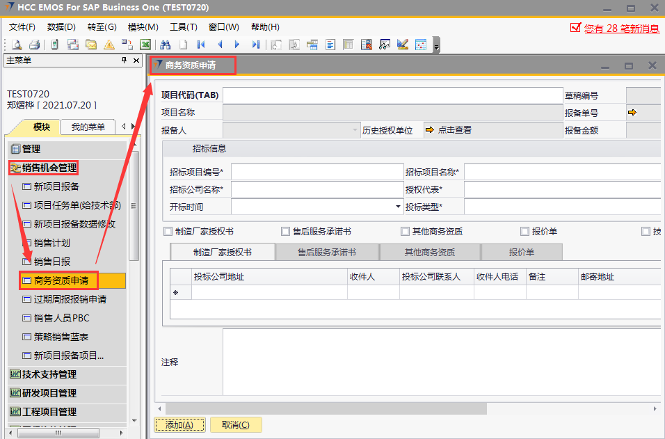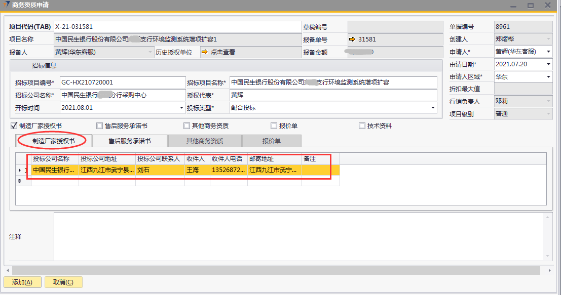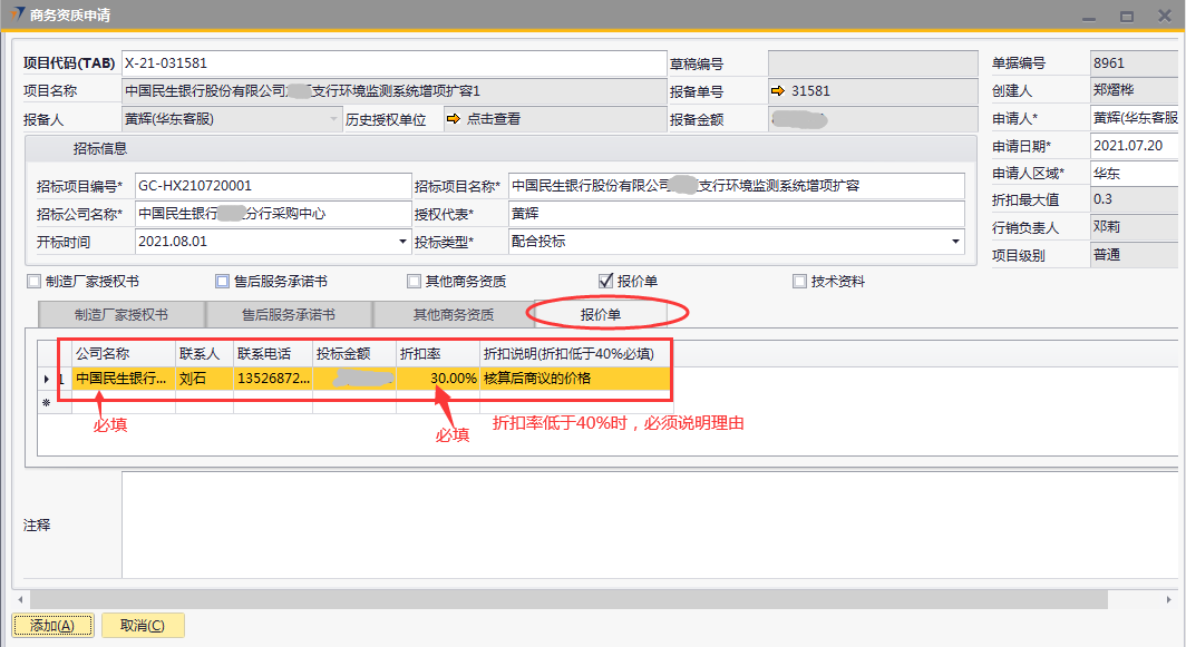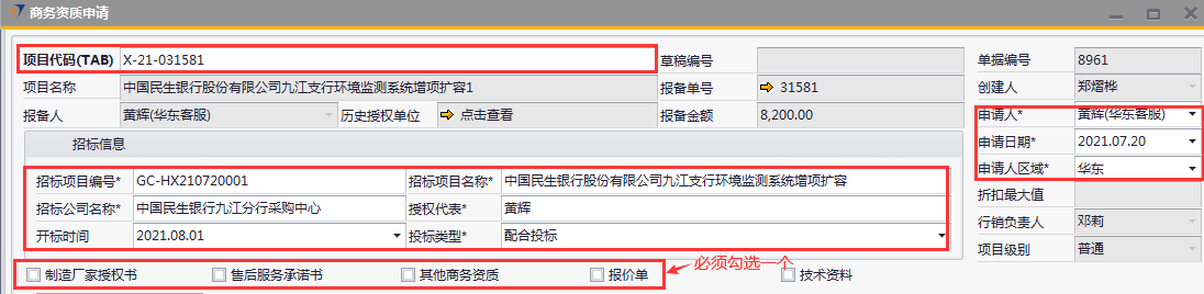 # 1 目的与作用 为了指导和规范销售人员商务资质申请提交,规范管理 # 2 界面介绍 路径:销售机会管理 → 商务资质申请  # 3 操作说明 ## 3.1 表头  说明: * + **项目代码:**必填,Tab选择,选择要申请商务资质的项目。可选择出来的项目逻辑为:项目报备状态为**未清**的报备项目,无效机会、重复项目、项目终止报备项目不能申请 + **招标项目编号:**必填,按实际填写招标项目编号 + **招标项目名称:**必填,按实际填写招标项目名称 + **招标公司名称:**必填,按实际填写招标公司名称 + **授权代表:**必填,按实际填写授权代表姓名 + **开标时间:**非必填,按实际录入开标时间 + **投标类型:**必填,有**配合投标**和**直接投标**,按实际情况选择 + **申请人:**必填,选择申请人 + **申请人区域:**必填,申请人所属区域 + **申请日期:**必填,申请商务资质的日期 + **制造厂家授权书、售后服务承诺书、其他商务资质、报价单**:必须勾选其中一个 + **项目名称、报备金额、创建人、行销负责人、项目级别**系统默认自动带出 ## 3.2 表体 如果表头勾选了**制造厂家授权书**,制造厂家授权书明细表必须有内容 如果表头勾选了**售后服务承诺书**,售后服务承诺书明细表必须有内容 如果表头勾选了**其他商务资质**,其他商务资质明细表必须有内容 如果表头勾选了**报价单**,报价单明细表必须有内容 ### 3.2.1 制造厂家授权书 如果表头勾选了制造厂家授权书,此明细表必须录入内容  说明: * + **投标公司名称:**必填,填写投标公司名称 + **投标公司地址:**必填,填写投标公司地址 + **投标公司联系人:**必填,填写投标公司联系人姓名 + **收件人:**必填,填写收件人姓名 + **收件人电话:**必填,填写收件人电话 + **邮寄地址:**必填,填写收件人地址 ### 3.2.2 售后服务承诺书 如果表头勾选了售后服务承诺书,此明细表必须录入内容  说明: * + **投标公司名称:**必填,填写投标公司名称 + **投标公司地址:**必填,填写投标公司地址 + **投标公司联系人:**必填,填写投标公司联系人姓名 + **收件人:**必填,填写收件人姓名 + **收件人电话:**必填,填写收件人电话 + **邮寄地址:**必填,填写收件人地址 ### 3.2.3 其他商务资质 如果表头勾选了其他商务资质,此明细表必须录入内容  说明: * + **公司名称:**必填,填写公司名称 + **所需资质:**必填,资质文件属性 + **联系人:**必填,填写相关联系人姓名 + **联系电话:**必填,填写相关人联系电话 ### 3.2.4 报价单 如果表头勾选了其他商务资质,此明细表必须录入内容  说明: * + **公司名称:**必填,填写公司名称 + **折扣率:**必填,填写本项目投标报价折扣率 + **折扣说明:**如果折扣率小于40%,必须填写折扣说明 + **联系人:**必填,填写相关联系人姓名 + **联系电话:**必填,填写相关人联系电话 + **投标金额:**必填,填写投标的金额