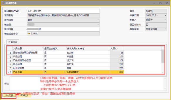 # 1 目的与作用 为了指导和规范行销人员项目任务单提交,规范管理 # 2 界面介绍 路径:技术支持管理 → 项目任务单  # 3 操作说明 ## 3.1 项目任务单新增 ### 3.1.1 表头  说明: * + **项目编号:**必填,Tab选择,选择要分配任务的项目(已经下过任务单的项目不允许再下任务单) + **项目预算:**项目编号自动带出,可修改 + **项目名称、项目级别、销售员**系统默认自动带出 ### 3.1.2 表体  说明: * + **技术人员:**必填,Tab选择,选择分配给哪些人,人员信息和ID会自动带出 + 只能由黄卫国、邓莉、黄巍、赵大为和售后人员分配任务单 + 项目任务单必须有一个主责任人 + 一个项目最多分配给6个行销人员 + 明细行技术人员不能重复 ## 3.2 项目任务单修改 已添加分配的项目任务单分配人员如果有变化,可以修改项目任务单 打开项目对应的项目任务单,直接更新任务分派明细行  说明: * + 只有主责任人和售后制单人本人,可修改项目任务单 + 行为亮白色的字段,都可以修改或者删除 + 修改时,必须保证有且只有一个主责任人 + 可以删除已经分派的技术人员明细行 + 更新时,技术人员不能重复