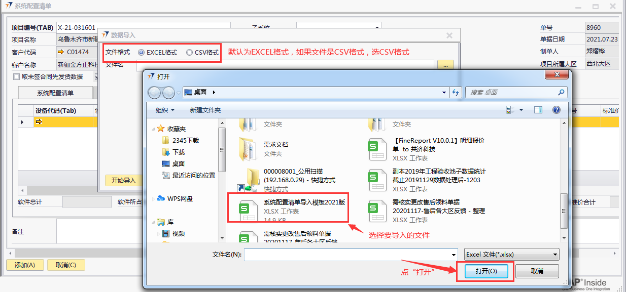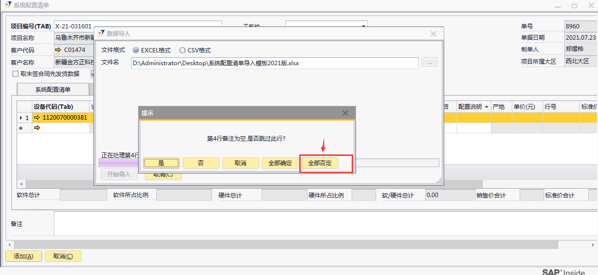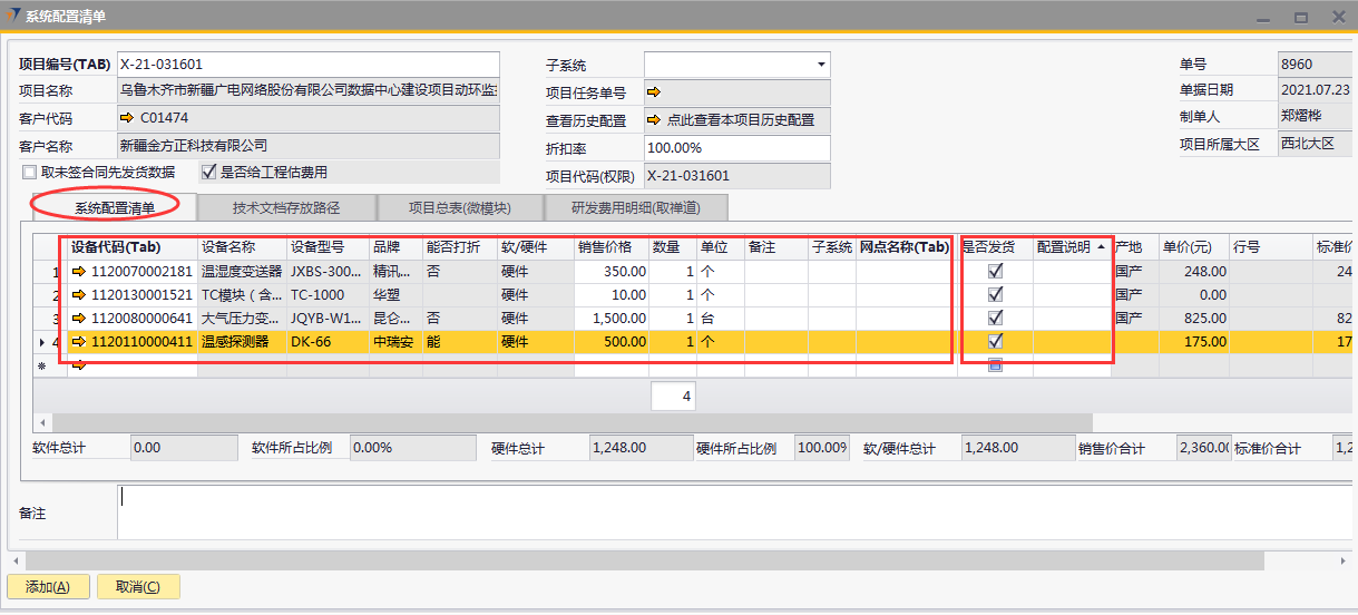 # 1 目的与作用 为了指导和规范技术支持人员系统配置清单录入,规范管理 # 2 界面介绍 路径:技术支持管理 → 系统配置清单(技术给销售)  # 3 操作说明 ## 3.1 表头  说明: * + **项目代码:**必填,Tab选择,选择要录入系统配置清单的项目。可选择出来已经报备且没有生成销售订单的项目 + **子系统:**非必填,选择项目所属子系统名称 + **折扣率:**跟项目代码自动带出,可修改 + **取未签合同先发货数据:**勾选后,表体系统配置清单Tab会取出未签合同先发货数据 + **是否给工程估费用:**勾选后,工程估算才能调取到该配置清单内容,不勾选工程估算调取不到 + **项目名称、客户代码、客户名称**系统默认自动带出 ## 3.2 表体 ### 3.2.1 系统配置清单 1. 手工录入  说明: * + 同一项目可以多次录入系统配置清单 + **设备代码:**必填,Tab选择。如果表头勾了**取未签合同先发货数据**,则出来未签合同先发货的设备;如果表头没勾**取未签合同先发货数据**,则出来所有未冻结且是技术支持物料的设备 + **销售价格:**必填,填写销售价格 + **数量:**必填,填写所需数量 + **是否发货:**必填,默认为打勾,如果不用发货则去掉打勾 + **子系统:**非必填 + **网点名称:**非必填,用于联网项目,录入联网项目网点明细 + **设备代码、设备名称、设备型号、品牌、能否打折、软/硬件、销售价格、数量、单位、备注、子系统、网点名称**会自动带到销售订单 + 设备代码、数量、是否发货,销售订单只能跟系统配置清单完全一致,所以录入时请一定要准确无误 2. 导入 导入模板 在导入模板录入数据,模板数据维护如下  系统配置清单明细表处,右键----数据导入  将弹出数据导入对话框,默认是EXCEL格式,如果导入文件是CSV格式,选CSV格式,并选择要导入的文件名,点“打开”  点“开始导入”  会看到如下界面,选“全部否定”  点“确定”  检查导入的数据,需要调整的调整,数据无误后,点“添加”提交  ### 3.2.2 技术文档存放路径  说明: * + 此功能暂时未运用,可不用录入 ### 3.2.3 项目总表(微模块)  说明: * + 此功能暂时未运用,可不用录入 ### 3.2.4 研发费用明细(取禅道)