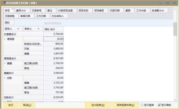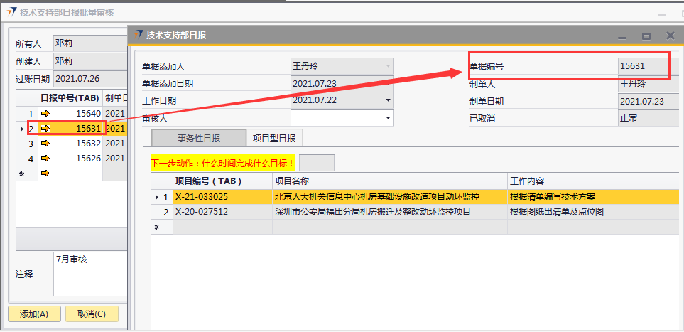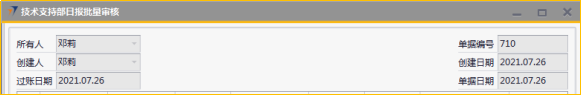 # 1 目的与作用 指导和规范相关人员技术支持部日报批量审核录入操作,准确快捷地录入内容,提升工作效率 # 2 界面介绍 ## 2.1 路径 技术支持管理 → 技术支持部日报批量审核  ## 2.2 表头  说明: * + **创建人、所有人、单据编号、创建日期、单据日期、过账日期:**系统默认带出,不能修改 ## 2.3 表体  说明: * + **日报单号(Tab):**按Tab键选择,必录,需要批量审核的日报单号 + **制单日期、制单人、工作日期、费用小计、事务性工时小计、项目型工时小计:**根据选择的项目自动填入,不可手工填入 + **审核人:**系统自动默认为当前登录账户 + **注释:**必录,当前单据的整体说明、备注字段 # 3 操作方法 1)将鼠标光标定位在**日报单号(Tab)**,按Tab键  2)在弹出来的对话框中,选择需要批量审核的日报,可按单号或者制单人搜索,支持模糊查询;也可一次性选择多个项目(按Ctrl键,然后点击鼠标左键,可以间隔多选;先选中开始行,然后按Shift键,然后鼠标左键点到想要选取的结束位置,可以连续多选);最后点击**选择**按钮,系统将选中的项目带到单据体中  3)填入注释,检查数据无误后,即可点击添加 注意: ①同一个日报单号不能在当前单据重复 ②如日报单有费用,则系统默认将制单人填入的费用更新为费用批准额,如批量审核日报时需要修改费用批准额,请到本身的日报单上去审核  4)日报单号(TAB)列里面的黄色箭头可链接到对应的技术支持部日报界面  # 4 报表说明 ## 4.1 路径 自定义报表 → 技术支持部报表 → 技术支持部日报(透视)  ## 4.2 操作步骤 1. 点击菜单,填入查询条件  2. 结果展示(可按自己的喜好,将上面的字段拖动到不同的分析位置去分析)  3. 也可以点击不同的单元格,去查看具体的分配数据  4. 可拖动列分析出没有审核的日报,然后双击对应的单元格链接到明细表,然后点击明细表里面对应的日报单号,链接到具体的日报单,则可以对某张具体的日报进行审核、并更新上行销项目进度和费用批准额  # 5 注意事项 按照技术支持部要求,操作权限目前只给到四大负责人(黄卫国、邓莉、赵大为、黄巍)