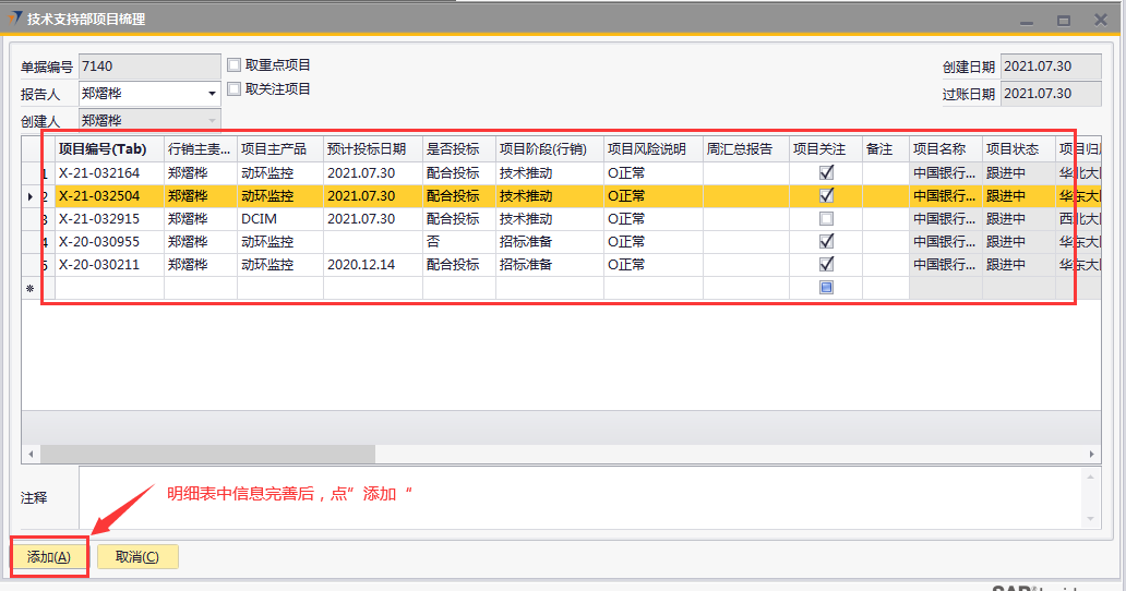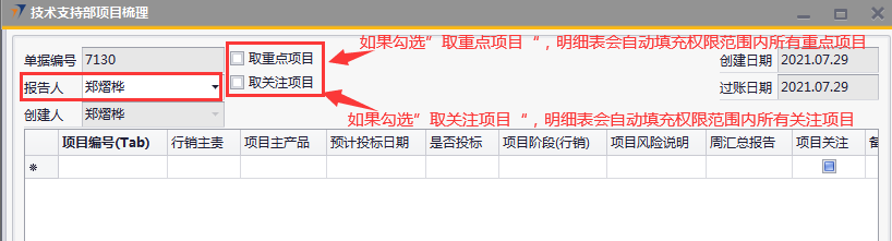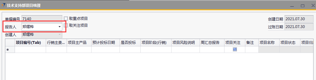 # 1 目的与作用 为了指导和规范技术支持人员梳理项目,提升效率,规范管理 # 2 界面介绍 路径:技术支持管理 → 技术支持部项目梳理  # 3 操作说明 ## 3.1 表头  说明: * + 取重点项目:可勾选,如果勾选,明细表会自动填充权限范围内所有重点项目 + 取关注项目:可勾选,如果勾选,明细表会自动填充权限范围内所有关注项目 + **报告人:**必填,当前项目梳理表报告人,默认跟创建人一致,可修改 + **创建日期、过账日期、创建人:**系统默认自动带出,不能录入也不允许修改 ## 3.2 表体  说明: * + **项目编号:**必填,Tab选择,选择要梳理的项目 + **行销主责任人:**必填,如果任务分配里有系统会自动带出;没有自动带出则手工录入 + **项目主产品:**必填,录入项目主产品 + **是否投标:**必填,按实际情况录入 + **预计投标日期:**“是否投标”不为“否”时,必须填写“预计投标日期”;“是否投标”为“否”时,不允许填写“预计投标日期” + **项目阶段(行销):**必填,按实际情况录入 + **项目风险说明:**必填,按实际情况录入,“项目风险说明”内容的选择会刷新“项目风险”字段 + **周汇总报告:**选填,按项目实际跟进情况录入 + **项目关注:**勾选表示关注,勾选后,之后的项目梳理如果取关注项目就会自动带出来 + **备注:**选填,说明性文字 + **项目名称、项目状态、项目归属大区、人员所属大区、项目级别、销售责任人、项目把握**等字段,系统默认自动带出,不能录入也不允许修改 + **项目风险、项目关注**,只有行销主责任人、邓莉、黄卫国,才允许录入 ## 3.3 操作步骤 1. 录入表头信息  2. 鼠标定位到项目编号(TAB),再按Tab键,会调取出来所有当前登录账号可梳理的项目  3. 选择要梳理的项目  4. 项目选择后,完善行销主责任人、项目主产品、是否投标、预计投票日期、项目阶段、项目风险说明等相关内容,最后点“添加”提交