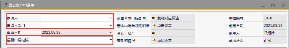 # 1 目的与作用 为了指导和规范相关人员固定资产申请,提升效率,规范管理 # 2 界面介绍 路径:固定资产管理 → 固定资产申请单  # 3 操作说明 ## 3.1 表头  说明: * + **申请人:**必填,选择申请人姓名 + **报销人:**必填,选择申请人所属部门 + **是否申请电脑:**必填,如果申请电脑,选**是**;如果不是申请电脑,选**否** + **点击查看电脑配置:**链接字段,点橙色箭头可查看相关人员可申请电脑标准配置 + **查本申请单领用明细:**链接字段,点橙色箭头可查看相关人员可申请电脑标准配置(添加为正式单据后才可查看进度) + **查在手资产:**链接字段,点橙色箭头可查看申请人员已经领用的固定资产 + **查采购情况:**链接字段,点橙色箭头可查看当前固定资产申请单采购情况(添加为正式单据后才可查看进度) + **申请日期、创建日期、单据状态:**系统默认自动带出,不能录入也不能修改 ## 3.2 表体  说明: * + **资产名称:**必填,录入申请的资产名称 + **描述:**必填,录入申请的资产描述,越详细越好 + **型号:**必填,录入申请的资产型号,越详细越好 + **要求到货日期:**选填,希望固定资产到货的日期 + **资产类型:**必填,有**办公家私、电子设备、房屋厂房、交通工具**四种类型,选择申请资产对应的资产类型 + **数量:**必填,申请的资产数量 + **资产编码:**不填,此栏位理论由财务人员在资产编码后录入 + **电脑类型:**如果申请的是电脑,必须录入 申请电脑时,请先点表头**点击查看电脑配置**,查看可申请的电脑配置明细 * + 申请理由:必填,申请固定资产的原因,请详细说明 ## 3.3 操作步骤 本次以申请电脑为例 ### 3.3.1 表头录入 录入申请人、申请人部门,是否申请电脑选择**是**  ### 3.3.2 表体录入 录入资产名称、描述、型号、要求到货日期、资产类型、数量、电脑类型、申请理由,信息录入完整无误后,点“添加”提交  # 注意事项 暂无