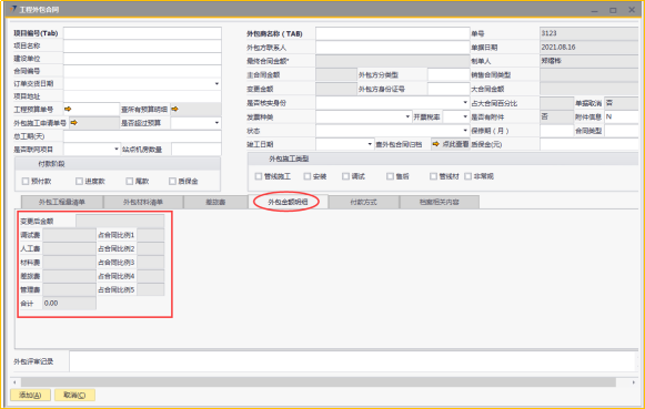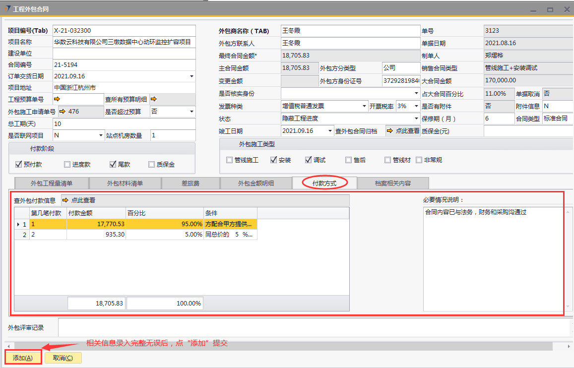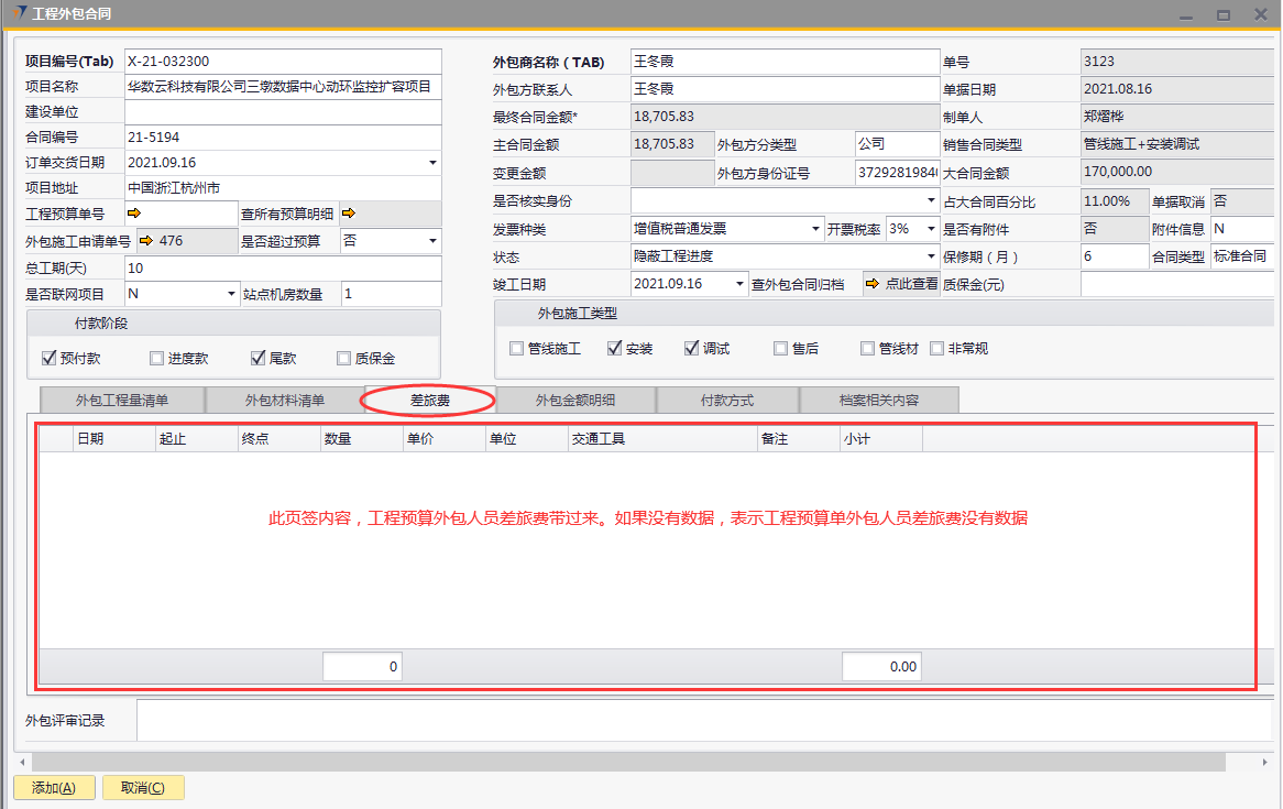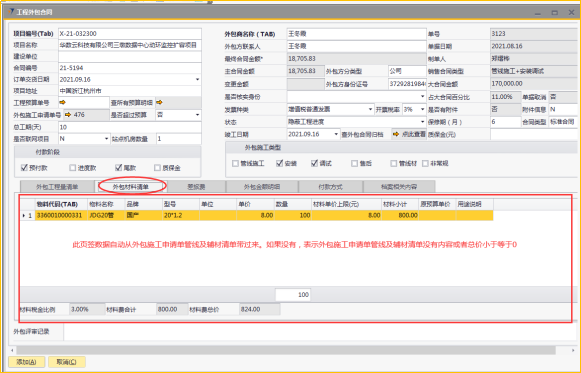 # 1 目的与作用 为了指导和规范工程人员工程外包合同录入,提升效率,规范管理 # 2 界面介绍 路径:工程项目管理 → 工程外包合同  # 3 操作说明 ## 3.1 表头  说明: * + **项目编号:**必填,按Tab选择,外包的项目编号 + **项目名称:**必填,跟项目编号自动带出 + **建设单位:**选填,项目的建设单位 + **合同编号:**选填,如果是销售订单的外包,会自动带出销售订单里的合同编号 + **订单交货日期:**选填,订单的交货日期 + **项目地址:**必填,项目所在地址 + **外包施工申请单:**链接字段,点橙色箭头可查看该项目外包施工申请单 + **是否超预算:**选填,外包合同是否超预算 + **总工期(天):**必填,外包需要的总工期,按天录入 + **是否联网项目:**选填,项目是否是联网项目 + **站点机房数量:**选填,项目站点机房总数 + **外包商名称:**必填,外包商名称 + **外包商联系人:**必填,外包商联系人 + **外包方分类型:**选填,外包方类型 + **外包方身份证号:**选填,外包方身份证号 + **最终合同金额:**必填,从外包施工单带出,不能录入也不能修改 + **主合同金额:**必填,从外包施工单带出,不能录入也不能修改 + **变更金额:**选填,从外包施工单带出,不能录入也不能修改 + **状态:**选填,项目最新状态 + **竣工日期:**必填,外包预计竣工日期 + **保质期(月):**必填,外包保质期,按月录入 + **质保金(元):**选填,质保金金额 + **合同类型:**选填,外包合同类型 + **销售合同类型、大合同金额、占大合同百分比:**系统默认自动带出,不能录入也不能修改 + **付款阶段:**必录,外包合同有哪些付款阶段 + **外包施工类型:**必选,必须选一个类型 ## 3.2 表体 ### 3.2.1 外包工程量清单  说明: * + **设备名称:**必填,设备名称,从外包施工申请单**施工明细清单**带过来,不能录入也不能修改 + **设备代码、型号、单位、价格(预算)、数量、安装单价、调试单价、安装小计、调试小计:**选填,设备型号,从外包施工申请单**施工明细清单**带过来,不能录入也不能修改 + **备注说明:**必填,设备基本情况说明 ### 3.2.2 外包材料清单  说明: * + 此页签内容,从外包施工申请单**管线及辅材清单**带过来,不能录入也不能修改 ### 3.2.3 差旅费  说明: * + 此页签内容,工程预算**外包人员差旅费**带过来,不能录入也不能修改 ### 3.2.4 外包金额明细  说明: * + 此页签内容,系统自动计算 ### 3.2.5 付款方式  说明: * + **第几笔付款:**必填,第几笔付款 + **付款金额:**必填,选择项目阶段时,系统会默认带出,不允许录入也不可修改 + **百分比:**必填,付款占外包总金额的百分比 + **条件:**选填,付款条件说明 + **必要情况说明:**选填,外包必要情况说明 ### 3.2.6 项目相关信息  说明: * + 此页签用来查看项目档案相关内容 ## 3.3 操作步骤 ### 3.3.1 录入表头信息 鼠标定位到项目编号(Tab),再按Tab键,会调取出来当前账号权限范围内的所有可做外包的项目  关键字搜索或直接鼠标滚动查找本次要录外包的项目,双击或左下方**选择**,选择项目  系统会带出来部分相关信息,手动录入其他需要录入的信息  ### 3.3.2 录入表体信息 #### 3.3.2.1 录入外包工程量清单 此页签会自动从外包施工申请单**施工明细清单**带过来,只有备注说明可以手工维护,如果需要说明,手工维护备注说明。检查明细行数据、安装费合计、调试费合计、税金比例、安装费总价、调试费总价  #### 3.3.2.2 录入外包材料清单 此页签数据自动从外包施工申请单**管线及辅材清单**带过来,检查明细、材料税金比例、材料费合计、材料费总价  #### 3.3.2.3 录入差旅费  #### 3.3.2.4 检查外包金额明细 检查外包金额明细  #### 3.3.2.5 录入付款方式 录入付款相关信息,相关信息录入完整无误后,点“添加”提交  # 4 注意事项 1. 先有外包施工申请单,才能录工程外包合同,否则工程外包合同明细表里取不到数据 2. 付款金额总和必须要等于最终合同金额