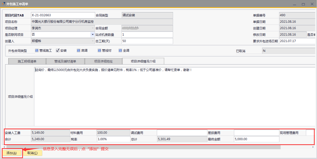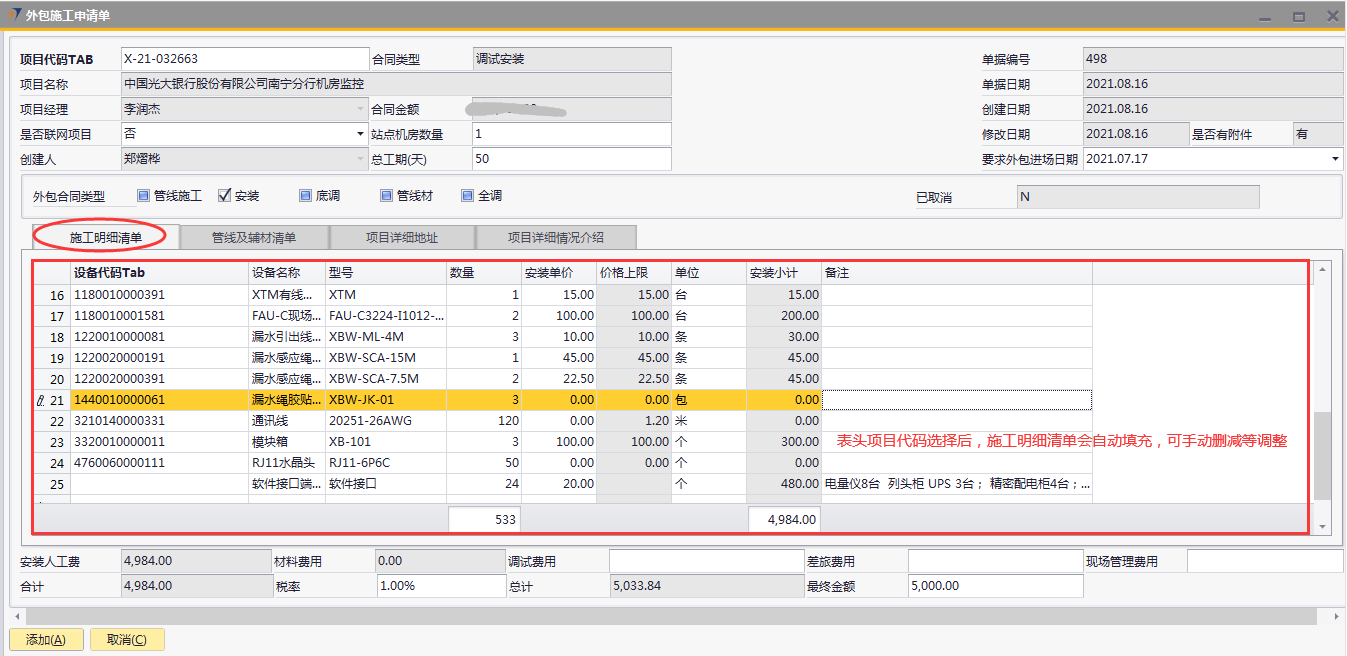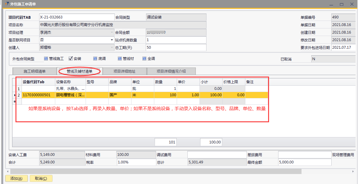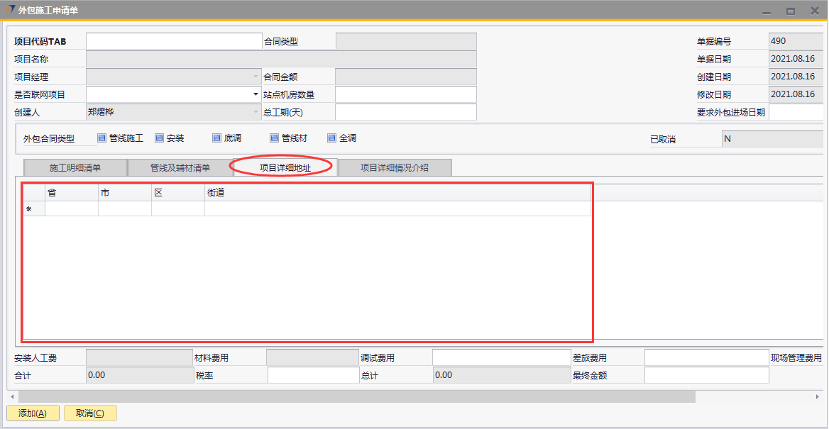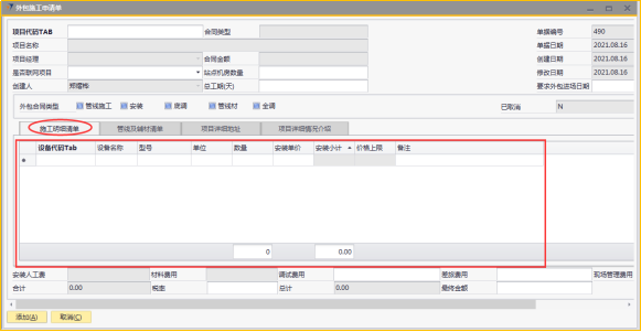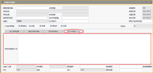 # 1 目的与作用 为了指导和规范工程人员外包施工申请单录入,提升效率,规范管理 # 2 界面介绍 路径:工程项目管理 → 外包施工申请单  # 3 操作说明 ## 3.1 表头  说明: * + **项目编号:**必填,按Tab选择,外包施工申请的项目 + **项目经理:**必填,负责本项目的项目经理 + **是否联网项目:**选填,项目是否是联网项目 + **站点机房数量:**选填,项目站点机房数量 + **总工期(天):**必填,外包施工总工期,按天计算 + **要求外包进场日期:**必填,要求外包商进场的时间 + **项目名称、项目经理、合同类型、合同金额、单据日期、已取消:**系统默认自动带出,不能录入也不能修改 ## 3.2 表体 ### 3.2.1 施工明细清单 表头信息选择后,本页签内容会自动填充(项目如果有销售订单,填充内容是销售订单明细行+变更单明细行;项目如果只有未签合同先发货,填充内容是未签合同先发货明细行+变更单明细行),可手动调整  说明: * + **设备代码:**选填,如果是系统设备,按Tab选择 + **设备名称:**必填,如果选择系统设备,设备名称会自动带出;如果不是系统设备,手动录入设备名称 + **型号:**选填,如果选择系统设备,设备型号会自动带出;如果不是系统设备,手动录入设备型号 + **单位:**选填,如果选择系统设备,单位会自动带出;如果不是系统设备,手动录入单位 + **数量:**必填,需要的设备数量 + **安装单价:**必填,设备安装单价 + **安装小计:**等于安装单价*数量 + 价格上限:如果是系统设备,会自动带出,不能录入也不能修改 + **备注:**要说明的相关事项 ### 3.2.2 管线及辅材清单  说明: * + **设备代码:**选填,如果是系统设备,按Tab选择 + **设备名称:**必填,如果选择系统设备,设备名称会自动带出;如果不是系统设备,手动录入设备名称 + **型号:**选填,如果选择系统设备,设备型号会自动带出;如果不是系统设备,手动录入设备型号 + **品牌:**选填,如果选择系统设备,品牌会自动带出;如果不是系统设备,手动录入品牌 + **单位:**选填,如果选择系统设备,单位会自动带出;如果不是系统设备,手动录入单位 + **数量:**必填,需要的设备数量 + **单价:**必填,设备单价 + **小计:**等于单价*数量 + 价格上限:如果是系统设备,会自动带出,不能录入也不能修改 + **备注:**要说明的相关事项 ### 3.2.3 项目详细地址  说明: * + **省:**必填,选择项目所在省 + **市:**必填,选择项目所在市 + **区:**选填,录入项目所在区 + **街道:**选填,录入项目所在街道 ### 3.2.4 项目详细情况介绍  说明: * + **项目详细情况介绍:**必填,录入项目详细情况介绍 ### 3.2.5 其他  说明: * + **安装人工费:**施工明细清单中安装小计之和,系统自动带出,不能录入也不能修改 + **材料费用:**管线及辅材清单小计之和,系统自动带出,不能录入也不能修改 + **调试费用:**选填,如果有调试费用,手工录入 + **差旅费用:**选填,如果有差旅费用,手工录入 + **现场管理费用:**选填,如果有现场管理费用,手工录入 + **合计:**安装人工费 + 材料费用 + 调试费用 + 差旅费用 + 现场管理费用 + **税率:**选填,手工录入税率 + **总计:**合计* (1+税率) + **最终金额:**选填,外包施工申请单最终金额 ## 3.3 操作步骤 ### 3.3.1 录入表头信息 鼠标定位到项目代码(Tab),再按Tab键,会调取出来当前账号权限范围内所有可做外包施工申请单的项目  关键字搜索或直接鼠标滚动查找本次要立项的项目,双击或左下方选择,选择项目  系统会带出来部分相关信息,手动录入其他需要录入的信息  ### 3.3.2 录入表体信息 #### 3.3.2.1 录入施工明细清单 表头项目信息选择后,施工明细清单会自动填充,如有填充,可手动调整(删行、增行、调整单价、调整数量等),如有需要备注说明的,在备注栏录入  #### 3.3.2.2 录入管线及辅材清单 如果是系统设备,按Tab选择,再录入数量和单价;如果不是系统设备,手动录入设备名称、型号、品牌、数量、单价  #### 3.3.2.3 录入项目详细地址 录入项目的项目地址  #### 3.3.2.4 录入项目详细情况介绍 录入项目详细情况说明  说明: * + Tab出来内容,系统默认申报工时跟有效工时上限一致。如修改,修改时如果申报工时>有效工时上限,需要在备注内说明 #### 3.3.2.5 其他 调试费用、差旅费用、现场管理费用如果有产生,录入 录入税率、最终金额 信息录入完整无误后,点左下方“添加”提交  说明: * + Tab出来内容,系统默认申报工时跟有效工时上限一致。如修改,修改时如果申报工时>有效工时上限,需要在备注内说明 # 4 注意事项 一个项目只允许录入一次外包施工申请单