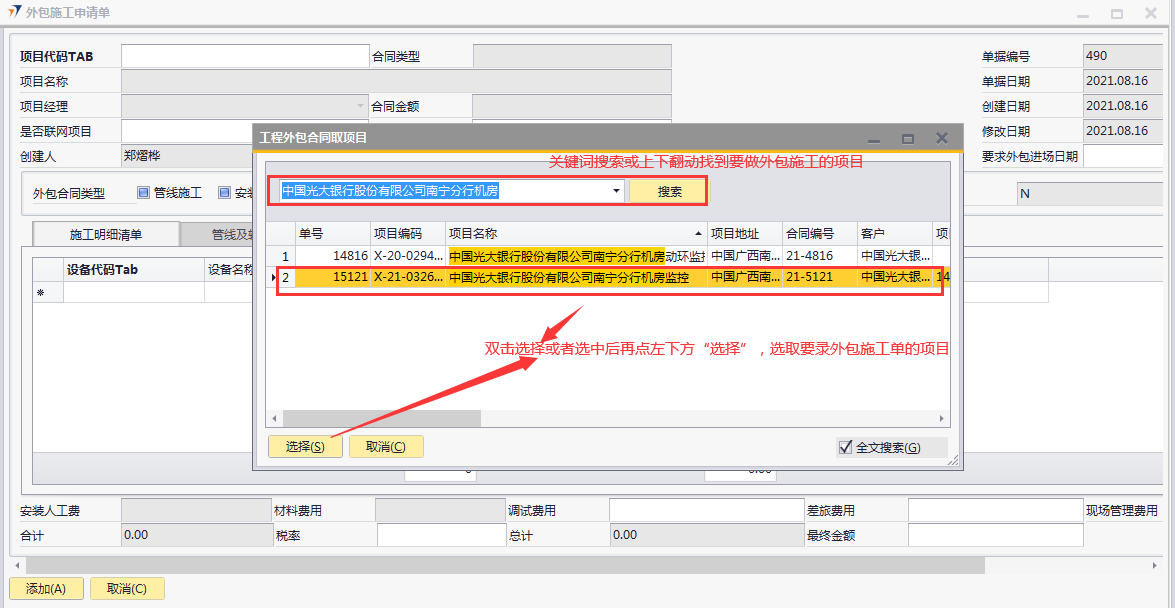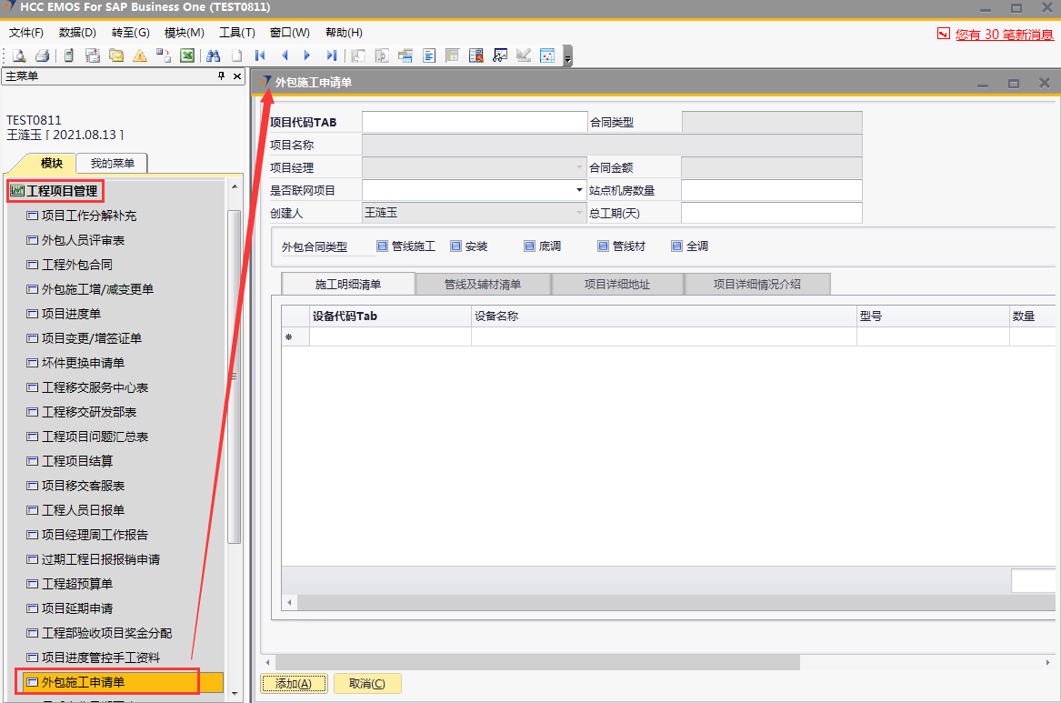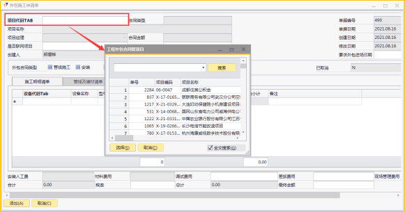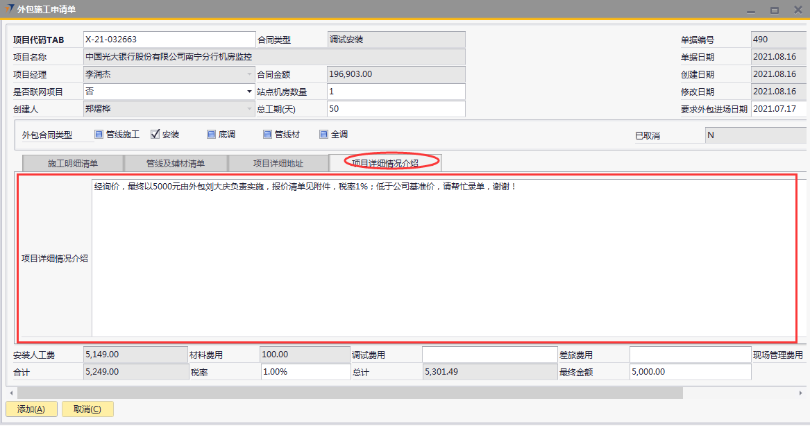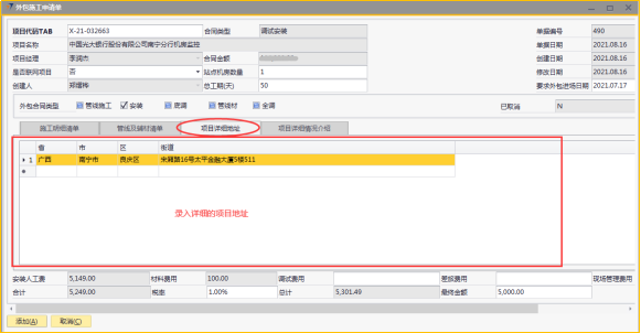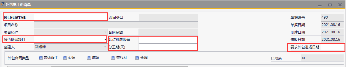 # 1 目的与作用 为了指导和规范工程人员外包施工申请单录入,提升效率,规范管理 # 2 界面介绍 路径:工程项目管理 → 外包施工申请单  # 3 操作说明 ## 3.1 表头  说明: * + **项目编号:**必填,按Tab选择,外包施工申请的项目 + **项目经理:**必填,负责本项目的项目经理 + **是否联网项目:**选填,项目是否是联网项目 + **站点机房数量:**选填,项目站点机房数量 + **总工期(天):**必填,外包施工总工期,按天计算 + **要求外包进场日期:**必填,要求外包商进场的时间 + **项目名称、项目经理、合同类型、合同金额、单据日期、已取消:**系统默认自动带出,不能录入也不能修改 ## 3.2 表体 ### 3.2.1 施工明细清单 表头信息选择后,本页签内容会自动填充(项目如果有销售订单,填充内容是销售订单明细行+变更单明细行;项目如果只有未签合同先发货,填充内容是未签合同先发货明细行+变更单明细行),可手动调整  说明: * + **设备代码:**选填,如果是系统设备,按Tab选择 + **设备名称:**必填,如果选择系统设备,设备名称会自动带出;如果不是系统设备,手动录入设备名称 + **型号:**选填,如果选择系统设备,设备型号会自动带出;如果不是系统设备,手动录入设备型号 + **单位:**选填,如果选择系统设备,单位会自动带出;如果不是系统设备,手动录入单位 + **数量:**必填,需要的设备数量 + **安装单价:**必填,设备安装单价 + **安装小计:**等于安装单价*数量 + 价格上限:如果是系统设备,会自动带出,不能录入也不能修改 + **备注:**要说明的相关事项 ### 3.2.2 管线及辅材清单  说明: * + **设备代码:**选填,如果是系统设备,按Tab选择 + **设备名称:**必填,如果选择系统设备,设备名称会自动带出;如果不是系统设备,手动录入设备名称 + **型号:**选填,如果选择系统设备,设备型号会自动带出;如果不是系统设备,手动录入设备型号 + **品牌:**选填,如果选择系统设备,品牌会自动带出;如果不是系统设备,手动录入品牌 + **单位:**选填,如果选择系统设备,单位会自动带出;如果不是系统设备,手动录入单位 + **数量:**必填,需要的设备数量 + **单价:**必填,设备单价 + **小计:**等于单价*数量 + 价格上限:如果是系统设备,会自动带出,不能录入也不能修改 + **备注:**要说明的相关事项 ### 3.2.3 项目详细地址  说明: * + **省:**必填,选择项目所在省 + **市:**必填,选择项目所在市 + **区:**选填,录入项目所在区 + **街道:**选填,录入项目所在街道 ### 3.2.4 项目详细情况介绍  说明: * + **项目详细情况介绍:**必填,录入项目详细情况介绍 ### 3.2.5 其他  说明: * + **安装人工费:**施工明细清单中安装小计之和,系统自动带出,不能录入也不能修改 + **材料费用:**管线及辅材清单小计之和,系统自动带出,不能录入也不能修改 + **调试费用:**选填,如果有调试费用,手工录入 + **差旅费用:**选填,如果有差旅费用,手工录入 + **现场管理费用:**选填,如果有现场管理费用,手工录入 + **合计:**安装人工费 + 材料费用 + 调试费用 + 差旅费用 + 现场管理费用 + **税率:**选填,手工录入税率 + **总计:**合计* (1+税率) + **最终金额:**选填,外包施工申请单最终金额 ## 3.3 操作步骤 ### 3.3.1 录入表头信息 鼠标定位到项目代码(Tab),再按Tab键,会调取出来当前账号权限范围内所有可做外包施工申请单的项目  关键字搜索或直接鼠标滚动查找本次要立项的项目,双击或左下方选择,选择项目  系统会带出来部分相关信息,手动录入其他需要录入的信息  ### 3.3.2 录入表体信息 #### 3.3.2.1 录入施工明细清单 表头项目信息选择后,施工明细清单会自动填充,如有填充,可手动调整(删行、增行、调整单价、调整数量等),如有需要备注说明的,在备注栏录入  #### 3.3.2.2 录入管线及辅材清单 如果是系统设备,按Tab选择,再录入数量和单价;如果不是系统设备,手动录入设备名称、型号、品牌、数量、单价  #### 3.3.2.3 录入项目详细地址 录入项目的项目地址  #### 3.3.2.4 录入项目详细情况介绍 录入项目详细情况说明  说明: * + Tab出来内容,系统默认申报工时跟有效工时上限一致。如修改,修改时如果申报工时>有效工时上限,需要在备注内说明 #### 3.3.2.5 其他 调试费用、差旅费用、现场管理费用如果有产生,录入 录入税率、最终金额 信息录入完整无误后,点左下方“添加”提交  说明: * + Tab出来内容,系统默认申报工时跟有效工时上限一致。如修改,修改时如果申报工时>有效工时上限,需要在备注内说明 # 4 注意事项 一个项目只允许录入一次外包施工申请单
