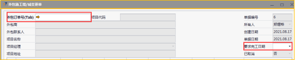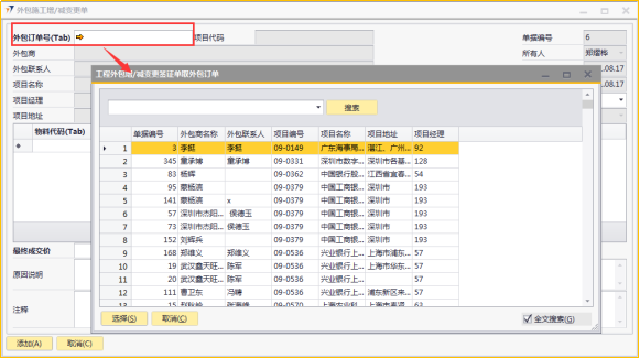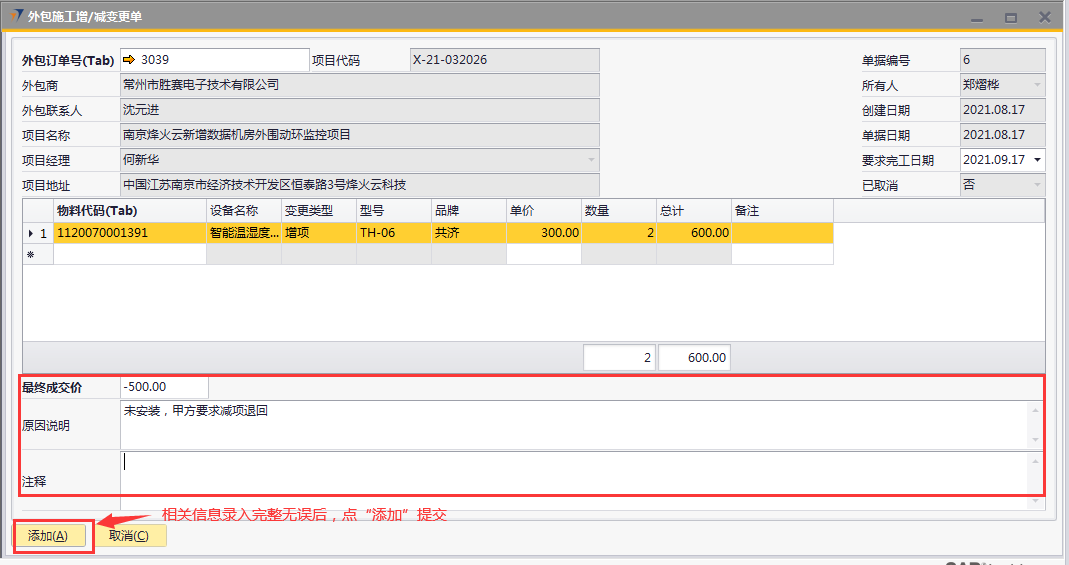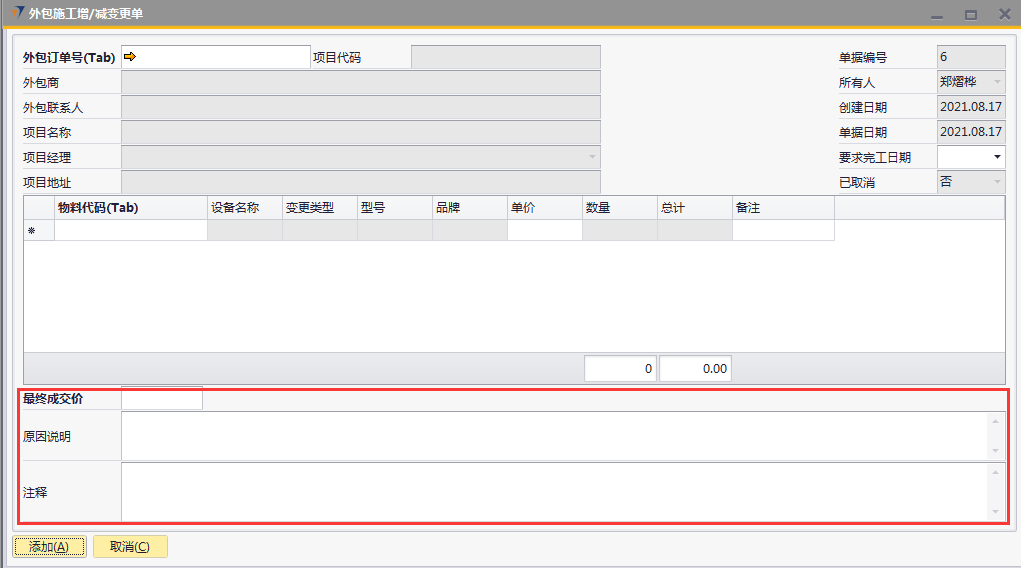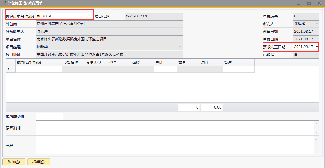 # 1 目的与作用 为了指导和规范工程人员外包施工增减项录入,提升效率,规范管理 # 2 界面介绍 路径:工程项目管理 → 外包施工增/减变更单  # 3 操作说明 ## 3.1 表头  说明: * + **外包订单号:**必填,按Tab选择,要做外包施工增减变更单的项目 + **要求完工日期:**必填,外包增减项要求完工的日期 + **外包商、外包联系人、项目代码、项目名称、项目经理、项目地址、创建日期、单据日期、所有人、已取消:**系统默认自动带出,不能录入也不能修改 ## 3.2 表体 如果只是金额变更,不用录入明细行数据;如果有设备变更,需要录入明细行数据  说明: * + **物料代码:**必填,按Tab选择,选择有外包金额变更的增减项物料 + **单价:**选填,设备单价 + **设备名称、型号、品牌、变更类型、数量:**系统默认自动带出,不能录入也不能修改 ## 3.3 其他  说明: * + **最终成交价:**必填,外包增减项变更最终成交价 + **原因说明:**必填,外包增减项变更原因 + **注释:**选填,需要说明的相关事项 ## 3.4 操作步骤 ### 3.4.1 录入表头信息 鼠标定位到外包订单号(Tab),再按Tab键,会调取出来当前账号权限范围内所有可做外包外包增减项的项目  关键字搜索或直接鼠标滚动查找本次要做外包增减项的项目,双击或左下方选择,选择项目  系统会带出来部分相关信息,手动录入其他需要录入的信息  ### 3.4.2 录入表体信息 鼠标定位到物料代码,按Tab选择,会调出来所有可外包变更设备,选择设备,录入单价,需要说明在备注栏录入内容  ### 3.4.3 录入其他信息 录入最终成交价、原因说明,有其它相关说明的在注释里录入,相关信息录入完整无误后,点“添加”提交  # 4 注意事项 表体物料代码取项目变更单逻辑:物料必须是硬件