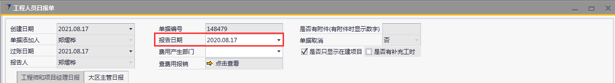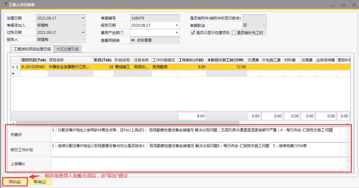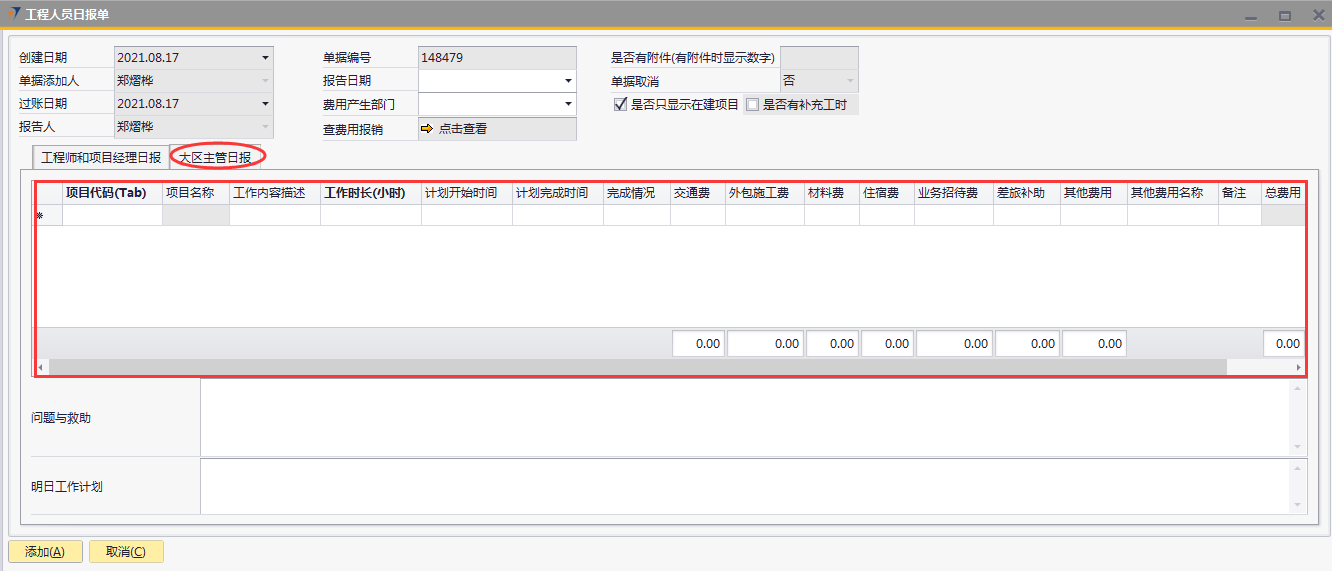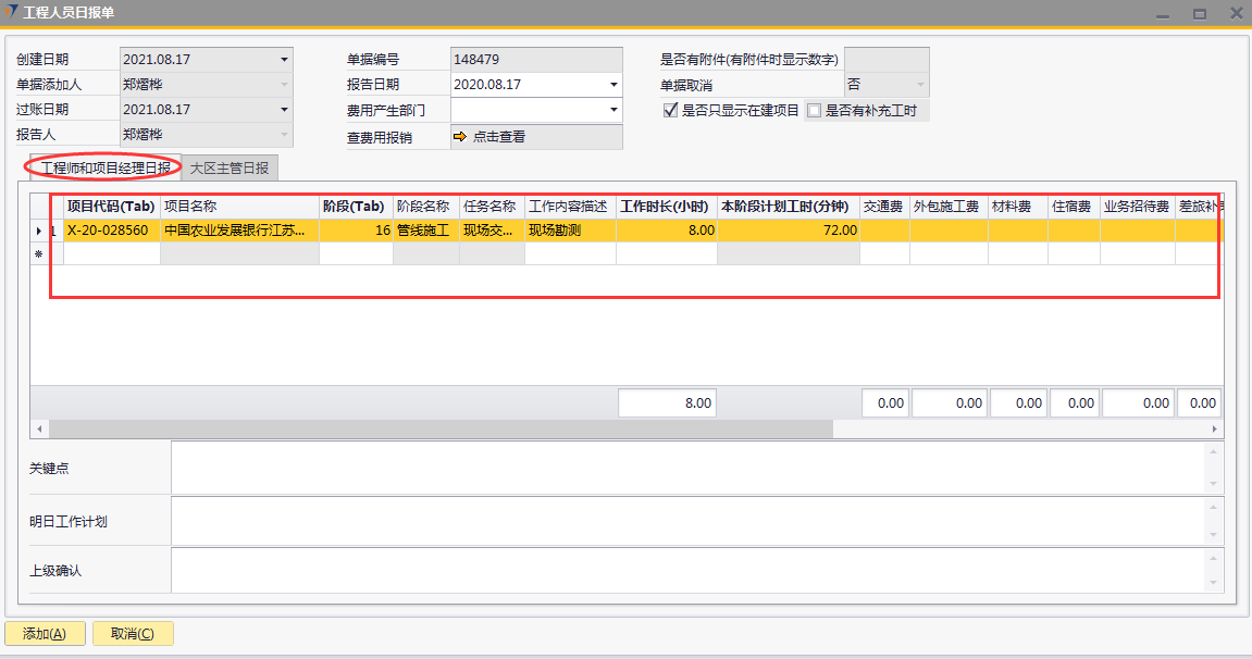 # 1 目的与作用 为了指导和规范工程人员工程日报录入,提升效率,规范管理 # 2 界面介绍 路径:工程项目管理 → 工程人员日报单  # 3 操作说明 ## 3.1 表头  说明: * + **报告日期:**必填,录入报告日期,可录入48小时内的日期 + **费用产生部门:**选填,费用产生部门 + **单据添加人、报告人、过账日期、单据取消:**系统默认自动带出,不能录入也不能修改 ## 3.2 表体 ### 3.2.1 工程师和项目经理日报(工程师、项目经理填写)  说明: * + **项目代码:**必填,按Tab选择,选择跟进项目 + **项目名称:**Tab项目代码时系统自动带出,不能录入也不能修改 + **阶段:**必填,按Tab选择,选择项目所属阶段 + **阶段名称:**Tab阶段时系统自动带出,不能录入也不能修改 + **任务名称:**Tab阶段时系统自动带出,不能录入也不能修改 + **工作内容描述:**必填,当天工作内容描述 + **工作时长(小时):**必填,当天工作时长,小时为单位 + **交通费:**选填,如果有交通费产生,录入 + **外包施工费:**选填,如果有外包施工费产生,录入 + **材料费:**选填,如果有材料费产生,录入 + **住宿费:**选填,如果有住宿费产生,录入 + **业务招待费:**选填,如果有业务招待费产生,录入 + **差旅补助:**选填,如果有差旅补助产生,录入 + **其他费用:**选填,如果有其他费用产生,录入。有其他费用时,其他费用名称一定要录入 + **其他费用名称:**选填,如果有其他费用产生时,必选 + **任务是否完成:**选填,如果当前任务完成,打勾 + **注释:**要说明的相关事项 ### 3.2.2 大区主管日报(大区主管填写)  说明: * + **项目代码:**必填,按Tab选择,选择跟进项目 + **项目名称:**Tab项目代码时系统自动带出,不能录入也不能修改 + **工作内容描述:**必填,当天工作内容描述 + **工作时长(小时):**必填,当天工作时长,小时为单位 + **计划开始时间:**选填,工作计划开始时间 + **计划完成时间:**选填,工作计划完成时间 + **完成情况:**选填,计划工作完成情况 + **交通费:**选填,如果有交通费产生,录入 + **外包施工费:**选填,如果有外包施工费产生,录入 + **材料费:**选填,如果有材料费产生,录入 + **住宿费:**选填,如果有住宿费产生,录入 + **业务招待费:**选填,如果有业务招待费产生,录入 + **差旅补助:**选填,如果有差旅补助产生,录入 + **其他费用:**选填,如果有其他费用产生,录入。有其他费用时,其他费用名称一定要录入 + **其他费用名称:**选填,如果有其他费用产生时,必选 + **备注:**要说明的相关事项 ### 3.2.3 其他  说明: * + **问题与救助:**选填,项目存在的问题与需要的救助 + **明日工作计划:**选填,明日工作计划 ## 3.3 操作步骤 本次以工程师、项目经理录入工程日报为例 ### 3.3.1 录入表头信息 录入报告日期  ### 3.3.2 录入表体信息 鼠标定位到项目代码(Tab),再按Tab键,会调取出来当前账号权限范围内所有可录工程日报的项目  关键字搜索或直接鼠标滚动查找本次要提日报单的项目,双击或左下方选择,选择项目  系统会带出来项目代码和项目名称,鼠标再定位到阶段,按Tab,选择项目目前阶段  选择项目阶段,录入工作内容概述、工作时长、本阶段计划工时、相关费用  ### 3.3.3 录入其他信息 录入关键点、明日工作计划,信息录入完整无误后,点“添加”提交  # 4 注意事项 1. 报告必须在48小时内填写 2. 报告日期不能是明天或明天之后的日期 3. 每天只可以做一次报告,不能重复提交 4. 工作时长(小时)不能大于本阶段计划工时 5. 工作时长不能大于16(小时) 6. 工作内容描述,不能有围标、陪标、替票、无票、发票抵扣报销、送礼、年终奖等词 7. 工程阶段有先后顺序,勾选任务完成时系统会判断前面阶段是否已经完成 8. 工程日报表中勾选任务完成,完成时间会回写到对应工程立项单对应阶段的实际开始日期和实际结束日期,可在工程人员日报更新的阶段有:深化设计、进场验货、管线施工、安装调试、自检、培训。验货、终验(签字)、终验(盖章)阶段只能在项目进度单更新