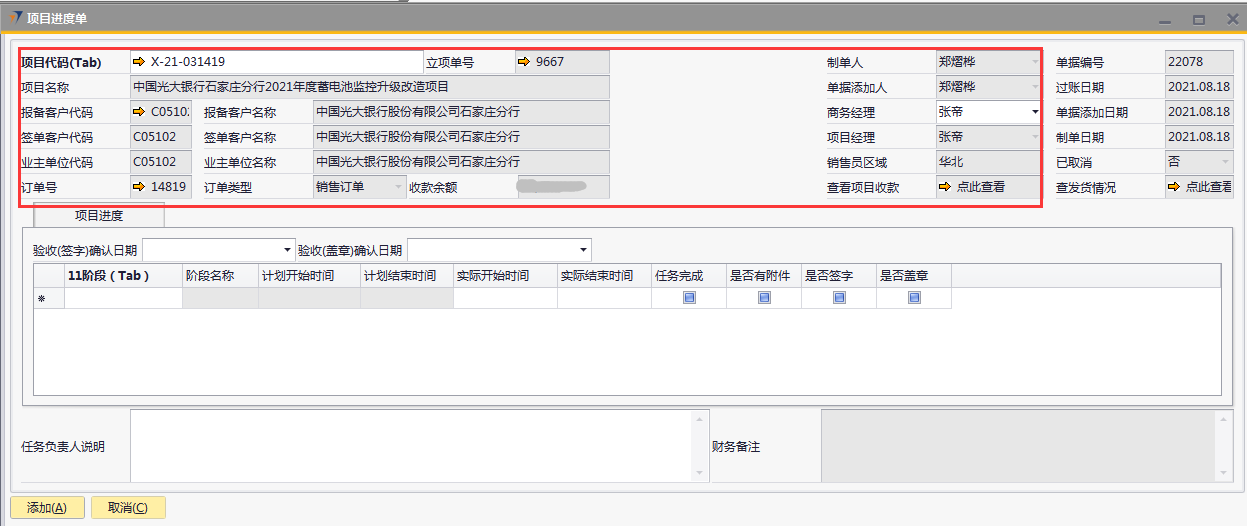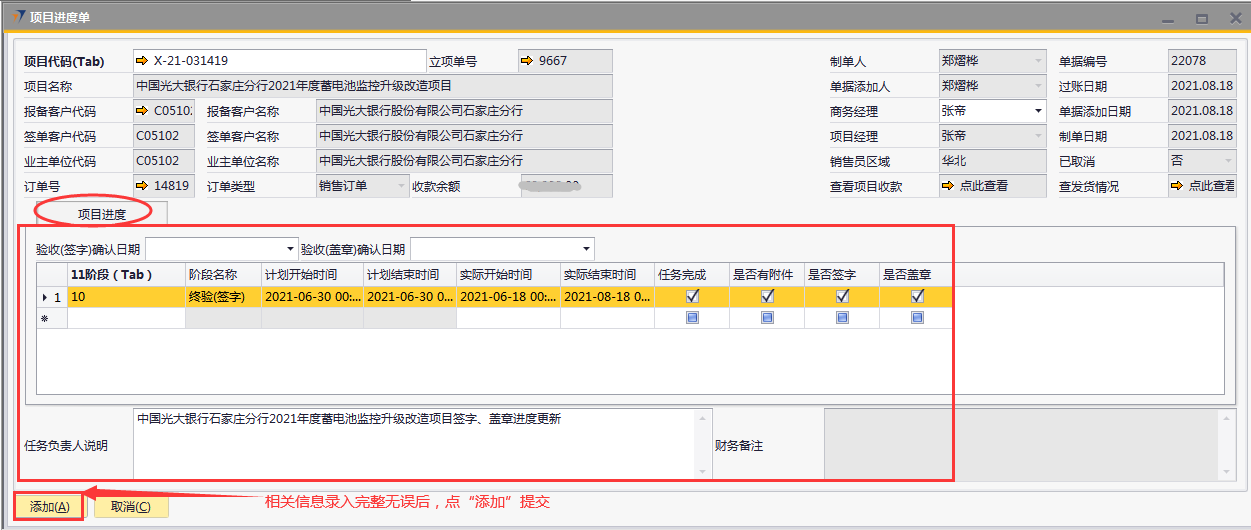 # 1 目的与作用 为了指导和规范工程人员项目进度单录入,提升效率,规范管理 # 2 界面介绍 路径:工程项目管理 → 项目进度单  # 3 操作说明 ## 3.1 表头  说明: * + **项目代码:**必填,按Tab选择,报告进度的项目 + **商务经理:**必填,系统自动带出,可修改 + **项目名称、报备客户代码、报备客户名称、签单客户代码、签单客户名称、业主单位代码、业主单位名称、订单类型、收款余额、项目经理、销售员区域:**系统默认自动带出,不能录入也不能修改 ## 3.2 表体  说明: * + **验收(签字)确认日期:**新建时不录入,财务编辑时录入 + **验收(盖章)确认日期:**新建时不录入,财务编辑时录入 + **阶段:**必填,项目阶段 + **阶段名称、计划开始时间、计划结束时间:**系统自动带出,不能录入也不能修改 + **实际开始时间:**必填,项目对应阶段实际开始时间 + **实际结束时间:**必填,项目对应阶段实际结束时间 + **任务完成:**选填,如果对应阶段任务完成,勾选;未完成,不勾选 + **是否有附件:**选填,如果有附件,勾选;没有附件,不勾选 + **是否签字:**选填,如果有签字,勾选;没有签字,不勾选 + **是否盖章:**选填,如果有盖章,勾选;没有盖章,不勾选 + **任务负责人说明:**选填,任务负责人相关说明 ## 3.3 操作步骤 ### 3.3.1 录入表头信息 鼠标定位到项目代码(Tab),再按Tab键,会调取出来当前账号权限范围内所有可更新进度的项目!  关键字搜索或直接鼠标滚动查找本次要立项的项目,双击或左下方选择,选择项目  系统会带出来相关信息,检查相关信息  ### 3.3.2 录入表体信息 鼠标定位到阶段,按Tab  选择更新进度的阶段,录入实际开始时间、实际结束时间,任务完成、是否有附件、是否有附件、是否签字、是否盖章按实际情况选择是否打勾  # 4 注意事项 1. 实际开始日期、实际结束日期不能大于当天 2. 实际开始日期不能小于实际结束日期 3. 工程阶段有先后顺序,勾选任务完成时系统会判断前面阶段是否已经完成 4. 项目进度中勾选任务完成,完成时间会回写到对应工程立项单对应阶段实际开始日期和实际完成日期,可更新的阶段有:验货、终验(签字)、终验(盖章)阶段。深化设计、进场验货、管线施工、安装调试、自检、培训只能在工程人员日报中更新