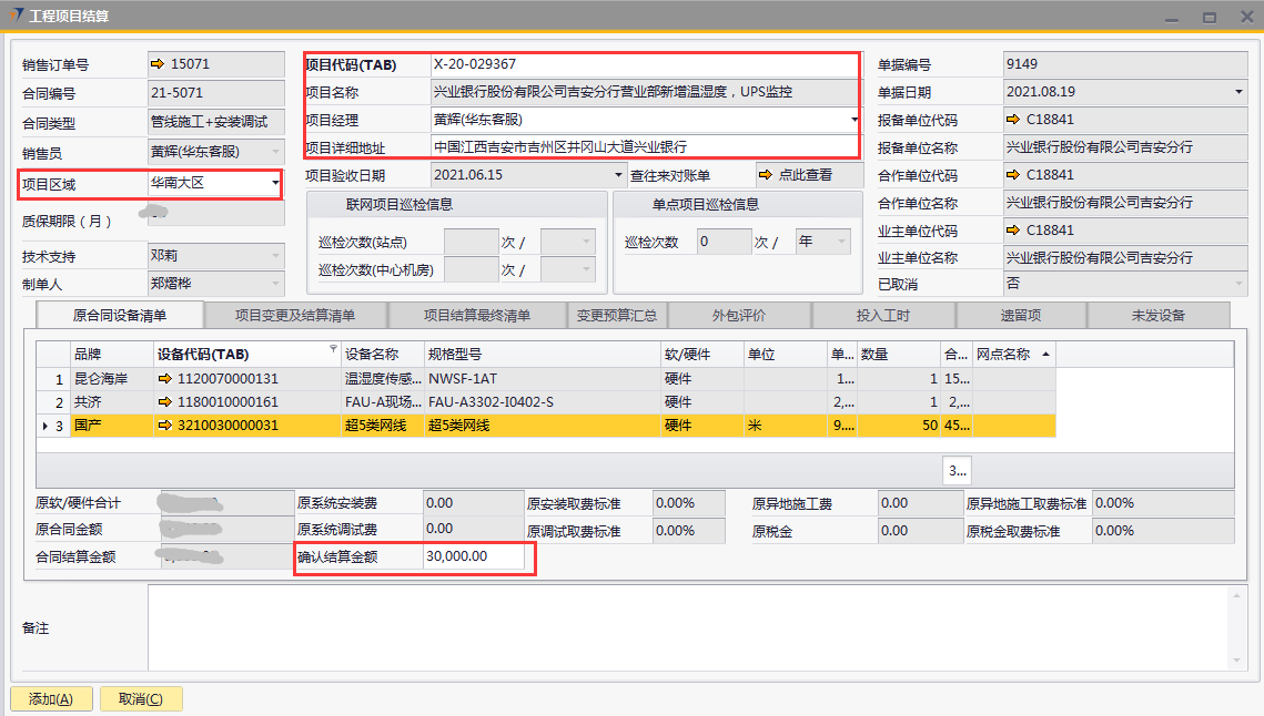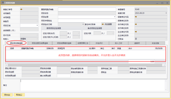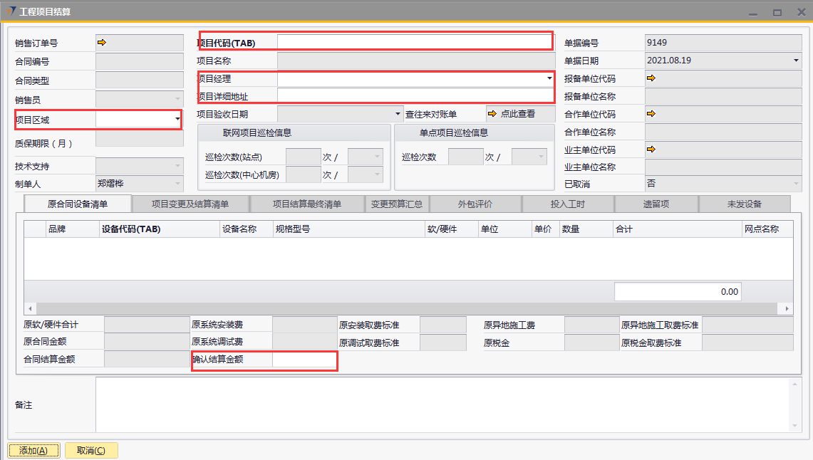 # 1 目的与作用 为了指导和规范工程人员结算项目,提升效率,规范管理 # 2 界面介绍 路径:工程项目管理 → 工程项目结算  # 3 操作说明 ## 3.1 表头  说明: * + **项目代码:**必填,按Tab选择,选择要结算的项目 + **项目经理:**必填,项目的项目经理 + **项目区域:**必填,项目对应区域 + **项目详细地址:**必填,项目的详细地址 + **项目验收日期:**必填,系统默认带出。逻辑为:非买卖合同,项目验收日期为验收日期;买卖合同,项目验收日期为最后一次发货日期+7天 + **确认结算金额:**必填,最终确认的结算金额 + **项目名称、报备单位代码、报务单位名称、合作单位代码、合作单位名称、业主单位代码、业主单位名称、联网项目巡检信息、单点项目巡检信息:**系统默认自动带出,不能录入也不能修改 ## 3.2 表体 ### 3.2.1 原合同设备清单  说明: * + 此页签内容,选择表头项目代码时,会自动填充,不允许录入也不允许修改 ### 3.3.2 项目变更及结算清单  说明: * + 此页签内容,选择表头项目代码时,会自动填充,不允许录入也不允许修改 ### 3.2.3 项目结算最终清单  说明: * + 此页签内容,选择表头项目代码时,会自动填充,不允许录入也不允许修改 ### 3.2.4 变更预算汇总  说明: * + 此页签内容,选择表头项目代码时,会自动计算和填充,不允许录入也不允许修改 ### 3.2.5 外包评价  说明: * + 此页签内容,选择表头项目代码时,会自动填充,不允许录入也不允许修改 ### 3.2.6 投入工时  说明: * + 此页签内容,选择表头项目代码时,会自动填充,不允许录入也不允许修改 ### 3.2.7 遗留项 如果做结算时,有遗留项后续需要处理,请在遗留项这里录入相关内容  说明: * + **遗留问题:**必填,遗留问题描述 + **原因:**必填,外包增减项变更原因 + **预计产生工时:**选填,处理遗留问题预计产生的工时 + **预计产生费用:**选填,处理遗留问题预计产生的费用 + **备注:**需要说明的情况 ### 3.2.8 未发设备 如果做结算时,如果还有设备未发,系统会自动带过来 是否要发货、备注可修改,其它字段不能修改  说明: * + **设备代码:**还没发完的设备 + **设备名称、描述、数量:**系统自动带过来,不能录入也不能修改 + **是否要发货:**如果需要发货,打勾;不需要发货,不打勾 + **备注:**其他相关说明 ## 3.3 操作步骤 本次以项目有遗留项、有未发设备后续需要发货为例 ### 3.3.1 录入表头信息 鼠标定位到外包订单号(Tab),再按Tab键,会调取出来当前账号权限范围内所有可结算的项目  关键字搜索或直接鼠标滚动查找本次要结算的项目,双击或左下方选择,选择项目  系统会带出来相关信息,手动录入项目区域、项目详细地址、确认结算金额  ### 3.3.2 录入表体信息 表头项目选择后,原合同设备清单、项目变更及结算清单、项目结算最终清单、变更预算汇总、外包评价、投入工时、未发设备这几个页签会自动填充 录入遗留项  如果还有未发设备后续需要发货,需要将未发设备页签里**是否要发货**打上勾 所有信息录入完整无误后,点“添加”提交  # 4 注意事项 1. 有验收进度的项目才允许结算 2. 一个项目只允许结算一次 3. 只有项目经理才能做项目结算单,现场工程师暂时无权做项目结算单