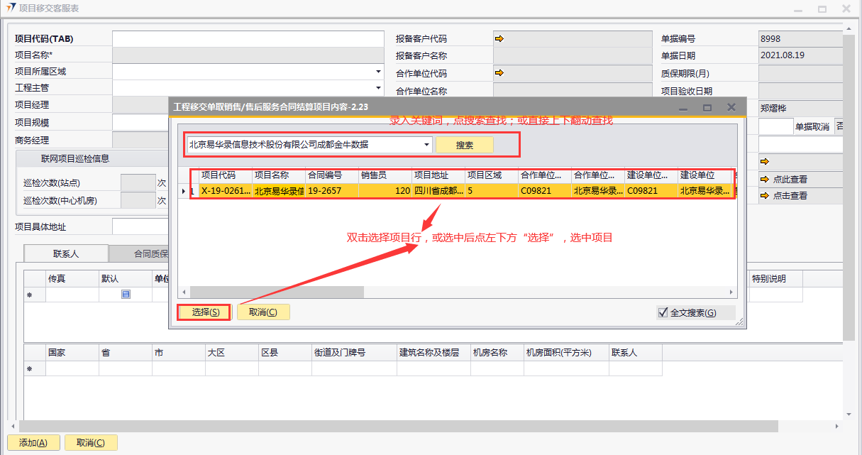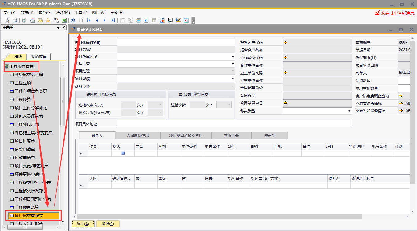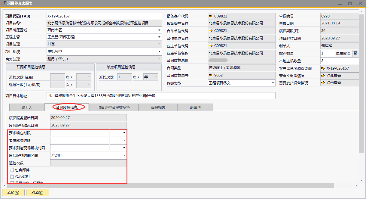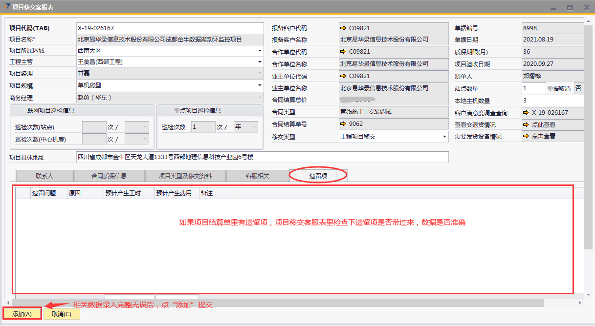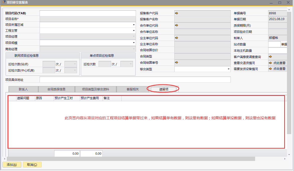 # 1 目的与作用 为了指导和规范工程人员已结算项目移交给售后,提升效率,规范管理 # 2 界面介绍 路径:工程项目管理 → 项目移交客服表  # 3 操作说明 ## 3.1 表头  说明: * + **项目代码:**必填,按Tab选择,要移交售后的项目 + **项目所属于区域:**必填,项目所属区域 + **工程主管:**选填,如果不是买卖合同一定要录入工程主管 + **项目规模:**必填,项目规模 + **移交类型:**必填,项目移交类型 + **项目具体地址:**必填,项目具体地址 + **站点数量:**选填,项目站点总数 + **本地主机数量:**选填,本地主机总数 + **项目名称、项目经理、报备客户代码、报备客户名称、合作单位代码、合作单位名称、业主单位代码、业主单位名称、合同结算总价、合同类型、质保期限、项目验收日期、联网项目巡检信息、单点项目巡检信息:**系统默认自动带出,不能录入也不能修改 ## 3.2 表体 ## 3.2.1 联系人  说明: * + **单位类型:**必填,按Tab选择,选择联系人行 + **单位名称:**必填,Tab时会自动带出,联系人单位名称 + **姓名:**必填,Tab时会自动带出,联系人姓名 + **性别:**必填,Tab时会自动带出,联系人性别 + **部门:**必填,Tab时会自动带出,联系人部门 + **职务:**必填,Tab时会自动带出,联系人职务 + **手机:**必填,Tab时会自动带出,联系人手机 + **座机:**选填,Tab时会自动带出,联系人座机,可修改 + **邮件:**选填,Tab时会自动带出,联系人座机,可修改 + **机房名称:**必填,填写项目机房名称 + **备注:**选填,需要说明的相关事项 + **特别说明:**选填,需要特别说明的事项 + **国家:**必填,外包增减项变更最终成交价 + **省:**必填,外包增减项变更原因 + **市:**必填,项目所属市区 + **大区:**必填,项目所属大区 + **区县:**必填,项目所属区县 + **街道及门牌号:**必填,项目所属街道及门牌号 + **建筑名称及楼层:**必填,项目所在建筑名称和楼层 + **机房名称:**必填,项目机房名称 + **机房面积(平方米):**项目机房面积,以平方米为单位 + **联系人:**必填,机房联系人姓名 ## 3.2.2 合同质保信息  说明: * + **要求响应时限:**选填,要求响应时限 + **要求解决时限:**选填,要求解决时限 + **要求到达现场解决时限:**选填,要求到达现场时限 + **质保服务时间区间:**选填,质保服务时间区间 + **巡检次数:**选填,按实际情况填写 ## 3.2.3 项目类型及移交资料 项目移交资料  说明: 如果有移交资料,需要录入 * + **内容类型:**必填,按Tab选择移交资料类型 + **存放介质:**必填,选择内容类型时会自动带出,可修改 + **存放路径:**选填,存放的路径 + **补充说明:**选填,需要说明的相关事项 + **移交内容、移交标准、大类、备注:**选择内容类型时会自动带出,不能录入也不能修改 项目类型  说明: * + **项目类型:**选填,直接选择 + **备注:**需要说明的相关事项 ## 3.2.4 客服相关  说明: * + **客服专员:**必填,移交售后所属大区客服专员 + **资料存放位置:**选填,资料存放位置 ## 3.2.5 遗留项  说明: * + 此页签内容从项目对应的工程项目结算单带过来,如果结算单有数据,则这里会相应数据;如果结算单没数据,则这里也没有数据 ## 3.3 操作步骤 ### 3.3.1 录入表头信息 鼠标定位到项目代码(TAB),再按Tab键,会调取出来当前账号权限范围内所有可做移交的项目  关键字搜索或直接鼠标滚动查找本次要移交的项目,双击或左下方选择,选择项目  系统会带出来部分相关信息,手动录入工程主管、项目规模、移交类型  ### 3.3.2 录入表体信息 #### 3.3.2.1 录入联系人信息 鼠标定位到单位名称,按Tab选择,会调出来所有联系人相关信息  选择联系人,录入机房名称相关信息 录入国家、省、市、大区、区县、街道及门牌号、建筑名称及楼层、机房名称、机房面积、联系人相关信息  #### 3.3.2.2 录入合同质保信息  #### 3.3.2.3 录入项目类型及移交资料 鼠标定位到内容类型,按Tab选择移交资料内容,需要补充说明的,在补充说明字段录入  #### 3.3.2.4 录入客服相关 录入客服专员、资料存放位置  #### 3.3.2.5 遗留项检查 如果项目结算单里有遗留项,项目移交客服表里检查下遗留项是否带过来,数据是否准确 相关数据录入完整无误后,点左下方“添加”提交  # 4 注意事项 1. 只有有工程结算单的项目才能做项目移交客服表 2. 一个项目只允许做一次项目移交客服表