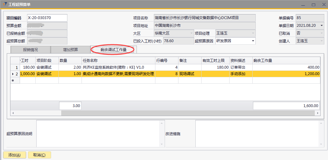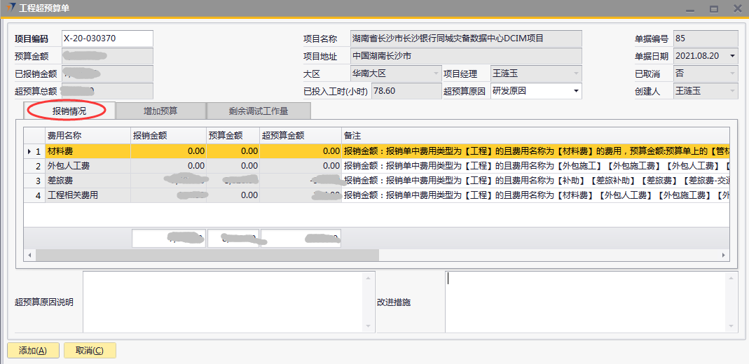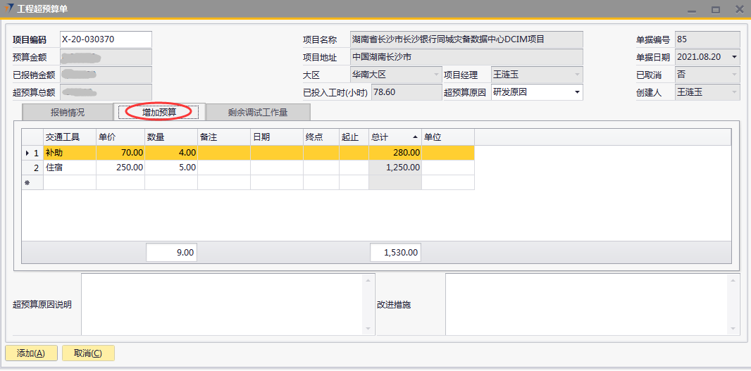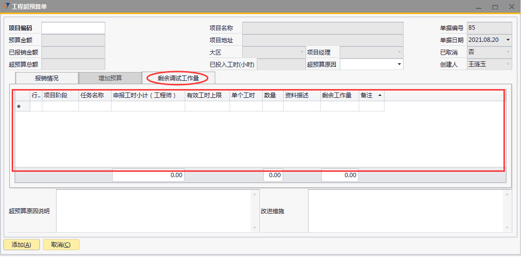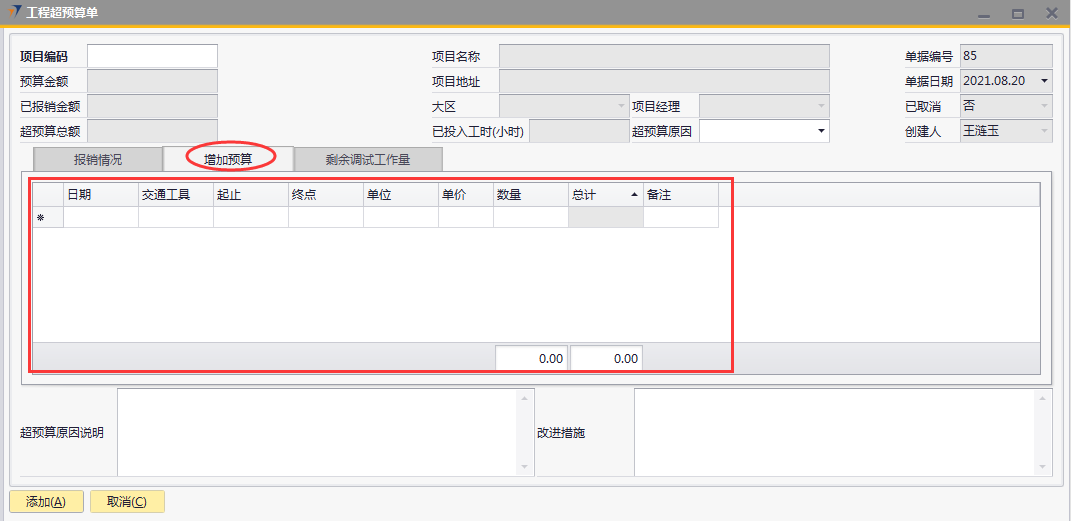 # 1 目的与作用 为了指导和规范工程人员工程超预算单录入,提升效率,规范管理 本单主要作用:自定义费用报销有超预算时,有工程超预算单可以关联,否则不允许提交自定义费用报销 # 2 界面介绍 路径:工程项目管理 → 工程超预算单  # 3 操作说明 ## 3.1 表头  说明: * + **项目代码:**必填,按Tab选择,费用超预算的项目 + **超预算原因:**必填,费用超预算的原因 + **项目名称、项目地址、项目经理、大区、预算金额、已报销金额、超预算总额:**选择项目编号后,系统默认自动带出,不能录入也不能修改 ## 3.2 表体 ### 3.2.1 报销情况 此页签内容在选择项目编号后会自动填充,不允许增加也不允许删除  说明: * + **费用名称:**必填,表头项目编码选择后,费用名称会自动填充 + **报销金额:**必填,表头项目编码选择后,报销金额会自动填充 + **预算金额:**必填,表头项目编码选择后,预算金额会自动填充 + **超预算金额:**必填,表头项目编码选择后,超预算金额会自动填充 + **备注:**必填,费用名称的说明,表头项目编码选择后,备注会自动填充 ### 3.2.2 增加预算  说明: * + **日期:**选填,预算发生日期 + **交通工具:**必填,出行交通工具 + **起止:**选填,从哪 + **终点:**选填,到哪 + **单位:**选填,交通工具单位 + **单价:**必填,搭乘交通工具单价 + **数量:**必填,需要的数量 + **总计:**必填,=单价*数量 + **备注:**选填,其他相关说明 ### 3.2.3 剩余调试工作量 此页签内容在选择项目编号后会自动填充,可手动增加删除修改  说明: * + **项目阶段:**必填,表头项目编码选择后,项目阶段自动填充 + **任务名称:**必填,表头项目编码选择后,任务名称自动填充 + **申报工时小计:**选填,表头项目编码选择后,申报工时小计自动填充 + **有效工时上限:**选填,表头项目编码选择后,有效工时上限自动填充 + **单个工时:**表头项目编码选择后,单个工时自动填充 + **数量:**表头项目编码选择后,数量自动填充 + **资料描述:**表头项目编码选择后,资料描述自动填充 + **剩余工作量:**表头项目编码选择后,剩余工作量自动填充 + **备注:**其他相关说明 ### 3.2.4 其他  说明: * + **超预算原因说明:**必填,项目超预算原因详细说明 + **改进措施:**选填,项目可以改进的措施 ## 3.3 操作步骤 ### 3.3.1 录入表头信息 鼠标定位到项目代码(TAB),再按Tab键,会调取出来当前账号权限范围内所有可做超预算单的项目  关键字搜索或直接鼠标滚动查找本次要移交的项目,双击或左下方选择,选择项目  系统会带出来相关信息,手动录入超预算原因  ### 3.3.2 录入表体信息 #### 3.3.2.1 检查报销情况 表头项目代码选择后,报销情况明细会自动填充,检查报销情况  #### 3.3.2.2 录入增加预算 录入增加预算明细行数据  #### 3.3.2.3 检查剩余调试工作量 表头项目代码选择后,报销情况明细会自动填充,检查报销情况 如果需要修改,可修改  #### 3.3.2.4 录入其他 录入超预算原因说明、改进措施,所有信息录入完整无误后,点“添加”提交  # 4 注意事项 一个项目只允许做一次工程超预算单