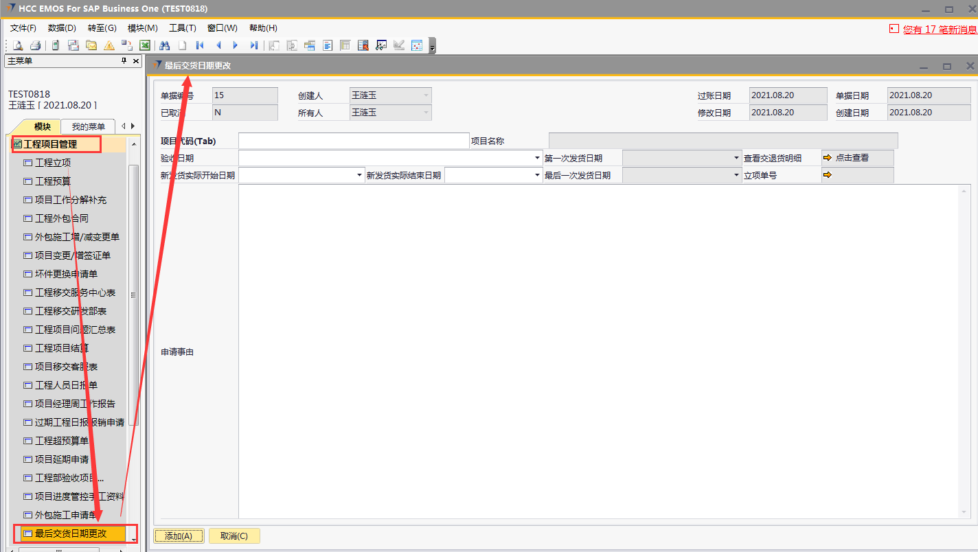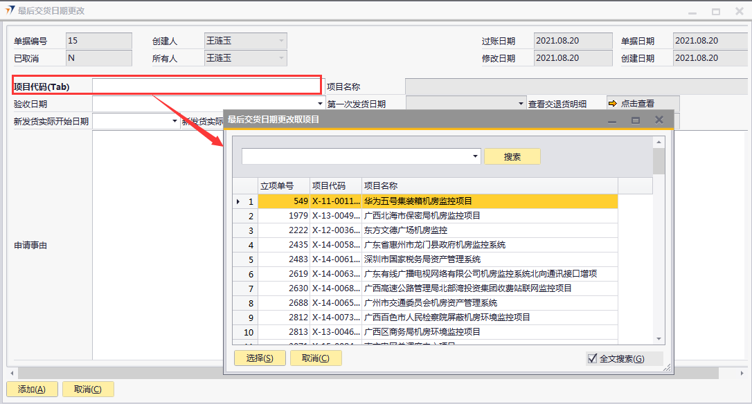 # 1 目的与作用 为了指导和规范工程人员最后交货日期更改,提升效率,规范管理 # 2 界面介绍 路径:工程项目管理 → 最后交货日期更改  # 3 操作说明 ## 3.1 表单  说明: * + **项目代码:**必填,按Tab选择,要更新发货日期的项目 + **验收日期:**选填,项目已经验收的日期 + **新发货实际开始日期:**必填,新的发货实际开始日期 + **新发货实际结束日期:**必填,新的发货实际结束日期 + **项目名称、第一次发货日期、最后一次发货日期、立项单号:**选择项目代码后,系统默认自动带出,不能录入也不能修改 + **申请事由:**必填,申请更改最后交货日期的原因 ## 3.2 操作说明 鼠标定位到项目代码(Tab),再按Tab键,会调取出来当前账号权限范围内所有可更新交货日期的项目  关键字搜索或直接鼠标滚动查找本次要更新的项目,双击或左下方选择,选择项目  系统会出来相关信息,录入新发货实际开始日期、新发货实际结束日期,申请事由,全部信息录入完整无误后,点“添加”提交  # 4 注意事项 无
