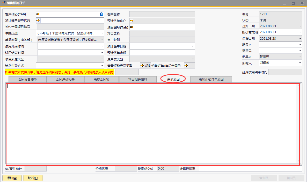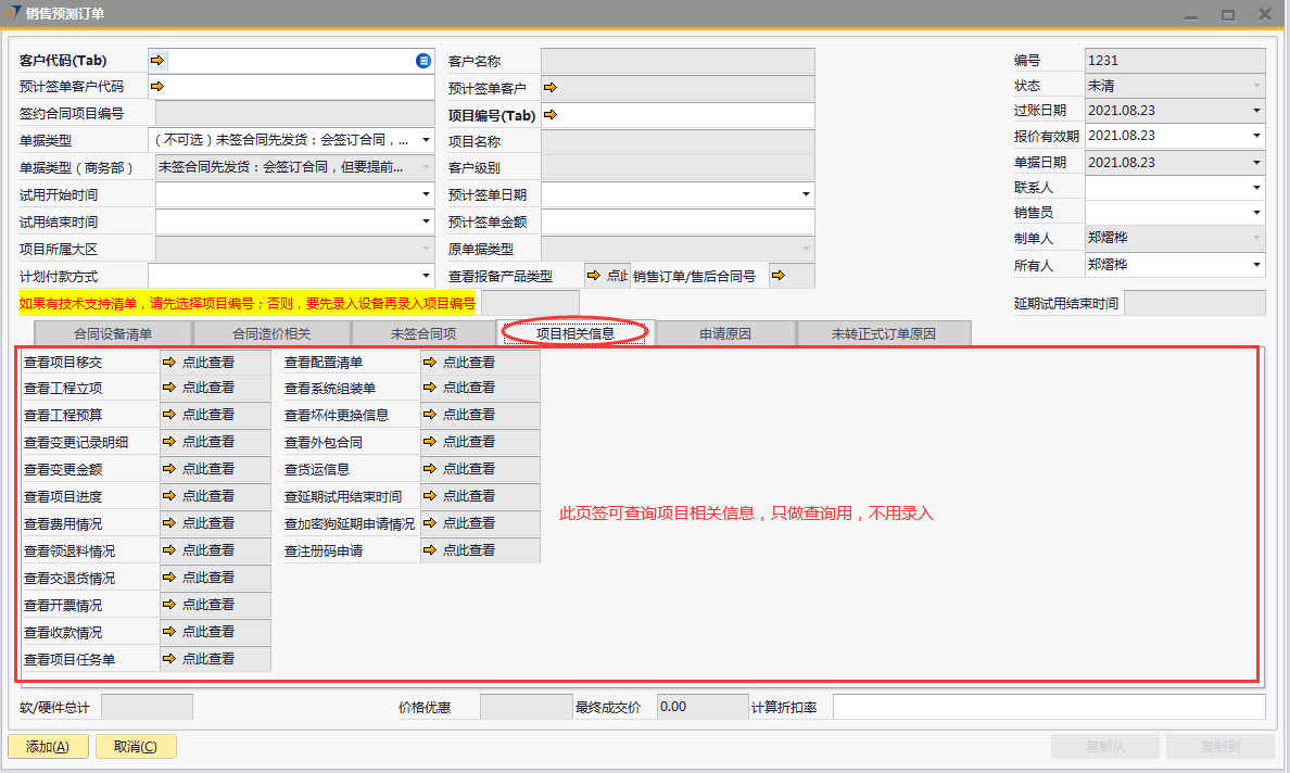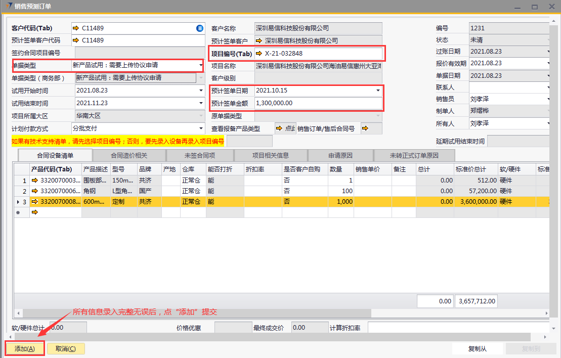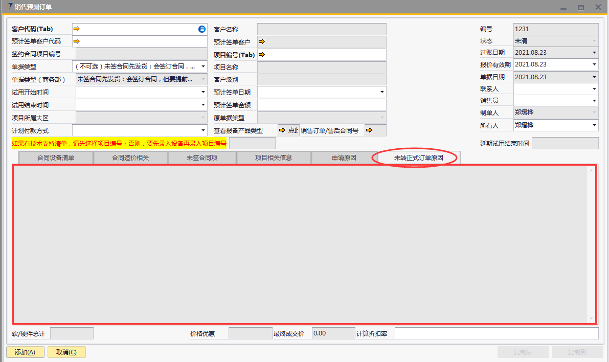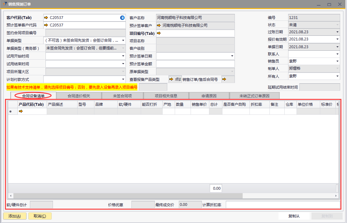 # 1 目的与作用 为了指导和规范销售、客服人员销售预测订单录入,提升效率,规范管理 # 2 界面介绍 路径:销售应收管理 → 销售预测订单  # 3 操作说明 ## 3.1 表头  说明: * + **客户代码:**必填,按Tab选择,报备客户代码。必须先录入客户代码,才能添加合同设备清单,才能调取到客户对应报备的项目代码和相关信息 + **预计签单客户代码:**必填,按Tab选择,预计签单客户代码 + **项目代码:**必填,按Tab选择,系统会读取出销售预测单所录客户报备的且没有销售订单的所有项目 + **单据类型:**必填,按实际情况选择,不要选择有“不可选”三个字的单据类型 + **单据类型(商务部):**必填,跟单据类型一致,选择单据类型时系统会自动刷新过来 + **试用开始时间:**必填,设备试用开始时间 + **试用结束时间:**必填,设备试用结束时间 + **预计签单日期:**必填,项目预计签单日期,选择项目编码后,系统默认自动带出,可修改 + **预计签单金额:**必填,项目预计签单金额,选择项目编码后,系统默认自动带出,可修改 + **计划付款方式:**必填,项目计划付款方式 + **报价有效期:**选填,报价有效期 + **销售员:**必填,项目对应销售经理,销售员必须跟所有人一致 + **所有人:**必填,项目对应所有人,所有人必须跟销售员一致 + **客户名称、预计签单客户、项目名称、项目所属大区:**选择项目编码后,系统默认自动带出,不能录入也不能修改 ## 3.2 表体 ### 3.2.1 合同设备清单  说明: * + **产品代码:**必填,按Tab选择,选择坏件设备代码 + **软/硬件:**必填,选择产品代码后,系统默认自动带出,不能录入也不能修改 + **能否打折:**必填,选择产品代码后,系统默认自动带出,不能录入也不能修改 + **数量:**必填,需要数量 + **销售单价:**选填,销售价格,销售预测订单中销售单价没有实际参考意义 + **总计:**必填,= 数量 *销售单价 + **是否客户自购:**选填,是否客户自购,默认为**否** + **折扣率:**选填,产品折扣率 + **仓库:**必填,设备所在仓库,默认为**正常仓** + **备注:**选填,需要说明的事项 + **产品描述、型号、品牌、单位价格、标准价、标准价总计:**选择产品代码后,系统默认自动带出,不能录入也不能修改 + **软/硬件总计:**系统自动计算,不能录入也不能修改 + **价格优惠:**系统自动计算,不能录入也不能修改 + **最终成交价:**系统自动计算,不能录入也不能修改 + **计算折扣率:**选填,折扣率 ### 3.2.2 合同造价相关  说明: * + 此页签内容没有实际参考意义,可暂时不用理会 ### 3.2.3 未签合同项  说明: * + **合同领域类别:**必填,选择合同领域类别 + **项目地点:**必填,录入项目地点 + **收货人:**必填,录入收货人姓名 + **到货地址:**必填,录入到货地址 + **发包单位:**必填,录入发包单位名称 + **开发项:**选填,是否有开发项,默认为无 + **收货人联系电话:**必填,收货人联系电话 ### 3.2.4 项目相关信息  说明: * + 此页签可查看项目相关信息,只做查询用,不用录入 ### 3.2.5 申请原因  说明: * + **申请原因:**必填,申请走销售预测订单的原因 ### 3.2.6 未转正式订单原因  说明: * + 此页签内容由市场部陈佳维护,新建时,不允许录入 ## 3.3 操作步骤 如果有技术支持清单,请先选择项目编号,再录入明细行 如果没有技术支持清单,请先录入明细行设备,再选项目编号 必须先录入客户代码,才能增加明细行,才能选择项目 本次以项目没有技术支持请单为例 ### 3.3.1 录入表头客户代码等信息 鼠标定位到**客户代码(Tab)**,再按Tab键,会调取出来当前账号权限范围内所有客户信息  关键字搜索或直接鼠标滚动查找本次要做预测订单的客户,双击或左下方选择,选择客户,录入试用开始时间、试用结束时间、计划付款方式  ### 3.3.2 录入表体信息 #### 3.3.2.1 合同设备清单 鼠标定位到产品代码,按Tab选择,选择要发货的设备,录入数量  #### 3.3.2.2 合同设备清单 录入合同领域类别、项目地点、收货人、到货地址、发包单位、收货人联系电话  #### 3.3.2.3 申请原因 录入申请原因  ### 3.3.3 录入表头项目代码等信息 鼠标定位到**项目编号**,将出来客户相关联的还没有销售订单的新项目报备项目  选择本次预测订单项目,系统会自动带过来预计签单日期、预计签单金额,录入单据类型,所有信息录入完整无误后,点“添加”提交  # 4 注意事项 无