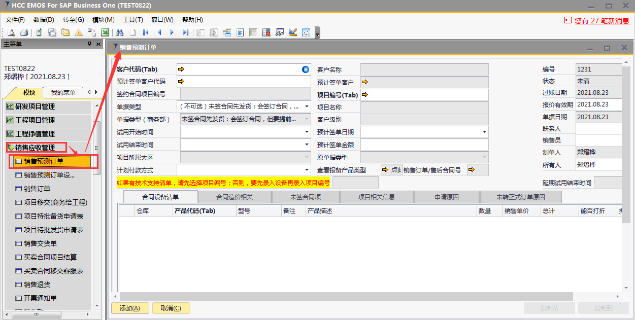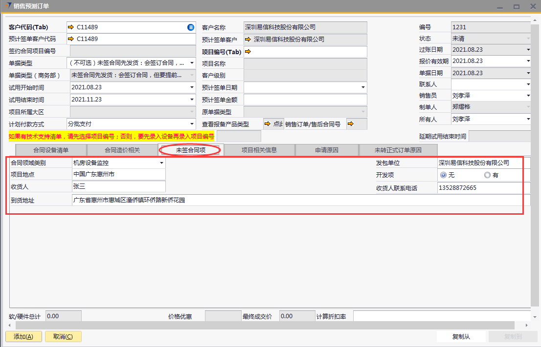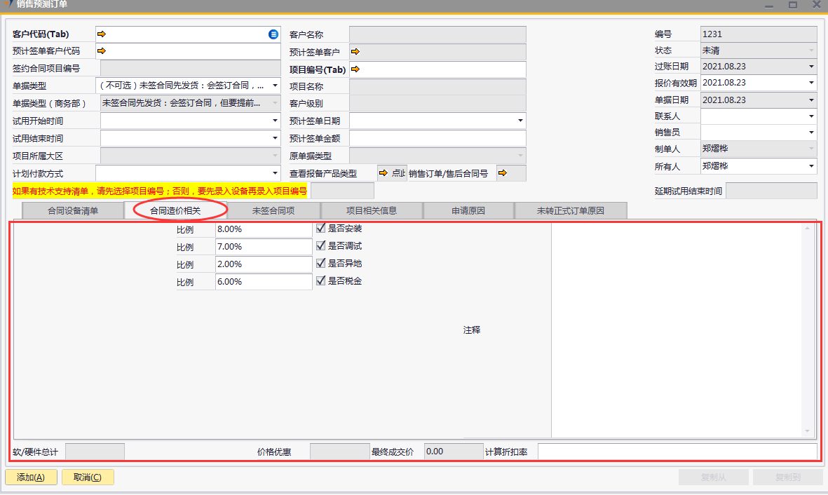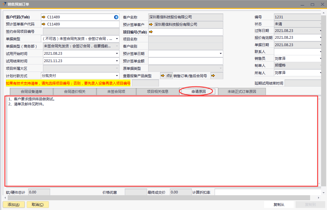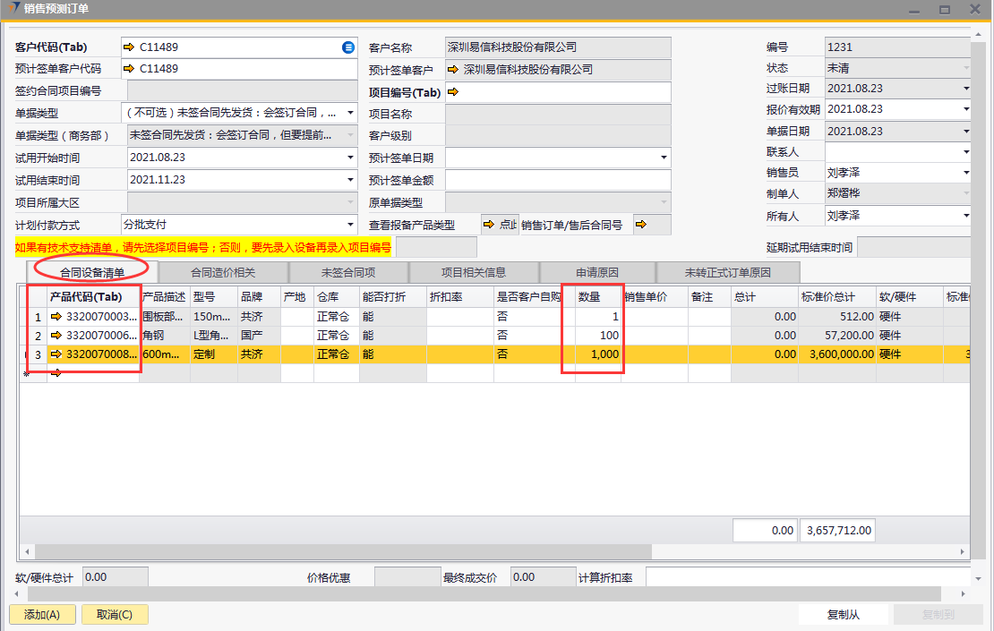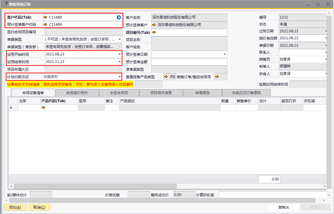 # 1 目的与作用 为了指导和规范销售、客服人员销售预测订单录入,提升效率,规范管理 # 2 界面介绍 路径:销售应收管理 → 销售预测订单  # 3 操作说明 ## 3.1 表头  说明: * + **客户代码:**必填,按Tab选择,报备客户代码。必须先录入客户代码,才能添加合同设备清单,才能调取到客户对应报备的项目代码和相关信息 + **预计签单客户代码:**必填,按Tab选择,预计签单客户代码 + **项目代码:**必填,按Tab选择,系统会读取出销售预测单所录客户报备的且没有销售订单的所有项目 + **单据类型:**必填,按实际情况选择,不要选择有“不可选”三个字的单据类型 + **单据类型(商务部):**必填,跟单据类型一致,选择单据类型时系统会自动刷新过来 + **试用开始时间:**必填,设备试用开始时间 + **试用结束时间:**必填,设备试用结束时间 + **预计签单日期:**必填,项目预计签单日期,选择项目编码后,系统默认自动带出,可修改 + **预计签单金额:**必填,项目预计签单金额,选择项目编码后,系统默认自动带出,可修改 + **计划付款方式:**必填,项目计划付款方式 + **报价有效期:**选填,报价有效期 + **销售员:**必填,项目对应销售经理,销售员必须跟所有人一致 + **所有人:**必填,项目对应所有人,所有人必须跟销售员一致 + **客户名称、预计签单客户、项目名称、项目所属大区:**选择项目编码后,系统默认自动带出,不能录入也不能修改 ## 3.2 表体 ### 3.2.1 合同设备清单  说明: * + **产品代码:**必填,按Tab选择,选择坏件设备代码 + **软/硬件:**必填,选择产品代码后,系统默认自动带出,不能录入也不能修改 + **能否打折:**必填,选择产品代码后,系统默认自动带出,不能录入也不能修改 + **数量:**必填,需要数量 + **销售单价:**选填,销售价格,销售预测订单中销售单价没有实际参考意义 + **总计:**必填,= 数量 *销售单价 + **是否客户自购:**选填,是否客户自购,默认为**否** + **折扣率:**选填,产品折扣率 + **仓库:**必填,设备所在仓库,默认为**正常仓** + **备注:**选填,需要说明的事项 + **产品描述、型号、品牌、单位价格、标准价、标准价总计:**选择产品代码后,系统默认自动带出,不能录入也不能修改 + **软/硬件总计:**系统自动计算,不能录入也不能修改 + **价格优惠:**系统自动计算,不能录入也不能修改 + **最终成交价:**系统自动计算,不能录入也不能修改 + **计算折扣率:**选填,折扣率 ### 3.2.2 合同造价相关  说明: * + 此页签内容没有实际参考意义,可暂时不用理会 ### 3.2.3 未签合同项  说明: * + **合同领域类别:**必填,选择合同领域类别 + **项目地点:**必填,录入项目地点 + **收货人:**必填,录入收货人姓名 + **到货地址:**必填,录入到货地址 + **发包单位:**必填,录入发包单位名称 + **开发项:**选填,是否有开发项,默认为无 + **收货人联系电话:**必填,收货人联系电话 ### 3.2.4 项目相关信息  说明: * + 此页签可查看项目相关信息,只做查询用,不用录入 ### 3.2.5 申请原因  说明: * + **申请原因:**必填,申请走销售预测订单的原因 ### 3.2.6 未转正式订单原因  说明: * + 此页签内容由市场部陈佳维护,新建时,不允许录入 ## 3.3 操作步骤 如果有技术支持清单,请先选择项目编号,再录入明细行 如果没有技术支持清单,请先录入明细行设备,再选项目编号 必须先录入客户代码,才能增加明细行,才能选择项目 本次以项目没有技术支持请单为例 ### 3.3.1 录入表头客户代码等信息 鼠标定位到**客户代码(Tab)**,再按Tab键,会调取出来当前账号权限范围内所有客户信息  关键字搜索或直接鼠标滚动查找本次要做预测订单的客户,双击或左下方选择,选择客户,录入试用开始时间、试用结束时间、计划付款方式  ### 3.3.2 录入表体信息 #### 3.3.2.1 合同设备清单 鼠标定位到产品代码,按Tab选择,选择要发货的设备,录入数量  #### 3.3.2.2 合同设备清单 录入合同领域类别、项目地点、收货人、到货地址、发包单位、收货人联系电话  #### 3.3.2.3 申请原因 录入申请原因  ### 3.3.3 录入表头项目代码等信息 鼠标定位到**项目编号**,将出来客户相关联的还没有销售订单的新项目报备项目  选择本次预测订单项目,系统会自动带过来预计签单日期、预计签单金额,录入单据类型,所有信息录入完整无误后,点“添加”提交  # 4 注意事项 无