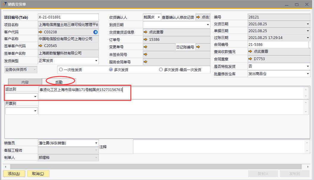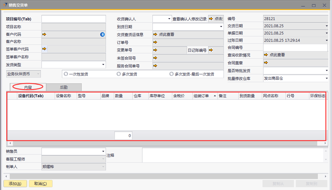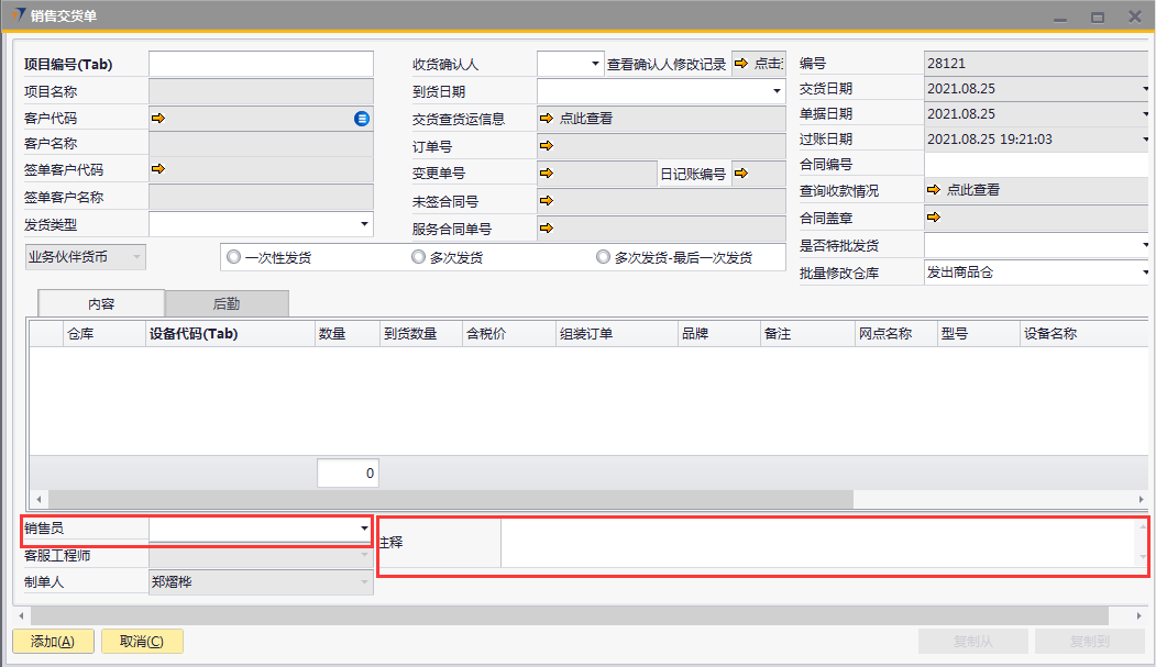 # 1 目的与作用 为了指导和规范PMC销售交货单录入,提升效率,规范管理 # 2 界面介绍 路径:销售应收管理 → 销售交货单  # 3 操作说明 ## 3.1 表头  说明: * + **项目编号:**必填,按Tab选择,销售交货项目 + **发货类型:**必填,发货类型 + **收货确认人:**必填:收货确认人 + **到货日期:**选填,到货日期 + **是否特批发货:**必填,项目是否特批发货 + **一次性发货、多次发货、多次发货-最后一次发货:**至少选择一个 + **批量修改仓库:**默认发出商品仓,如果需要批量修改发货仓名,请在明细行录入后,再在批量修改仓库选择对应的发货仓 + **项目名称、客户代码、客户名称、签单客户代码、签单客户名称:**选择项目编号时,系统默认自动带出,不能录入也不能修改 ## 3.2 表体 ### 3.2.1 内容  说明: * + **设备代码:**必填,发货设备代码 + **数量:**必填,发货数量 + **仓库:**必填,默认为发出商品仓,可明细行修改或表头批量修改 + **备注:**选填,需要说明的事项 + **设备名称、型号、品牌、库存单位:**选择设备代码时,系统默认自动带出,不能录入也不能修改 ### 3.2.2 后勤  说明: * + **运达到:**选填,货运达到的地方 + **开票到:**选填,货物开票地址 ### 3.2.3 其他  说明: * + **销售员:**必填,项目编号选择后,系统默认自动带出,可修改 + **注释:**选填,需要说明的事项 ## 3.3 操作步骤 ### 3.3.1 录入表头信息 鼠标定位到项目编号(Tab),再按Tab键,会调取出来当前账号权限范围内的所有可做销售交货单的项目  关键字搜索或直接鼠标滚动查找本次要发货项目,双击或左下方**选择**,选择项目  系统会带出来项目编号等相关信息,手动录入发货类型、收货确认人、是否特批发货  ### 3.3.2 录入表体信息 #### 3.3.2.1 录入内容 鼠标定位到设备代码,按Tab选择发货设备,录入数量  #### 3.3.2.2 录入后勤 录入运达到,检查销售员,如果需要说明其他事项请在注释说明  # 4 注意事项 无