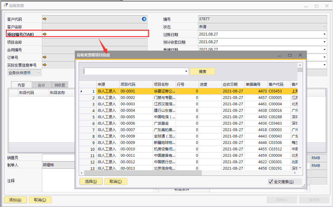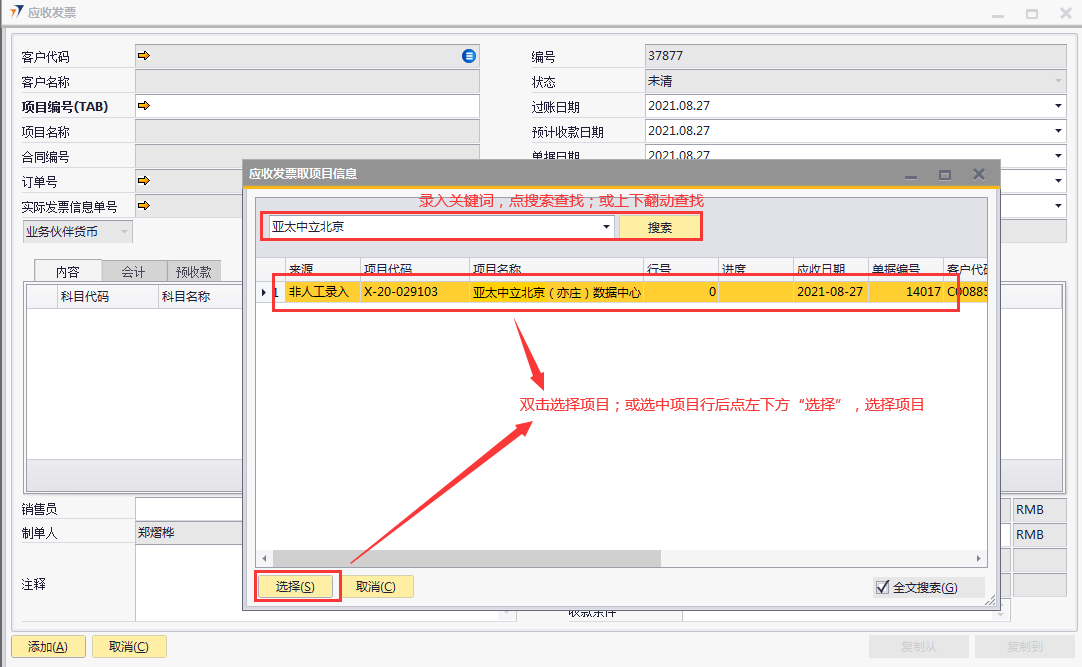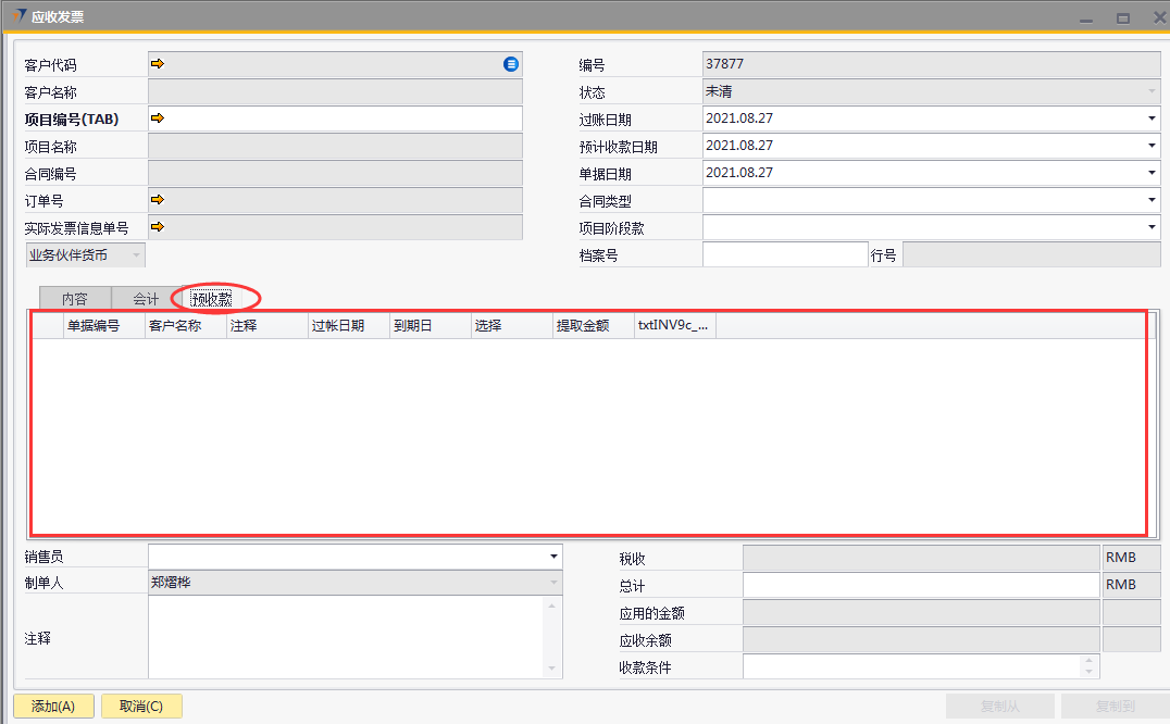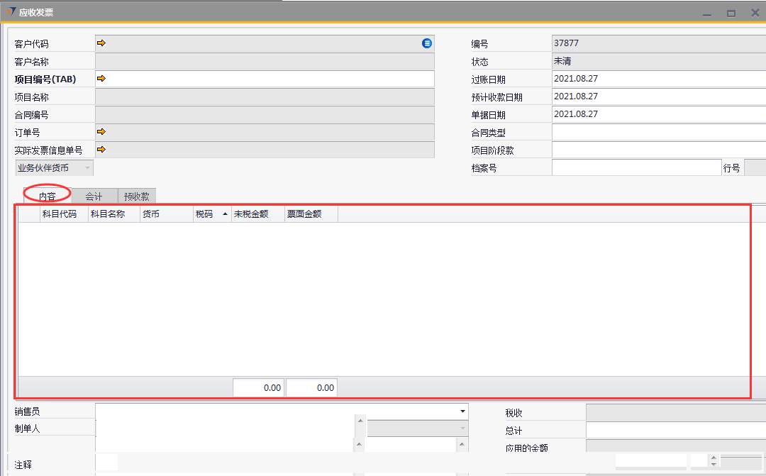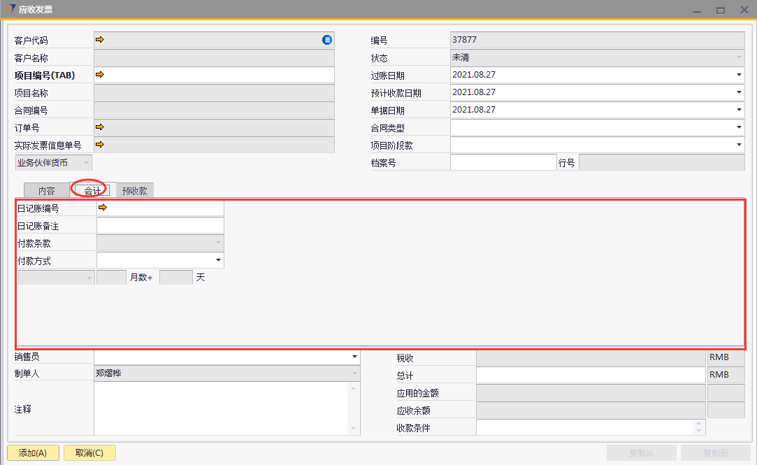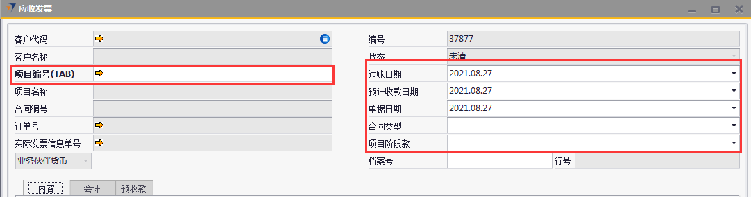 # 1 目的与作用 为了指导和规范财务人员应收发票录入,提升效率,规范管理 # 2 界面介绍 路径:销售应收管理 → 应收发票  # 3 操作说明 ## 3.1 表头  说明: * + **项目编号:**必填,按Tab选择,立应收项目 + **合同类型:**必填,有销售合同和维护合同可选 + **项目阶段款:**必填,项目哪个阶段的应收款 + **过账日期、预计收款日期、单据日期:**必填,系统默认当天日期,如需要修改可修改 ## 3.2 表体 ### 3.2.1 内容  说明: * + **科目代码:**必填,按Tab选择,应收科目代码 + **科目名称:**必填,跟科目代码一起带出,不能录入也不能修改 + **货币:**必填,默认为人民币,不是外币需要修改 + **税码:**必填,税率,默认为0%,可修改 + **未税金额:**必填,未税金额 + **票面金额:**必填,= 未税金额*(1+税码) ### 3.2.2 会计  说明: * + 此页签内容不需要手工录入 ### 3.2.3 预收款  说明: * + 此页签内容暂时未启用,不需要手工录入 ## 3.3 其他  说明: * + **销售员:**必填,选择项目编号时,系统会自动带出,可修改 + **注释:**选填,需要说明的相关事项 + **税收、应用的金额、应收余额:**系统自动带出,明细行中金额改变会对应改变,不能录入也不可修改 + **总计:**必填,系统自动计算 + **收款条件:**选填,收款相关条件 ## 3.4 操作步骤 ### 3.4.1 录入表头信息 鼠标定位到项目编号(Tab),再按Tab键,会调取出来当前账号权限范围内的所有可做应收发票的项目  关键字搜索或直接鼠标滚动查找本次要录应收发票项目,双击或左下方**选择**,选择项目  系统会带出来项目编号等相关信息,手动录入合同类型、项目阶段款  ### 3.4.2 录入表体和其他信息 右键增加明细行,录入科目代码、未税金额、税码,检查销售员、总计,信息录入完整无误后,点“添加”提交  # 4 注意事项 无