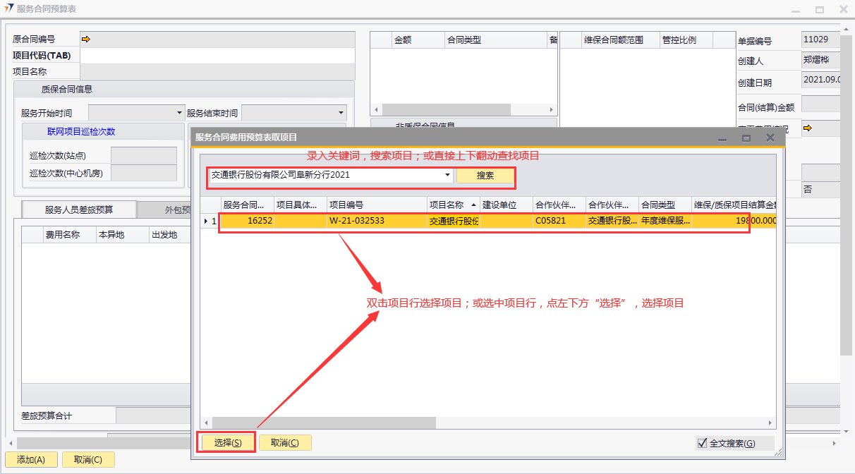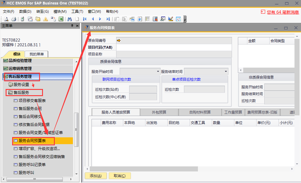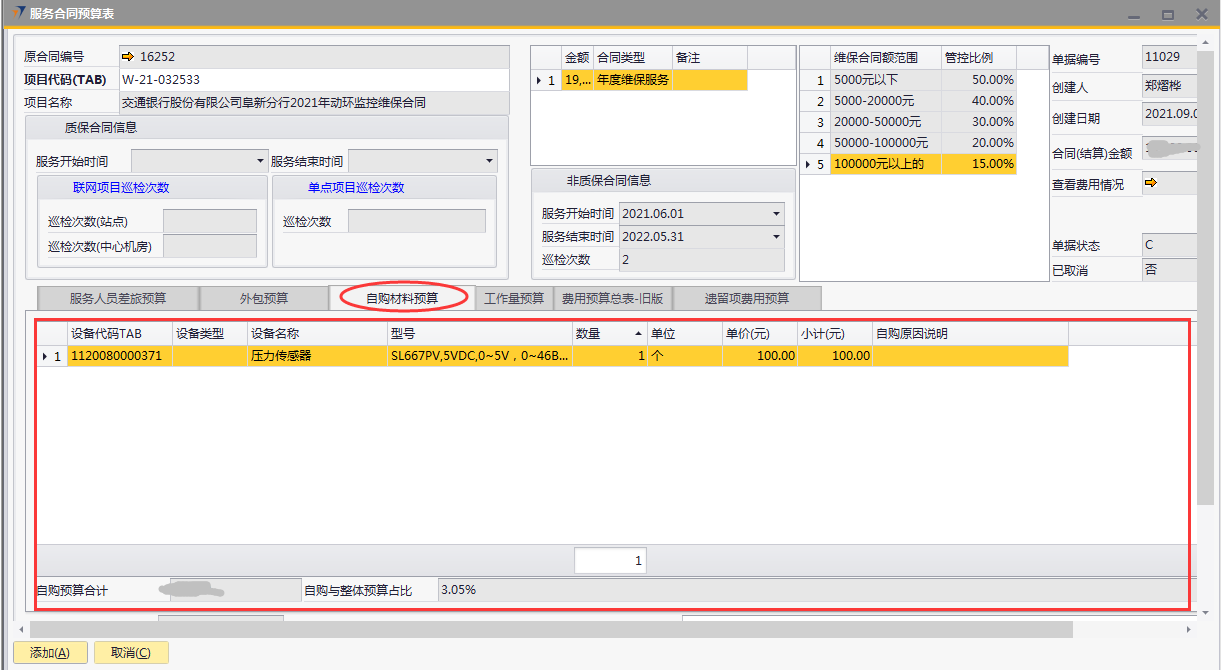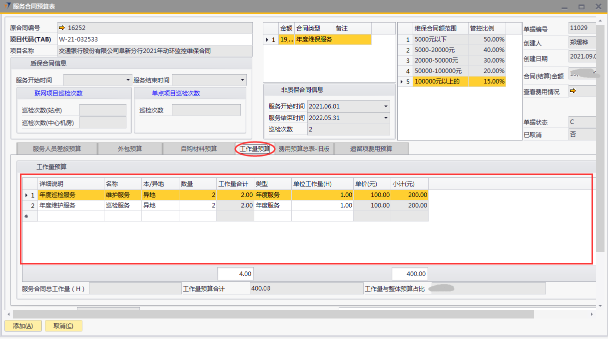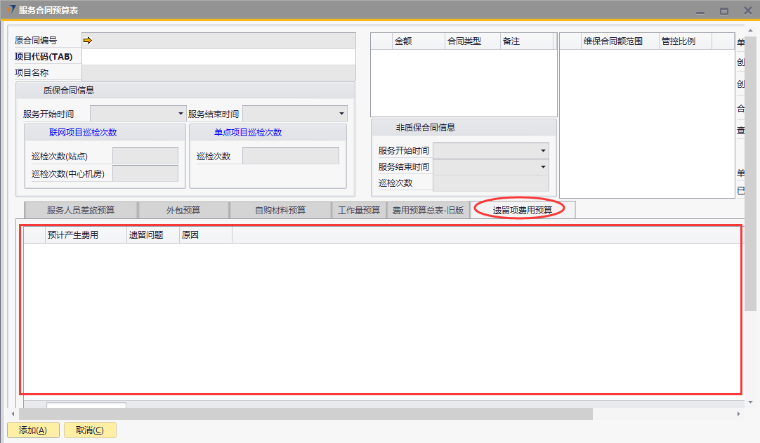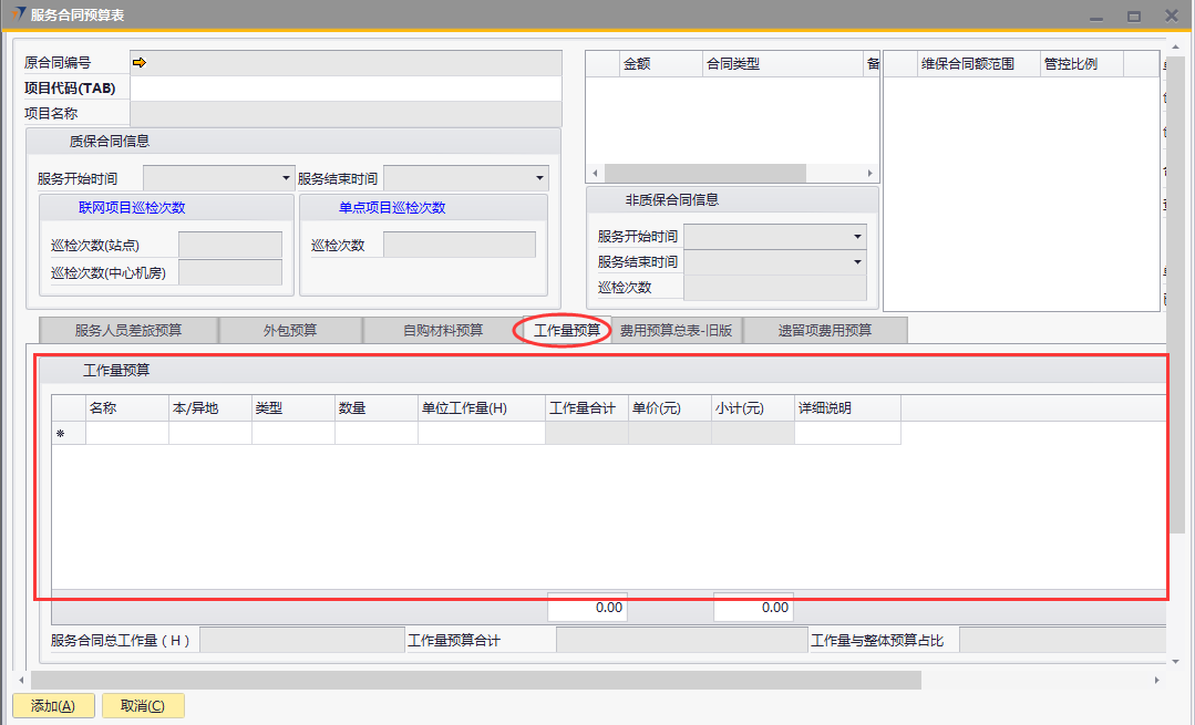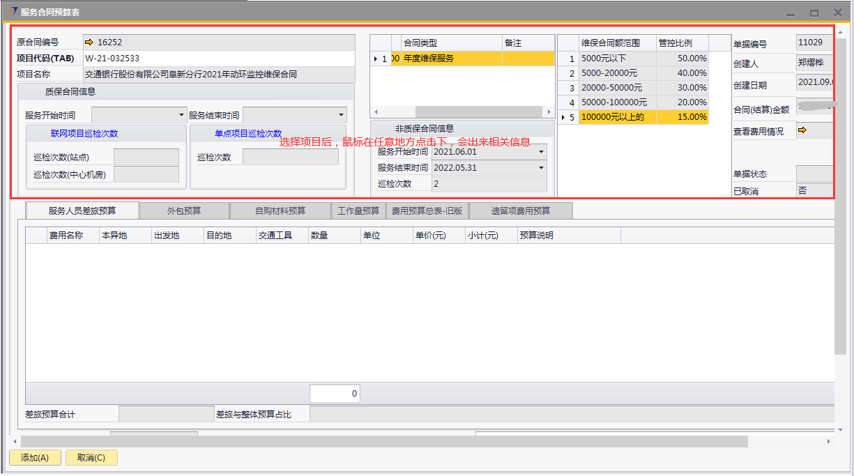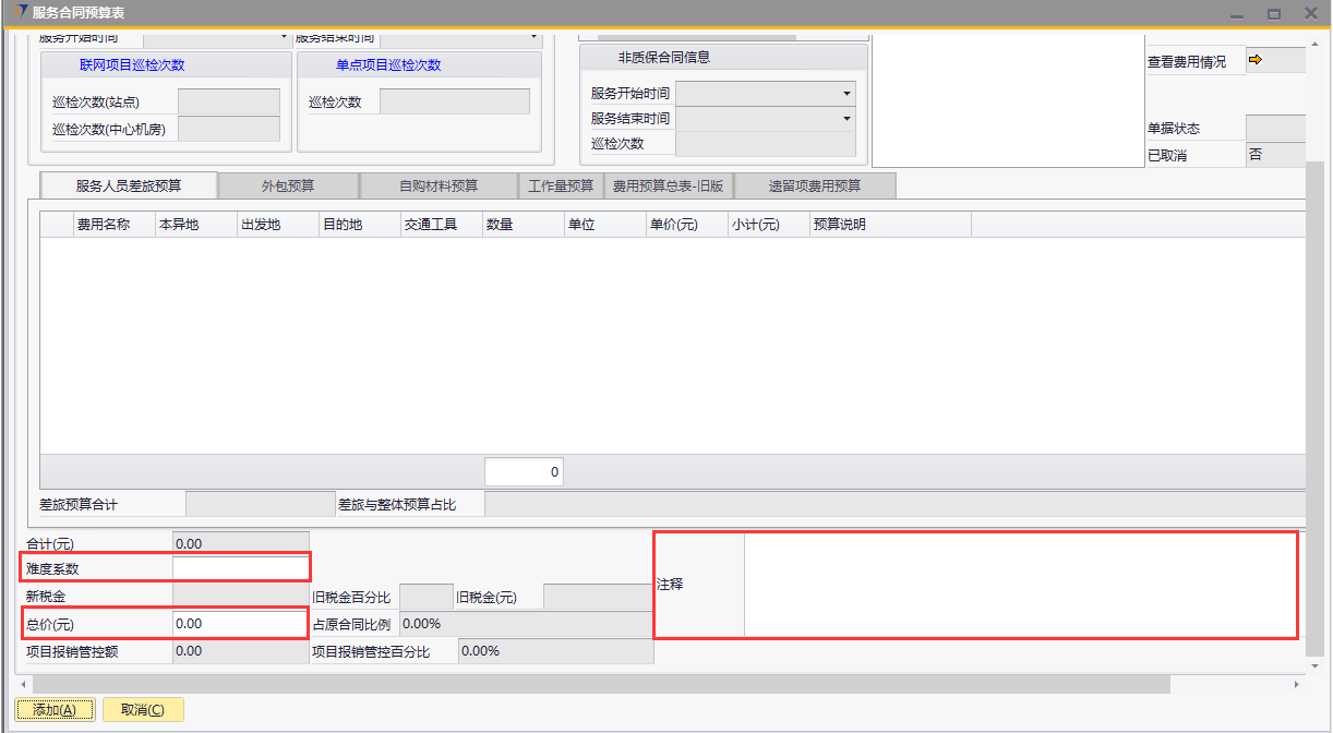 # 1 目的与作用 为了指导和规范售后人员服务合同预算单录入,提升效率,规范管理 # 2 界面介绍 路径:售后服务管理 → 售后服务 → 服务合同预算表  # 3 操作说明 ## 3.1 表头  说明: * + **项目代码:**必填,按Tab选择,选择要做预算的项目 + **项目名称、合同类型部分、管控比例部分、质保合同信息、非质保合同信息、巡检次数:**选择项目时系统会自动带出,不能录入也不能修改 ## 3.2 表体 ### 3.2.1 服务人员差旅预算  说明: * + **费用名称:**必填,费用名称 + **本异地:**选填,本地还是异地出差 + **出发地:**选填,出发地 + **目的地:**选填,目的地 + **交通工具:**选填,搭乘的交通工具 + **数量:**必填,搭乘的交通工具数量 + **单位:**必填,搭乘的交通工具单位 + **单价(元):**必填,搭乘的交通工具单价 + **小计(元):**必填,系统自动计算,= 数量*单价(元) + **预算说明:**选填,预算情况说明 ### 3.2.2 外包预算  说明: * + **名称:**必填,费用名称 + **详细名称:**选填,详细的费用名称 + **数量:**必填,搭乘的交通工具数量 + **单位:**必填,搭乘的交通工具单位 + **单价(元):**必填,搭乘的交通工具单价 + **小计(元):**必填,系统自动计算,= 数量*单价(元) + **外包情况说明:**选填,外包情况说明 ### 3.2.3 自购材料预算  说明: * + **设备代码:**必填,按Tab选择 + **设备名称、型号:**选择设备代码时,系统会默认带出,可修改 + **设备类型:**必填,设备类型 + **数量:**必填,设备数量,只能是数字,按实际录入 + **单位:**选填,设备的单位 + **单价(元):**必填,设备单价,以元为单位,按实际录入 + **小计(元):**必填,系统自动计算,=数量*单价(元) + **自购原因说明:**选填,自购原因说明 ### 3.2.4 工作量预算  说明: * + **名称:**必填,工作名称 + **本/异地:**必填,本地还是异地 + **类型:**必填,工作类型 + **数量:**必填,工作数量 + **单位工作量(H):**必填,单位工作量 + **工作量合计:=** 数量*单位工作量 + **单价(元):**默认为100,不能录入也不能修改 + **小计(元):=** 数量*单位工作量*单价(元) + **详细说明:**选填,详细说明 ### 3.2.5 费用预算总表-旧版  说明: * + 此页签内容仅供查询以前相关数据,不做录入使用 ### 3.2.6 遗留项费用预算  说明: * + 此页签内容从工程项目结算单遗留项取出,如果所选项目有数据,会自动带过来 ### 3.2.7 其他  说明: * + **难度系数:**必填,项目难度系数 + **总价:**必填,预算总价 + **注释:**需要说明的其他事项 + **新税金、项目报销管控额、项目报销管控百分比:**系统自动计算,不能录入也不能修改 ## 3.3 操作步骤 ###3.3.1 录入表头信息 鼠标定位到项目编号(Tab),再按Tab键,会调取出来当前账号权限范围内的所有可做预算单的项目  关键字搜索或直接鼠标滚动查找本次要做预算的项目,双击或左下方**选择**,选择立项的项目  选择项目后,鼠标在任意地方点击下,会出来相关信息  ### 3.3.2 录入表体信息 #### 3.3.2.1 录入服务人员差旅预算 录入服务人员差旅预算  #### 3.3.2.2 录入外包预算 录入外包预算  #### 3.3.2.3 录入自购材料预算 录入自购材料预算(如果没有自购设备,不录入)  #### 3.3.2.4 录入工作量预算 录入工作量预算  #### 3.3.2.5 录入其他 录入难度系统、总价(元),相关信息录入完整无误后,点“添加”提交  # 4 注意事项 一个项目只能做一次服务合同预算