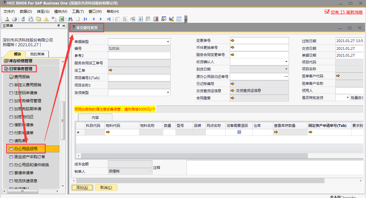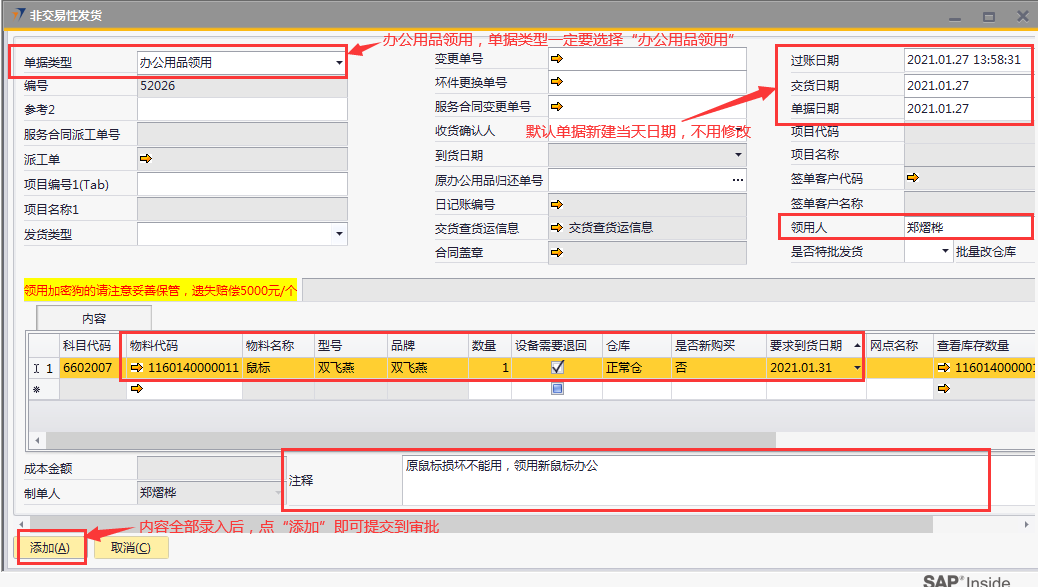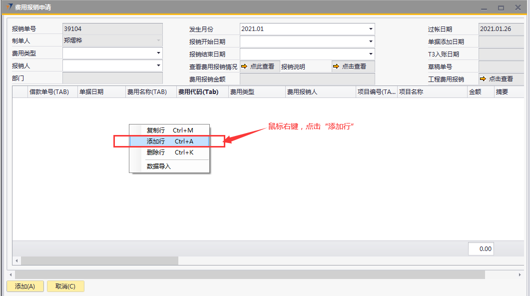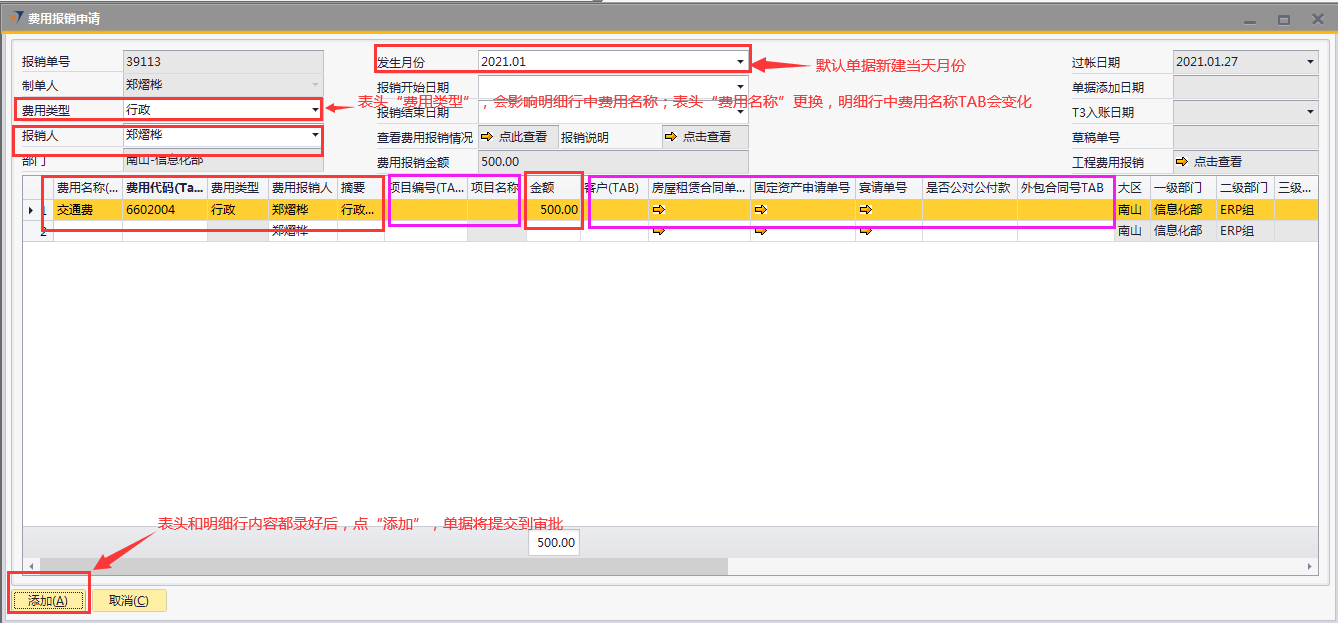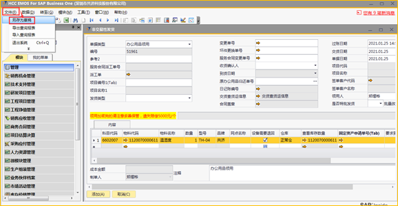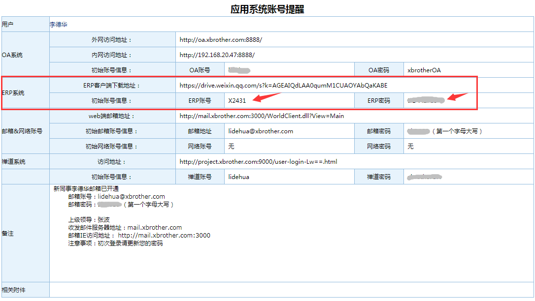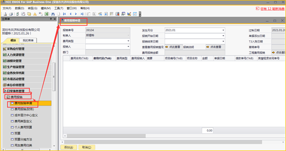 # 1 目的与作用 为了指导和规范新进员工ERP操作 # 2 ERP常规说明 ## 2.1 账号获取 新员工登录企业微信后,会收到一条**应用系统账号提醒**的消息推送,内容有ERP账号和密码信息、ERP客户端下载地址  ## 2.2 安装文件和配置文件获取 1. 企业微信 → 工作台 → 微盘 → ERP安装包 <https://drive.weixin.qq.com/s?k=AGEAIQdLAA0qumM1CUAOYAbQaKABE>  2. EDOC → 文档 → 03信息化部 → ERP部 → ERPERP-WJ-01 → ERP安装文件 <http://edoc2.xbrother.com:8086/default.aspx?token=2b34a19d-b3ab-4e5f-a9de-d85b07d9d7ed#doc/fld/793>  ## 2.3 软件安装 双击安装文件,除了下面两步骤需要选择外,其他步骤直接点击下一步直到安装完成 1. 许可协议选择“我同意该许可协议的条款”  2. 选项处选择“客户端安装”  ## 2.4 软件配置 安装完ERP程序后, 请将下载的配置文件,放到C:\Windows下,完成ERP配置 效果如下:  ## 2.5 密码修改 路径:管理 → 系统初始化 → 修改密码(自定义)  录入**新密码**、**确认新密码**,点击“添加”即可 ## 2.6 窗口重开 打开单据后,点右上方,关掉当前窗口,再重新打开单据,叫窗口重开  ## 2.7 重新启动 点工具栏,可重启ERP  ## 2.8 消息警报查看 点工具栏,可查看消息警报 或点“您有X笔消息”,也可查看消息警报  如下为效果图,请及时查看和留意警报 、审批及短消息内容  ## 2.9 数据导出 导出可导出报表、单据数据 **数据可导出的前提是:**用户必须有要导出单据或报表的权限,如果提示“不能进行此操作”,说明用户没有导出权限。ERP系统出于数据安全性考虑,导出权限管理比较严格,如果实在需要,请先找本部门管理人员反应沟通 打开要导出的单据或报表,点击工具栏,可导出数据  ## 2.10 单据上下翻页 打开单据,点工具栏,可实现上下翻页、查找第一张、查找最后一张操作  ## 2.11 保存草稿 单据如果不需要或不能直接添加,需要先保存草稿时,可另存为草稿 路径:文件 另存为草稿  会弹出来如下**草稿备注**对话框,录入草稿备注,点“确定”即可  ## 2.12 草稿查询 路径:管理 → 系统初始化 → 草稿单据  如果不选择单据,查询所有单据草稿;如果选择单据,查询该单据相关的草稿 草稿单不多的情况下,可不选单据直接查找  选中要打开的草稿单 双击选定的那一行,可打开草稿单;或点右下方**打开草稿单**,可打开草稿单  ## 2.13 单据提交后是否走审批 新建单据**添加**后,添加后会出现如下窗口,也就是需要审批。如果出现如下窗口,表示正常走流程;如果提交时没有弹出如下窗口,说明提交人此单据的流程可能没配置或没配置到位,请及时联系ERP部门人员反应情况  注:系统单据基本上提交后需要走流程,如费用报销、付款、非交易性收发货、固定资产申请等;极少单据不需要走流程,如项目任务单 ## 2.14 已提交审批单据状态查找 路径:管理 → 审批流程 → 审批跟踪报表查询  **单据状态说明:** **未决定:**表示还在走审批的单据 **已批准:**表示已经审批完成还没添加为正式单据 **已拒绝:**表示某个审批阶段,被审批人拒绝的单据 **已生成:**表示已经完成审批且已经添加为正式单据 **已撤销:**表示提单人自行撤销的单据 如要查找未审批的开票通知单流程已经到哪,点击开票通知单—未决定**对应的数字**,进入到审批跟踪报表,可看到未完成审批的单据  点击想查看的行,可看到单据的对应审批情况  ## 2.15 已提交审批草稿单据撤销 路径:管理 → 审批流程 → 审批跟踪报表查询  ## 2.16 已生成单据查找 1. 如果单据不多,可上下翻页查找 2. 如果单据多,可用单据编号、项目编号、项目名称等关键字段精确查找或模糊查找 以查找办公用品领用单为例 打开非交易性发货单,此单据打开时默认是“添加”状态  点工具栏切换到查找状态  录入查询条件:查询办公用品领用时,单据类型选择“办公用品领用”,录入领用人,点左下方“查找”  会出来对应领用人所有的办公用品领用单据  ## 2.17 关键词模糊查找 1. 如果只记得单据部分内容,可用关键词模糊查找 2. 如果只需要查找特定内容的所有单据,可用关键词模糊查找 3. 报表过滤时,可用关键词查找过滤 关键词前后加上**号,表示模糊查找。如想查找系统里项目名称有“招商银行”的所有工程立项,在项目名称栏位录入*招商银行* ,再点左下方“查找”,即可出来所有招商银行项目工程立项。 ## 2.18 数据过滤 报表里,选择要过滤的字段,可进行数据过滤。过滤时可选择具体值精确过滤,或关键词过滤 如要找办公用品领用明细报表,所有设备名称含**网卡**二字的行 先找到字段设备名称,鼠标定位到该字段上,字段右上方会出来倒三角,点倒三角  选“自定义”,可对关键词过滤  用户自定义过滤器录入条件,**类似于*网卡***,点左下方“确定”  会出来设备名称关键词是“网卡”的所有办公用品领用明细  ## 2.19 数据排序 报表或单据,有多行数据时,可按需求对字段进行数据排序 在打开的报表或单据上,找到要排序的字段,单击即可进行排序  # 3 常用单据录入 ## 3.1 费用报销申请 路径:日常事务管理→ 费用报销→ 费用报销申请  空白处右键,点击“添加行”  表头和明细行录入相关内容,点左下方“添加”即可  说明: * + **发生月份:**必录,系统默认为单据新建时当天月份,可修改 + **费用类型(表头):**必录,选择报销的费用类型 + **报销人:**必录,选择报销人 + **费用名称:**必录,按TAB选择。必须**先**录入**表