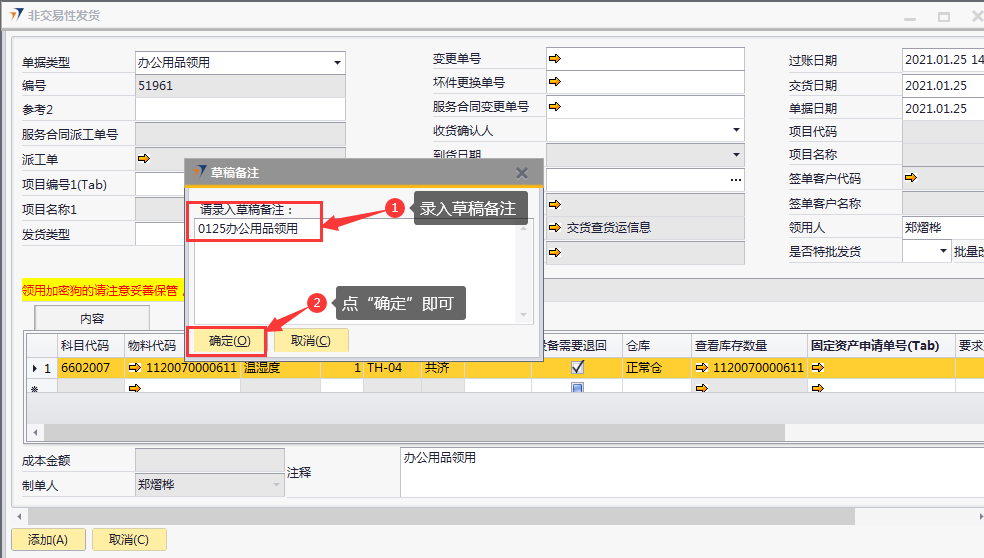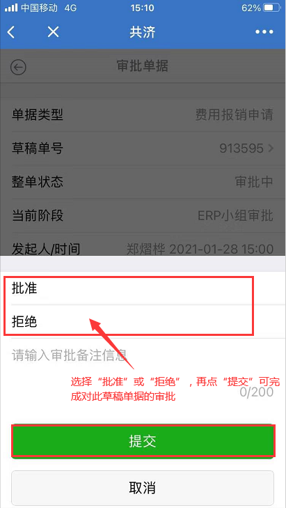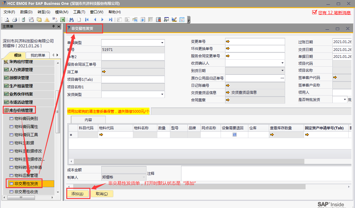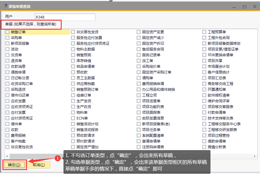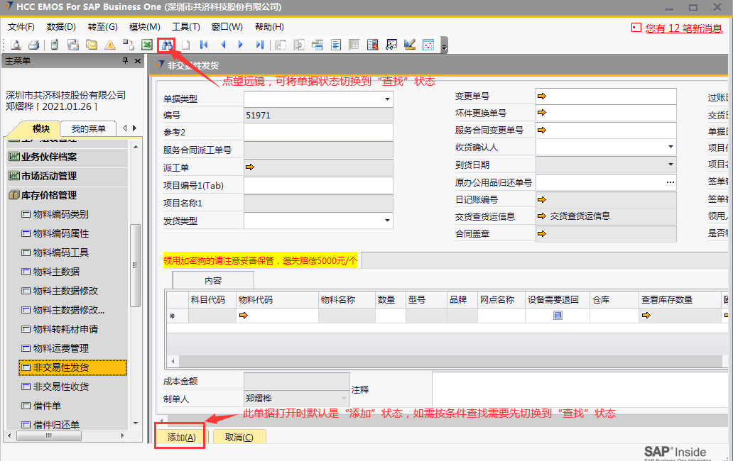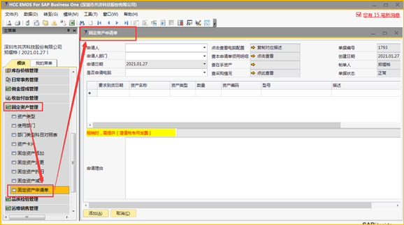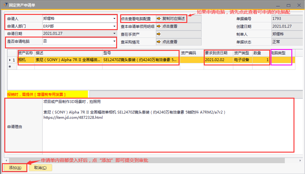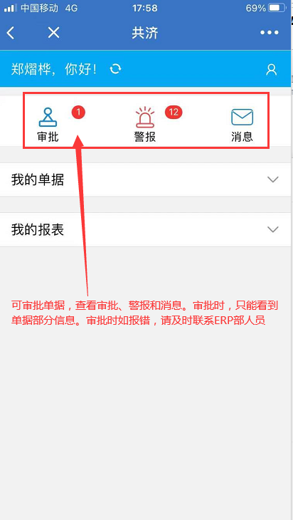 # 1 目的与作用 为了指导和规范新进员工ERP操作 # 2 ERP常规说明 ## 2.1 账号获取 新员工登录企业微信后,会收到一条**应用系统账号提醒**的消息推送,内容有ERP账号和密码信息、ERP客户端下载地址  ## 2.2 安装文件和配置文件获取 1. 企业微信 → 工作台 → 微盘 → ERP安装包 <https://drive.weixin.qq.com/s?k=AGEAIQdLAA0qumM1CUAOYAbQaKABE>  2. EDOC → 文档 → 03信息化部 → ERP部 → ERPERP-WJ-01 → ERP安装文件 <http://edoc2.xbrother.com:8086/default.aspx?token=2b34a19d-b3ab-4e5f-a9de-d85b07d9d7ed#doc/fld/793>  ## 2.3 软件安装 双击安装文件,除了下面两步骤需要选择外,其他步骤直接点击下一步直到安装完成 1. 许可协议选择“我同意该许可协议的条款”  2. 选项处选择“客户端安装”  ## 2.4 软件配置 安装完ERP程序后, 请将下载的配置文件,放到C:\Windows下,完成ERP配置 效果如下:  ## 2.5 密码修改 路径:管理 → 系统初始化 → 修改密码(自定义)  录入**新密码**、**确认新密码**,点击“添加”即可 ## 2.6 窗口重开 打开单据后,点右上方,关掉当前窗口,再重新打开单据,叫窗口重开  ## 2.7 重新启动 点工具栏,可重启ERP  ## 2.8 消息警报查看 点工具栏,可查看消息警报 或点“您有X笔消息”,也可查看消息警报  如下为效果图,请及时查看和留意警报 、审批及短消息内容  ## 2.9 数据导出 导出可导出报表、单据数据 **数据可导出的前提是:**用户必须有要导出单据或报表的权限,如果提示“不能进行此操作”,说明用户没有导出权限。ERP系统出于数据安全性考虑,导出权限管理比较严格,如果实在需要,请先找本部门管理人员反应沟通 打开要导出的单据或报表,点击工具栏,可导出数据  ## 2.10 单据上下翻页 打开单据,点工具栏,可实现上下翻页、查找第一张、查找最后一张操作  ## 2.11 保存草稿 单据如果不需要或不能直接添加,需要先保存草稿时,可另存为草稿 路径:文件 另存为草稿  会弹出来如下**草稿备注**对话框,录入草稿备注,点“确定”即可  ## 2.12 草稿查询 路径:管理 → 系统初始化 → 草稿单据  如果不选择单据,查询所有单据草稿;如果选择单据,查询该单据相关的草稿 草稿单不多的情况下,可不选单据直接查找  选中要打开的草稿单 双击选定的那一行,可打开草稿单;或点右下方**打开草稿单**,可打开草稿单  ## 2.13 单据提交后是否走审批 新建单据**添加**后,添加后会出现如下窗口,也就是需要审批。如果出现如下窗口,表示正常走流程;如果提交时没有弹出如下窗口,说明提交人此单据的流程可能没配置或没配置到位,请及时联系ERP部门人员反应情况  注:系统单据基本上提交后需要走流程,如费用报销、付款、非交易性收发货、固定资产申请等;极少单据不需要走流程,如项目任务单 ## 2.14 已提交审批单据状态查找 路径:管理 → 审批流程 → 审批跟踪报表查询  **单据状态说明:** **未决定:**表示还在走审批的单据 **已批准:**表示已经审批完成还没添加为正式单据 **已拒绝:**表示某个审批阶段,被审批人拒绝的单据 **已生成:**表示已经完成审批且已经添加为正式单据 **已撤销:**表示提单人自行撤销的单据 如要查找未审批的开票通知单流程已经到哪,点击开票通知单—未决定**对应的数字**,进入到审批跟踪报表,可看到未完成审批的单据  点击想查看的行,可看到单据的对应审批情况  ## 2.15 已提交审批草稿单据撤销 路径:管理 → 审批流程 → 审批跟踪报表查询  ## 2.16 已生成单据查找 1. 如果单据不多,可上下翻页查找 2. 如果单据多,可用单据编号、项目编号、项目名称等关键字段精确查找或模糊查找 以查找办公用品领用单为例 打开非交易性发货单,此单据打开时默认是“添加”状态  点工具栏切换到查找状态  录入查询条件:查询办公用品领用时,单据类型选择“办公用品领用”,录入领用人,点左下方“查找”  会出来对应领用人所有的办公用品领用单据  ## 2.17 关键词模糊查找 1. 如果只记得单据部分内容,可用关键词模糊查找 2. 如果只需要查找特定内容的所有单据,可用关键词模糊查找 3. 报表过滤时,可用关键词查找过滤 关键词前后加上**号,表示模糊查找。如想查找系统里项目名称有“招商银行”的所有工程立项,在项目名称栏位录入*招商银行* ,再点左下方“查找”,即可出来所有招商银行项目工程立项。 ## 2.18 数据过滤 报表里,选择要过滤的字段,可进行数据过滤。过滤时可选择具体值精确过滤,或关键词过滤 如要找办公用品领用明细报表,所有设备名称含**网卡**二字的行 先找到字段设备名称,鼠标定位到该字段上,字段右上方会出来倒三角,点倒三角  选“自定义”,可对关键词过滤  用户自定义过滤器录入条件,**类似于*网卡***,点左下方“确定”  会出来设备名称关键词是“网卡”的所有办公用品领用明细  ## 2.19 数据排序 报表或单据,有多行数据时,可按需求对字段进行数据排序 在打开的报表或单据上,找到要排序的字段,单击即可进行排序  # 3 常用单据录入 ## 3.1 费用报销申请 路径:日常事务管理→ 费用报销→ 费用报销申请  空白处右键,点击“添加行”  表头和明细行录入相关内容,点左下方“添加”即可  说明: * + **发生月份:**必录,系统默认为单据新建时当天月份,可修改 + **费用类型(表头):**必录,选择报销的费用类型 + **报销人:**必录,选择报销人 + **费用名称:**必录,按TAB选择。必须**先**录入**表