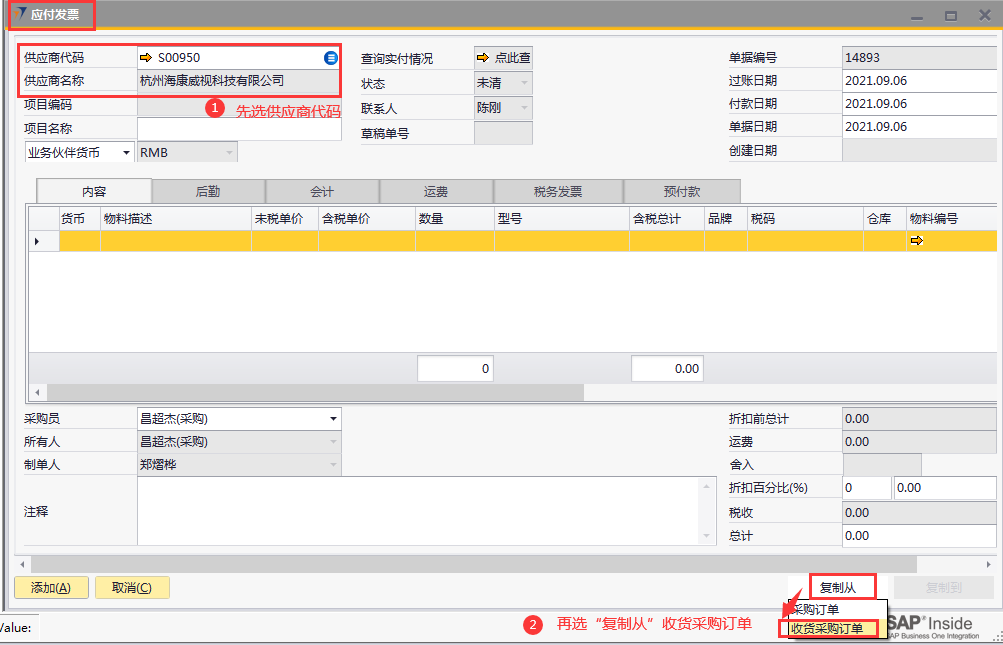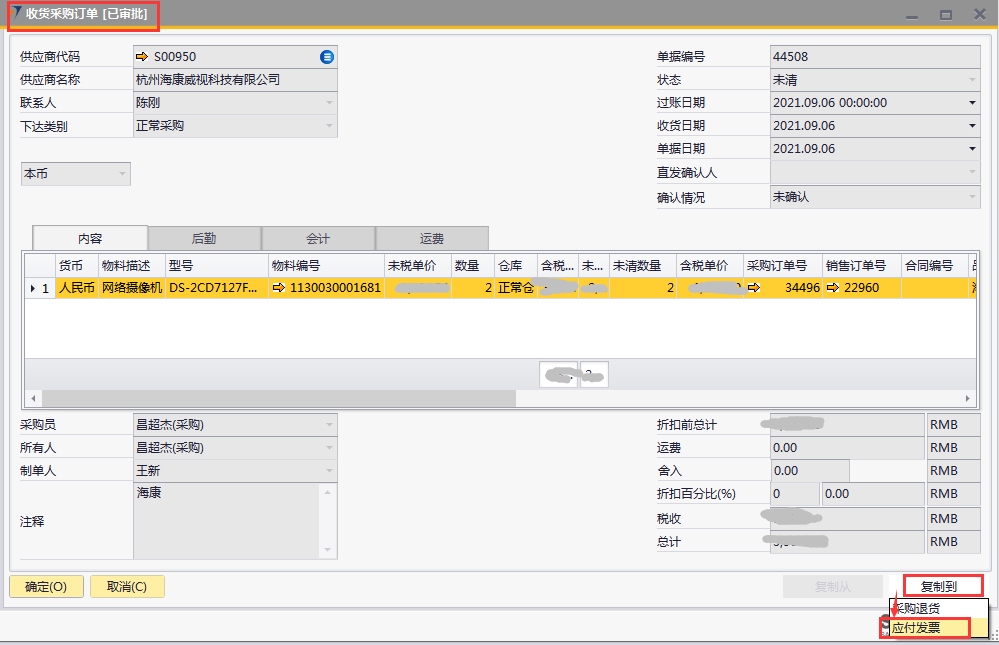 # 1 目的与作用 为了指导和规范采购人员应付发票操作,提升效率,规范管理 # 2 界面介绍 路径:采购应付管理 → 应付发票  # 3 操作说明 应付发票操作有两种方法: 1. 打开收货采购订单,右下方点**复制到,**选择应付发票。此方法只能针对当前打开的收货采购订单做应付发票 2. 打开应付发票,录入要开具应付发票的供应商代码,点右下方**复制从**,选择**采购订单**或**收货采购订单**。此方法可对采购订单或收货采购订单批量开具应付发票 ## 3.1 收货采购订单复制到应付发票 1. 打开要开发票的收货采购订单,右下方点**复制到**,选择**应付发票**  2. 收货采购订单相关信息会带到应付发票,如果不是全部应付,修改数量,总计会自动刷新**。**检查相关信息,确认无误后,点“添加”提交  ## 3.2 应付发票复制从采购订单/收货采购订单 1. 打开应付发票,录入供应商代码,点右下方**复制从**收货采购订单  2. 将会弹出供应商所有可做应付的收货采购订单。如果只对一张收货采购订单申请应付,选择要应付的收货采购订单,双击;如果对多张收货采购订单操作预付款,按住ctrl可不连续选择收货采购订单(或按住shift连续选择收货采购订单)  3. 默认状态,直接点**完成**  4. 如果不是全部应付,修改数量,总计会自动刷新**。**检查相关信息,确认无误后,点“添加”提交  # 4 注意事项 无