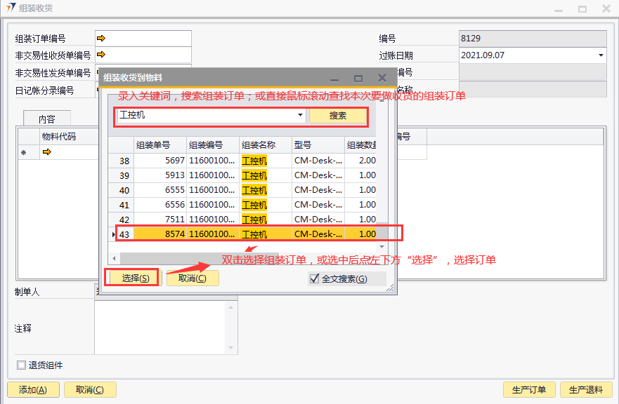 # 1 目的与作用 为了指导和规范生产制造相关人员组装收货录入,提升效率,规范管理 # 2 界面介绍 路径:生产组装管理 → 组装收货  # 3 操作说明 组装收货是基于组装订单的收货 ## 3.1 表头  说明: * + **组装订单号:**必填,按Tab选择,选择要收货的组装订单 + **非交易性收货单号:**组装收货单添加后,系统自动回写,不需要录入 + **非交易性发货单号:**组装收货单添加后,系统自动回写,不需要录入 + **日记账分录编号:**不需要录入 + **过账日期:**必填,系统默认为当天 + **项目编号、项目名称:**选择组装订单时系统会自动带出,不能录入也不能修改 ## 3.2 表体  说明: 选择组装订单编号,表体明细数据会自动带出 * + **物料代码:**必填,物料代码 + **物料描述、规格型号:**必填,选择物料代码时系统会自动带出 + **仓库:**必填,选择物料代码时系统会自动带出 + **数量:**必填,选择物料代码时系统会自动带出 + **订单编号:**必填,选择物料代码时系统会自动带出 ## 3.3 操作步骤 1. 鼠标定位到组装订单编号,再按Tab键,会调取出来当前账号权限范围内的所有可收货的组装订单  2. 关键词搜索或直接鼠标滚动查找本次要做收货的组装订单,双击选择或选中后点左下方**选择**,选择订单  3. 选择组装订单编号后,组装订单明细会一起带出,检查明细行数据。相关数据录入完整无误后,点“添加”提交  # 注意事项 无
