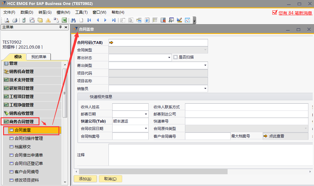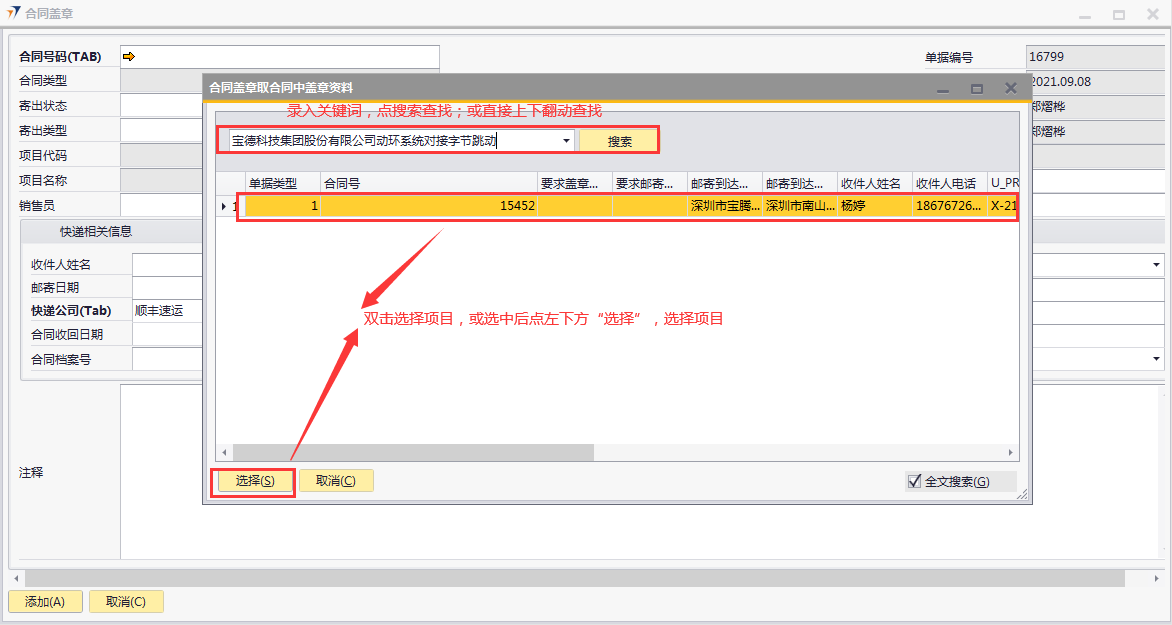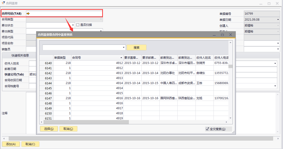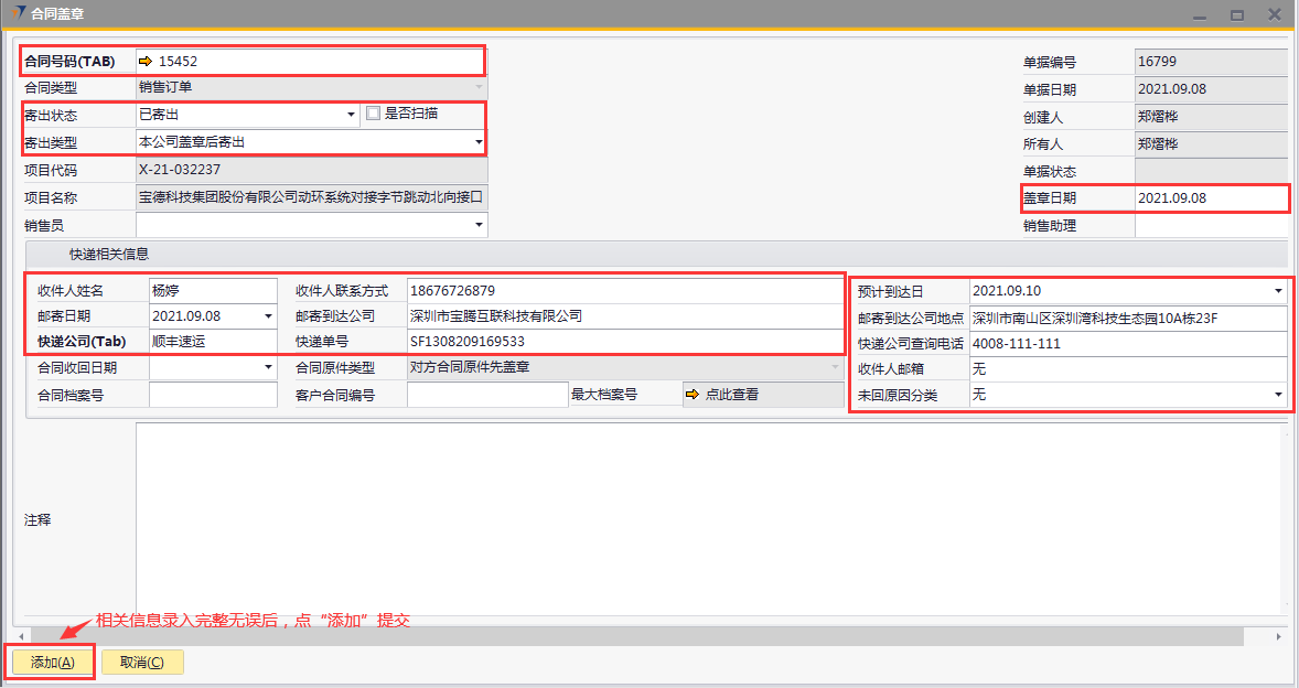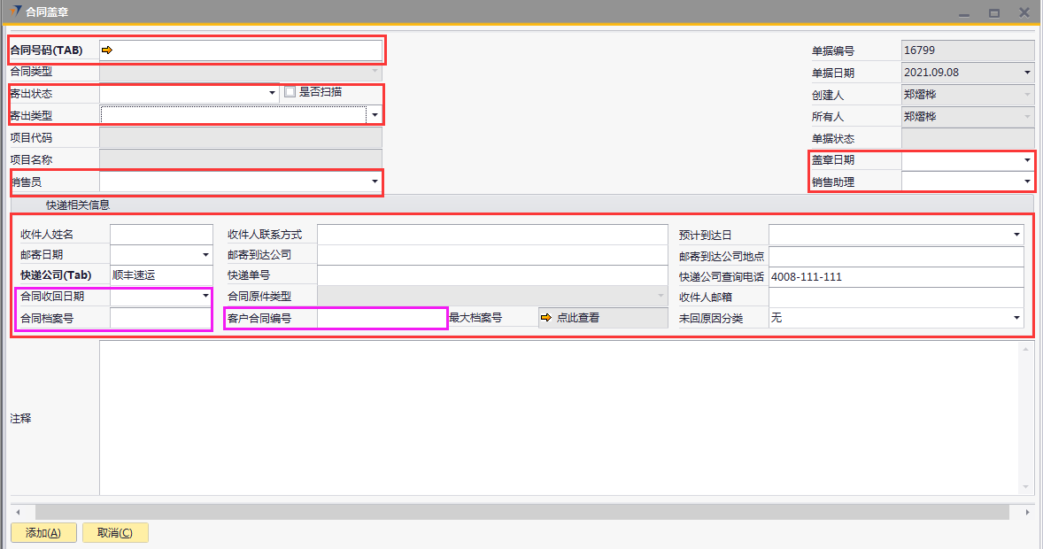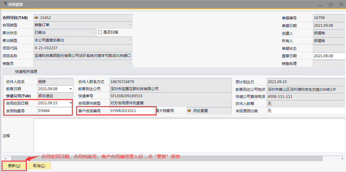 # 1 目的与作用 为了指导和规范合同管理相关人员合同盖章录入,提升效率,规范管理 # 2 界面介绍 路径:商务合同管理 → 合同盖章  # 3 操作说明 ## 3.1 表单  说明: * + **合同号码:**必填,按Tab选择,选择合同盖章项目 + **项目代码:**必填,选择合同号码后,系统会自动带出,不允录入也不允许修改 + **项目名称:**必填,选择合同号码后,系统会自动带出,不允录入也不允许修改 + **销售员:**选填,销售员姓名 + **盖章日期:**选填,合同盖章日期 + **销售助理:**选填,销售助理 + **合同类型:**必填,选择合同号码后,合同类型自动带出,有销售订单和售后服务合同两种 + **寄出状态:**必填,有已寄出、已送达、已返回三种 + **寄出类型:**必填,有本公司盖章后寄出、双方公司均已盖章后寄出两种 + **收件人姓名:**必填,选择合同号码后,收件人姓名会自动带出,可修改 + **收件人联系方式:**必填,选择合同号码后,收件人姓名会自动带出,可修改 + **邮寄日期:**必填,邮寄日期 + **邮寄到达公司:**必填,选择合同号码后,收件人姓名会自动带出,可修改 + **快递公司:**必填,默认为顺丰速运,可修改 + **快递单号:**必填,快递单号 + **预计到达日:**选填,快递预计到达日 + **邮寄到达公司地点:**必填,选择合同号码后,收件人姓名会自动带出,可修改 + **快递公司查询电话:**必填,默认为顺丰速运 + **合同收回日期:**如果是客户先盖章,新建时录入;如果不是客户先盖章,归档时录入 + **合同档案号:**如果是客户先盖章,新建时录入;如果不是客户先盖章,归档时录 + **客户合同编号:**如果是客户先盖章,新建时录入;如果不是客户先盖章,归档时录入 + **收件人邮箱:**选填,选择合同号码后,收件人姓名会自动带出,可修改 + **未回原因分类:**选填,未回原因 + **注释:**选填,需要说明的其他事项 ## 3.2 操作步骤 如果是客户先盖章,合同收回日期、合同档案号、客户合同编号新建时直接录入 如果不是客户先盖章,归档时再录入合同收回日期、合同档案号、客户合同编号 本次演示以不是客户先盖章为例 ### 3.2.1 合同盖章新建 1. 鼠标定位到合同号码,再按Tab键,会调取出来当前账号权限范围内的所有可做合同盖章的项目  2. 关键词搜索或直接鼠标滚动查找本次要合同盖章的项目,双击选择或选中后点左下方**选择**,选择项目  3. 选择合同号码后,项目代码、项目名称、收件人相关等信息会一起带出,检查数据,录入寄出状态、寄出类型、盖章日期、快递单号、预计到达日。相关数据录入完整无误后,点“添加”提交  ### 3.2.2 合同归档 1. 打开要归档的项目的合同盖章单  2. 录入合同收回日期、合同档案号、客户合同编号,然后点左下方“更新”保存即可  # 4 注意事项 同一项目只能录入一次合同盖章