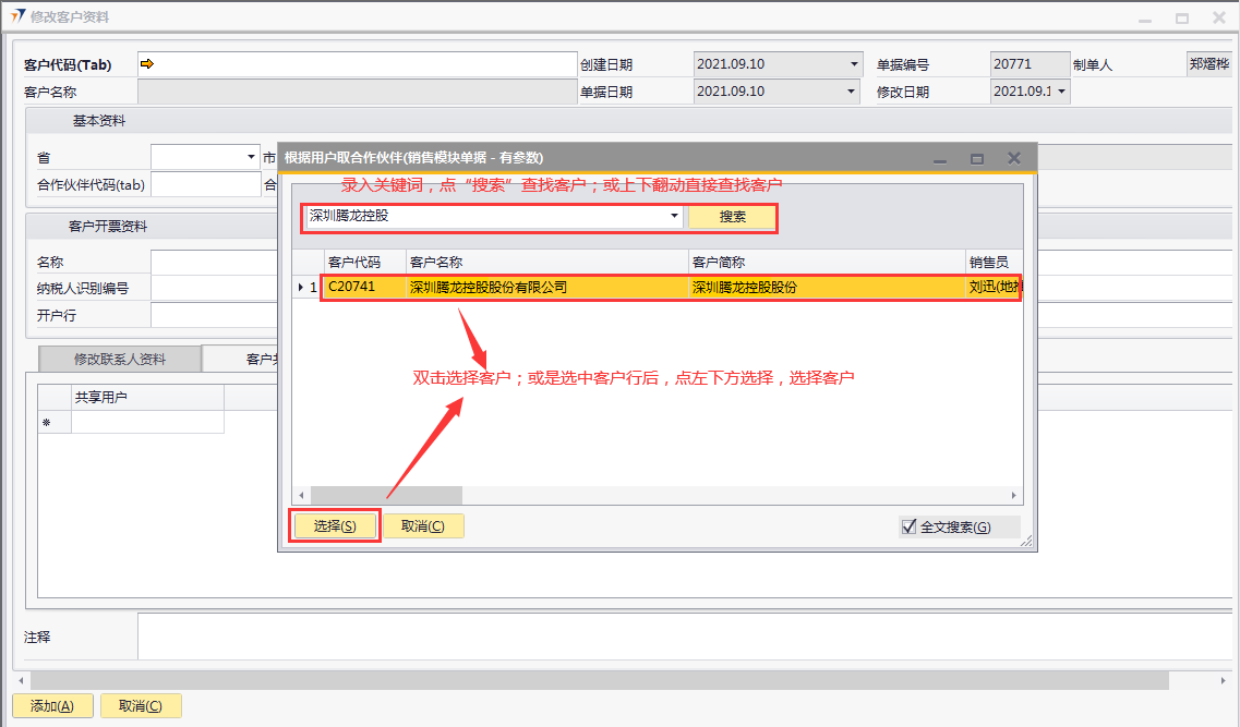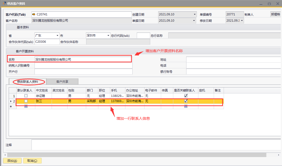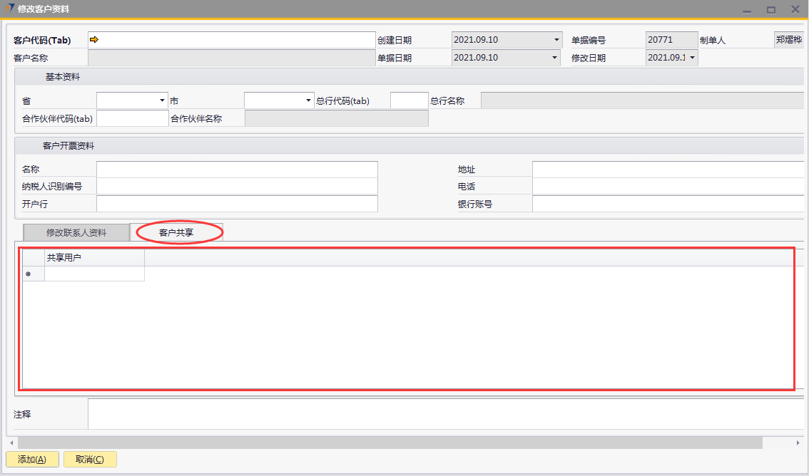 # 1 目的与作用 为了指导和规范销售、售后人员客户档案修改(客户名称修改不能用此单据操作),提升效率,规范管理 # 2 界面介绍 路径:业务伙伴档案 → 修改客户资料  # 3 操作说明 ## 3.1 表头  说明: * + **客户代码:**必填,按Tab选择,选择要修改信息的客户代码 + **省:**系统会自动带出客户档案里的省,如果需要修改,选择要修改的省 + **市:**系统会自动带出客户档案里的市,如果需要修改,选择要修改的市 + **总行代码:**系统会自动带出客户档案里的总行代码,如果需要修改,选择要修改的总行代码 + **总行名称:**系统会自动带出客户档案里的总行名称,如果需要修改,选择要修改的总行代码时,总行名称会自动带过来 + **合作伙伴代码:**系统会自动带出客户档案里的合作伙伴代码,如果需要修改,选择要修改的合作伙伴代码 + **合作伙伴名称:**系统会自动带出客户档案里的合作伙伴名称,如果需要修改,选择要修改的合作伙伴代码时,合作伙伴名称会自动带过来 + **客户地址:**必填,客户详细的地址 + **总行代码:**选填,如果有总行,录入总行代码 + **总行名称:**如果录入总行代码,系统会自动带出总行名称,不允许新建也不允许修改 + **合作伙伴代码:**选填,如果有合作伙伴,录入合作伙伴代码 + **合作伙伴名称:**如果录入合作伙伴代码,系统会自动带出合作伙伴名称,不允许新建也不允许修改 客户开票资料 * + 名称:系统会自动带出客户档案里的开票名称,如果需要修改,手动修改 + 纳税人识别编号:系统会自动带出客户档案里的纳税人识别编号,如果需要修改,手动修改 + 开户行:系统会自动带出客户档案里的开户行,如果需要修改,手动修改 + 地址:系统会自动带出客户档案里的开票地址,如果需要修改,手动修改 + 电话:系统会自动带出客户档案里的开票电话,如果需要修改,手动修改 + 银行账号:系统会自动带出客户档案里的开票银行账号,如果需要修改,手动修改 ## 3.2 表体 ### 3.2.1 修改联系人资料 表头客户代码选择后,联系人资料信息会自动带过来。**修改时,不能删除原来行,只能增加行,或者修改已存在的行里的信息**  说明: * + **默认联系人:**选填,系统会自动带出客户档案里的默认联系人信息,如果需要修改,手动修改 + **中文姓名:**必填,系统会自动带出客户档案里的联系人中文姓名,如果需要修改,手动修改 + **英文姓名:**选填,系统会自动带出客户档案里的联系人英文姓名,如果需要修改,手动修改 + **性别:**必填,系统会自动带出客户档案里的联系人性别,如果需要修改,手动修改 + **部门:**必填,系统会自动带出客户档案里的联系人部门,如果需要修改,手动修改 + **职位:**必填,系统会自动带出客户档案里的联系人职位,如果需要修改,手动修改 + **手机:**必填,系统会自动带出客户档案里的联系人手机 ,如果需要修改,手动修改 + **办公地址:**必填,系统会自动带出客户档案里的联系人办公地址,如果需要修改,手动修改 + **电子邮件:**必填,系统会自动带出客户档案里的联系人电子邮件,如果需要修改,手动修改 + **是否关键联系人:**选填,系统会自动带出客户档案里的是否关键联系人,如果需要修改,手动修改 + **传真:**选填,系统会自动带出客户档案里的联系人传真,如果需要修改,手动修改 + **备注:**选填,需要说明的相关事项 ### 3.2.2 客户共享  说明: 要共享给相关人员时,在此录入 * + **共享用户:**要共享时必选,选择共享人 ## 3.3 操作步骤 本次以增加开票资料里的客户名称、增加一位联系人信息、共享客户给指定人员为例 1. 鼠标定位到项目编号,再按Tab键,会调取出来当前账号权限范围内的所有可做客户资料修改的客户  2. 关键词搜索或直接鼠标滚动查找本次要做修改资料的客户,双击选择或选中后点左下方**选择**,选择客户  3. 系统会自动带过来客户档案里的相关内容  4. 录入客户开票资料里的名称、增加一行联系人信息  5. 增加共享用户,相关信息录入无误后,点“添加”提交  # 4 注意事项 修改客户资料档案单据添加后,修改的数据会自动回写到对应的客户档案里,操作时请务必严谨慎重