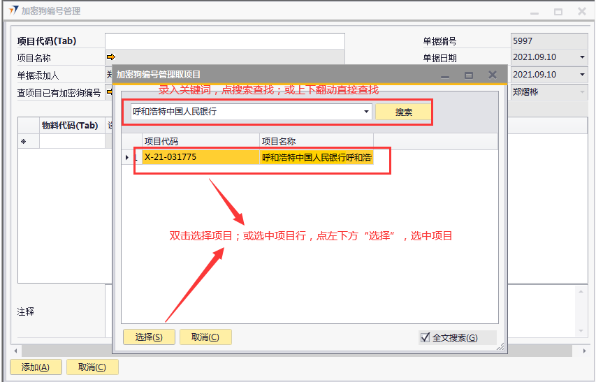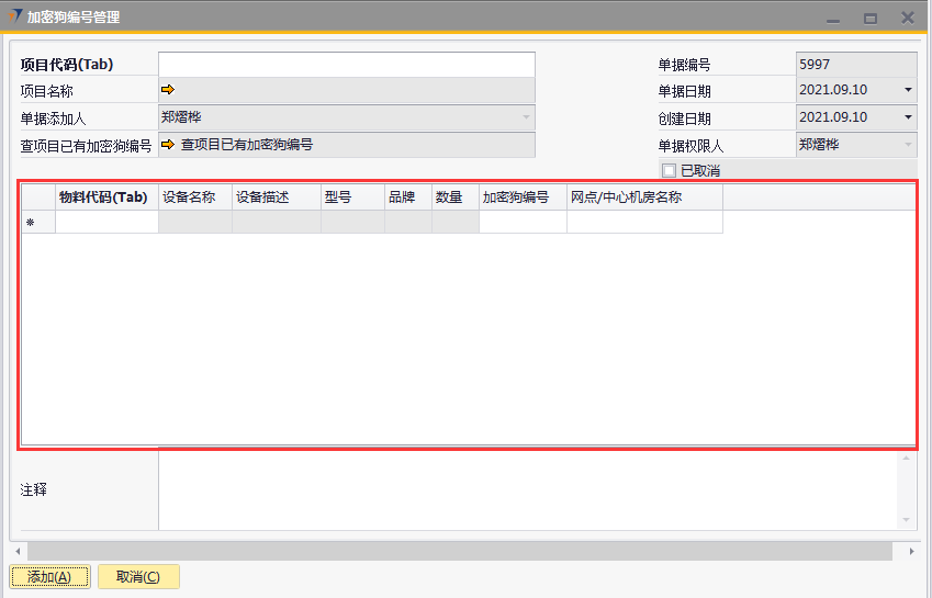 # 1 目的与作用 为了指导和规范发货人员加密狗编号管理,提升效率,规范管理 # 2 界面介绍 路径:日常事务管理 → 加密狗编号管理  # 3 操作说明 ## 3.1 表头  说明: * + **项目代码:**必填,按Tab选择,选择要录入加密狗编号的项目 + **项目名称:**必填,选择项目代码时,系统会自动带出,不能录入也不能修改 + **已取消:**新建时不允许录入,如果单据取消,则会显示打勾 ## 3.2 表体  说明: * + **物料代码:**必填,按Tab选择,选择要录入加密狗编号的物料 + **设备名称、设备描述、型号、品牌、数量:**选择物料代码时,系统会自动带过来,不能录入也不能修改 + **加密狗编号:**必填,加密狗编号 + **网点/中心机房名称:**必填,机房名称 ## 3.3 操作步骤 ### 3.3.1 录入表头信息 1. 鼠标定位到项目编号,再按Tab键,会调取出来当前账号权限范围内的所有可做客户资料修改的客户  2. 关键词搜索或直接鼠标滚动查找本次要做加密狗编号管理的项目,双击选择或选中后点左下方**选择**,选择项目  3. 系统会自动带过来项目相关内容  ### 3.3.2 录入表体信息 鼠标定位到物料代码,按Tab选择物料代码,录入加密狗编号、机房名称,相关信息录入完整无误后,点“添加”提交  # 4 注意事项 只有需求(同一物料编号订单数量+增项-减项)中有加密狗的项目才能录入加密狗编号管理