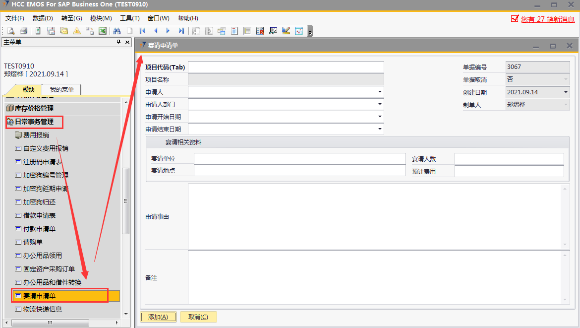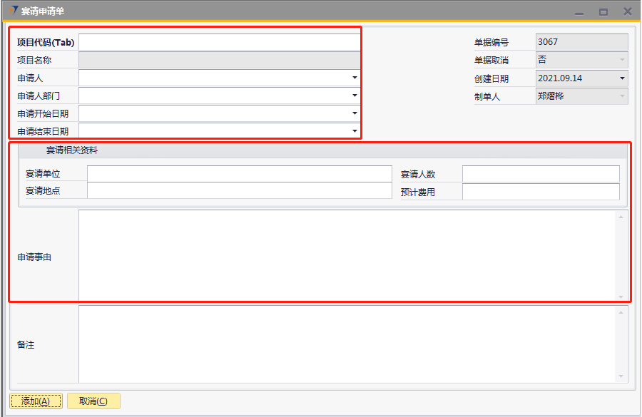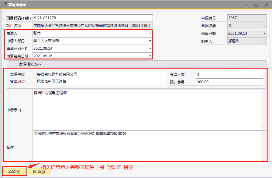 # 1 目的与作用 为了指导和规范工程人员、售后人员宴请申请单录入,提升效率,规范管理 # 2 界面介绍 路径:日常事务管理 → 宴请申请单  # 3 操作说明 ## 3.1 表单  说明: * + **项目代码:**必填,按Tab选择,选择宴请项目代码 + **项目名称:**必填,选择项目代码后,系统会自动带出,不允录入也不允许修改 + **申请人:**必填,申请人姓名 + **申请人部门:**必填,申请人部门 + **申请开始日期:**选填,申请开始日期 + **申请结束日期:**选填,申请结束日期 + **宴请单位:**必填,宴请单位名称 + **宴请地点:**必填,宴请地点 + **宴请人数:**必填,宴请人数 + **预计费用:**必填,宴请所需经费 + **申请事由:**必填,宴请原因 + **备注:**选填,需要说明的其他事项 ## 3.2 操作步骤 1. 鼠标定位到项目代码,再按Tab键,会调取出来当前账号权限范围内的所有可做宴请申请的项目  2. 关键词搜索或直接鼠标滚动查找本次要宴请申请的项目,双击选择或选中后点左下方**选择**,选择项目  3. 选择项目代码后,项目名称会一起带出,录入申请人、申请人部门、申请开始日期、申请结束日期、宴请单位、宴请地点、宴请人数、预计费用、申请事由、备注,相关信息录入完整无误后,点“添加”提交  # 4 注意事项 无