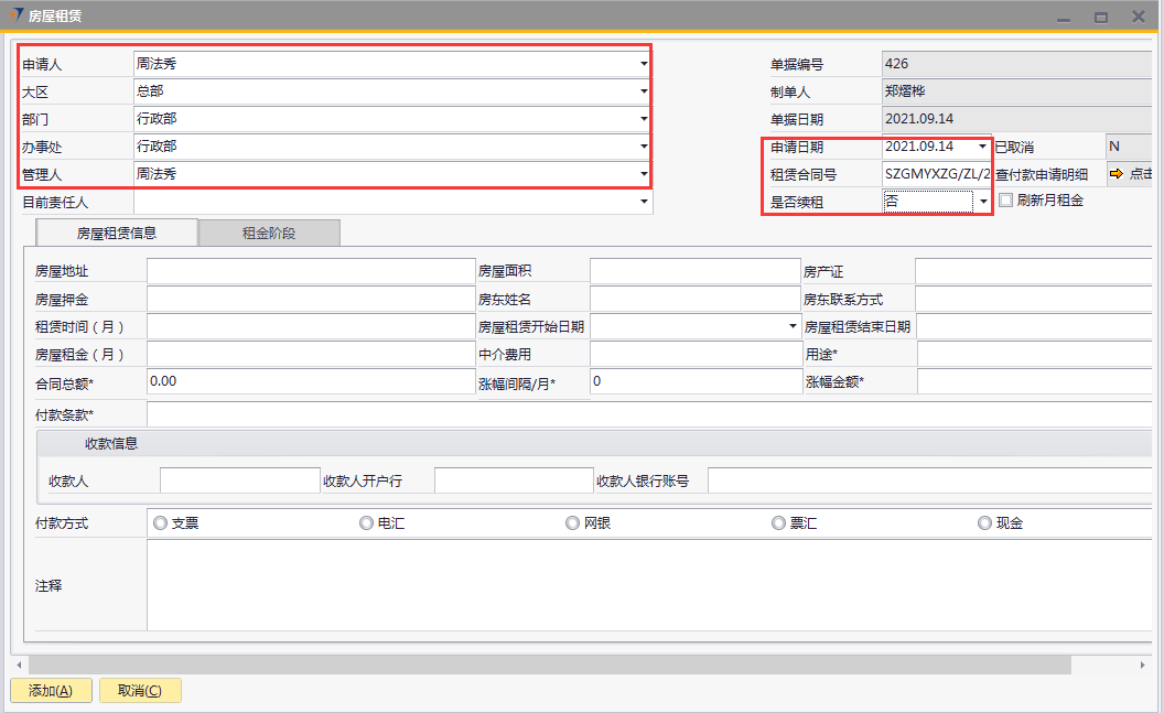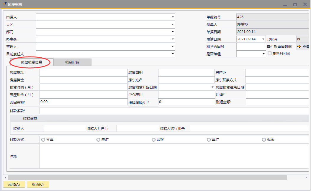 # 1 目的与作用 为了指导和规范相关人员房屋租赁单录入,提升效率,规范管理 # 2 界面介绍 路径:日常事务管理 → 房屋租赁  # 3 操作说明 ## 3.1 表头  说明: * + **申请人:**必填,选择申请人 + **大区:**必填,选择申请人所属大区 + **部门:**必填,选择申请人所在部门 + **办事处:**必填,选择申请人所属办事处 + **管理人:**必填,租赁房屋管理人 + **目前责任人:**必填,租赁房屋目前责任人 + **申请日期:**必填,申请日期 + **租赁合同号:**必填,租赁合同号 + **是否续租:**必填,是否续租,如果是选**是**,如果不是选**否** + **刷新月租金:**选填,用于刷新**租金阶段**页签的月租金,当**租金阶段**页签有修改单价时使用 ## 3.2 表体 ### 3.2.1 房屋租赁申请  说明: * + **房屋地址:**必填,房屋的详细地址 + **房屋面积:**必填,房屋面积 + **房产证:**必填,房产证号 + **房屋押金:**必填,房屋押金 + **房东姓名:**必填,房东姓名 + **房东联系方式:**必填,房东联系方式 + **租赁时间(月):**必填,房屋租赁时间,以月为单位 + **房屋租赁开始日期:**必填,房屋租赁开始日期 + **房屋租赁结束日期:**必填,房屋租赁结束日期 + **房屋租金(月):**必填,房屋租金,以月为单位 + **中介费用:**必填,租赁房屋所付中介费用 + **用途:**必填,租赁房屋用途,下拉框选择。总共11个用途类型,其中**宿舍、车位、集装箱、项目宿舍、人才公寓、其他类型**必须做租金分摊单,否则无法报销 + **合同总额:**必填,必须大于0,合同的总金额,不含中介费、押金等 + **涨幅间隔/月:**必填,系统默认为0,此合同多少个月涨一次租金,当合同有规律的涨幅时填入,无涨幅或无规律时,填0 + **涨幅金额:**必填,此合同每一次涨幅的金额是多少,无涨幅或无规律时,填0 涨幅金额是刷新**租金阶段**页签的字段,所以务必最后填写 * + **付款条款:**必填,合同付款条款 收款信息 * + **收款人:**必填,收款人,准确无误录入 + **收款人开户行:**必填,收款人开户行,准确无误录入 + **收款人银行账号:**必填,收款人银行账号,,准确无误录入 + **付款方式:**必填,付款方式,必须选择一种 + **注释:**选填,需要说明的相关事项 ### 3.2.2 租金阶段  说明: * + **物料代码:**必填,按Tab选择,选择要录入加密狗编号的物料 + **行号:**必填,第一个页签填入对应数据后自动生成,每个自然月一行 + **日期从:**必填,第一个页签填入对应数据后自动生成,每个自然月的开始日期,第一行除外,第一行为合同开始日期 + **日期到:**必填,第一个页签填入对应数据后自动生成,每个自然月的结束日期,最后一行除非,最后一个为合同结束日期 + **年份:**必填,第一个页签填入对应数据后自动生成,此行的年份 + **月份:**必填,第一个页签填入对应数据后自动生成,此行的月份 + **天数:** 必填,第一个页签填入对应数据后自动生成,此行占用的天数 + **基础租赁:**必填,第一个页签填入对应数据后自动生成,等于第一个页签的租金 + **单据:**必填,第一个页签填入对应数据后自动生成,等于基础租金加上涨幅 + **修改单价:**选填,默认为空,如果需要修改单价,则可以在此字段填入,填入后勾选表头的刷新月租金,会自动重算数据,请谨慎填入 + **月租金:**必填,第一个页签填入对应数据后或勾选刷新月租金后自动生成,整月的行等于单价,不足一个月的行等于=单价或修改单价/本月天数*天数,最后一行=合同总额-前面所有行月租金合计 + **备注:**选填,需要说明的相关事项 **注意:**如果租赁合同有涨幅、并且涨幅毫无规律,可以手工弄好excel直接导入 ## 3.3 操作步骤 ### 3.3.1 录入表头信息 录入表头申请人、大区、部门、办事处、管理人、申请日期、租赁合同号、是否续租  ### 3.3.2 录入表体信息 #### 3.3.2.1 录入房屋租赁信息 录入房屋租赁信息所有字段内容,其他字段录入完成后,**最后**录**涨幅金额**字段,这样**租金阶段**页签内容才会自动拆分和填充  #### 3.3.2.2 检查租金阶段 检查租金阶段内容,如果单价需要修改,在“修改单价”栏位录入调整,如需要说明在“备注”栏位说明。相关数据录入完整无误后,点“添加”提交  # 4 注意事项 1. 涨幅金额是刷新【租金阶段】页签的字段,所以务必最后填写,然后再去检查【租金阶段】页签相关数据 2. 若无涨幅,涨幅间隔/月、涨幅金额均填0 3. 【租金阶段】页签月租金的合计必须等于合同总额,如果不相等,请检查【房屋租赁信息】页签数据是否填入有误 4. 若合同涨幅无规律时,【租金阶段】页签可以用EXCEL导入 5. 若单价需要修改时,可以手动填入修改单价,然后点击单据头的“刷新月租金”,如果不小心点错刷新了,可以到【房屋租赁信息】页签重新输入涨幅金额或者填入0