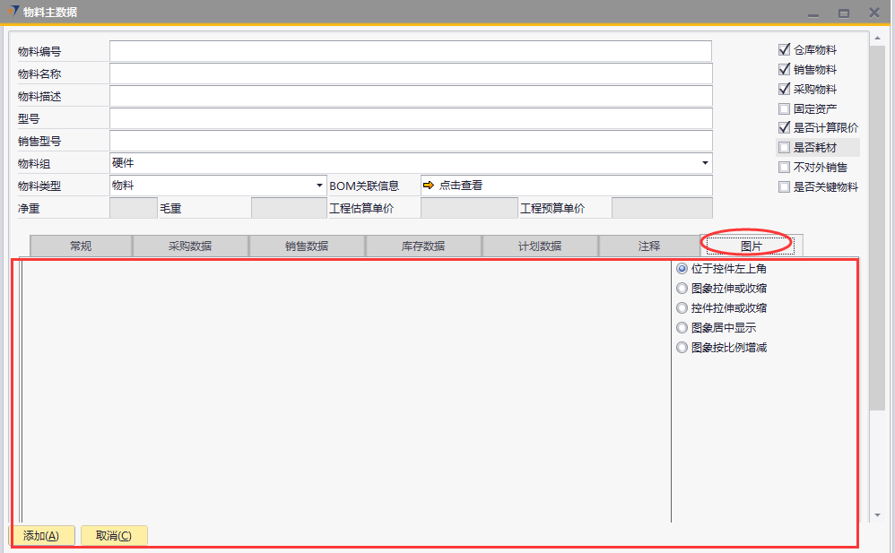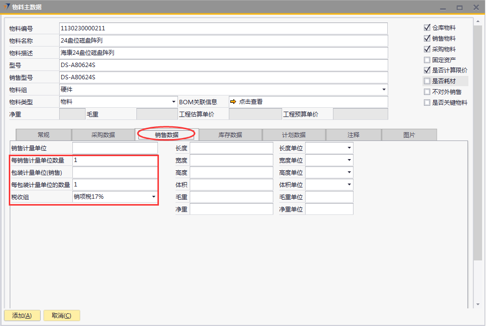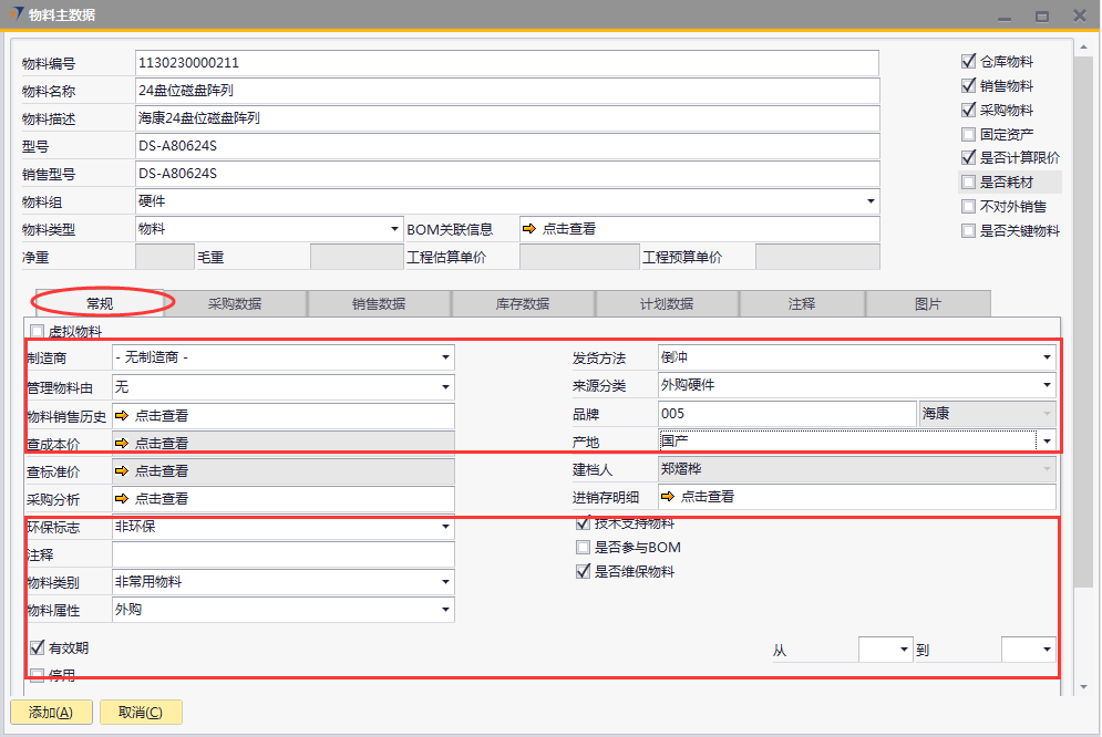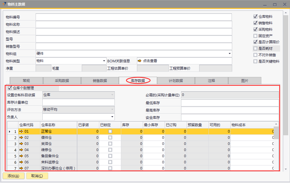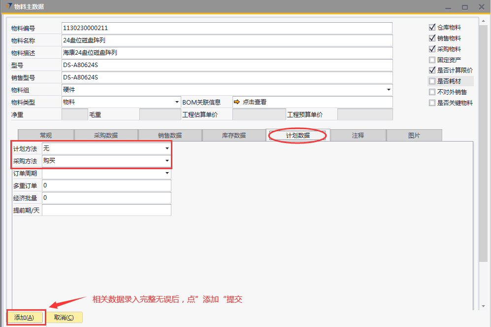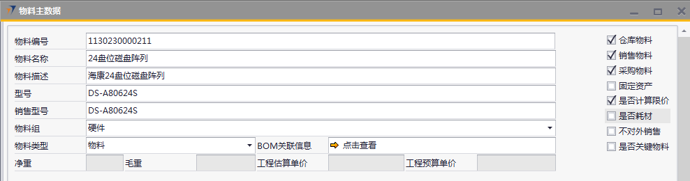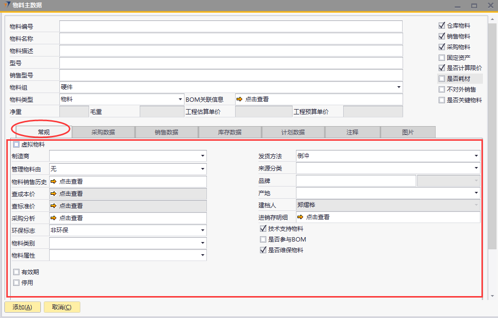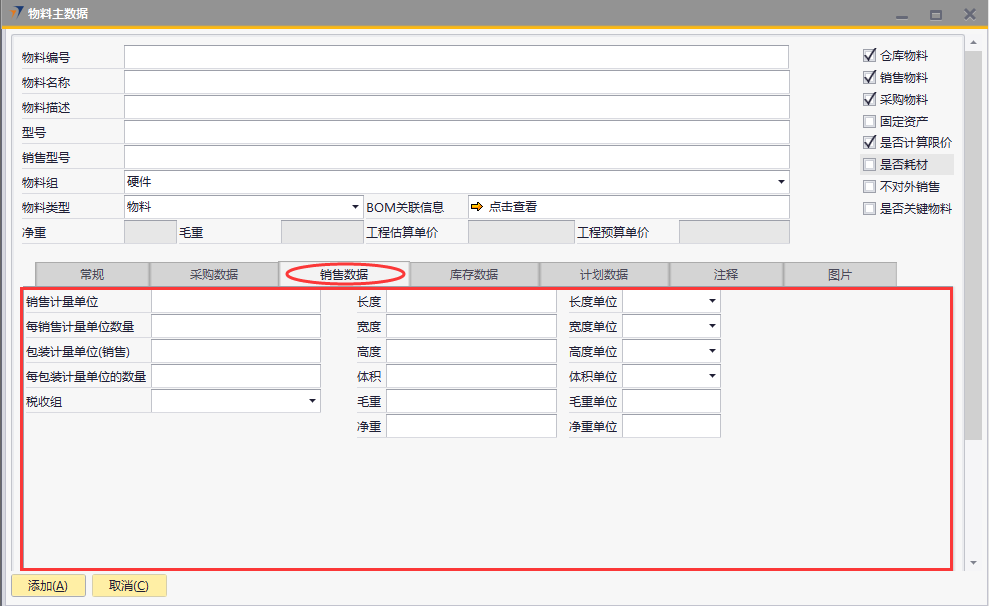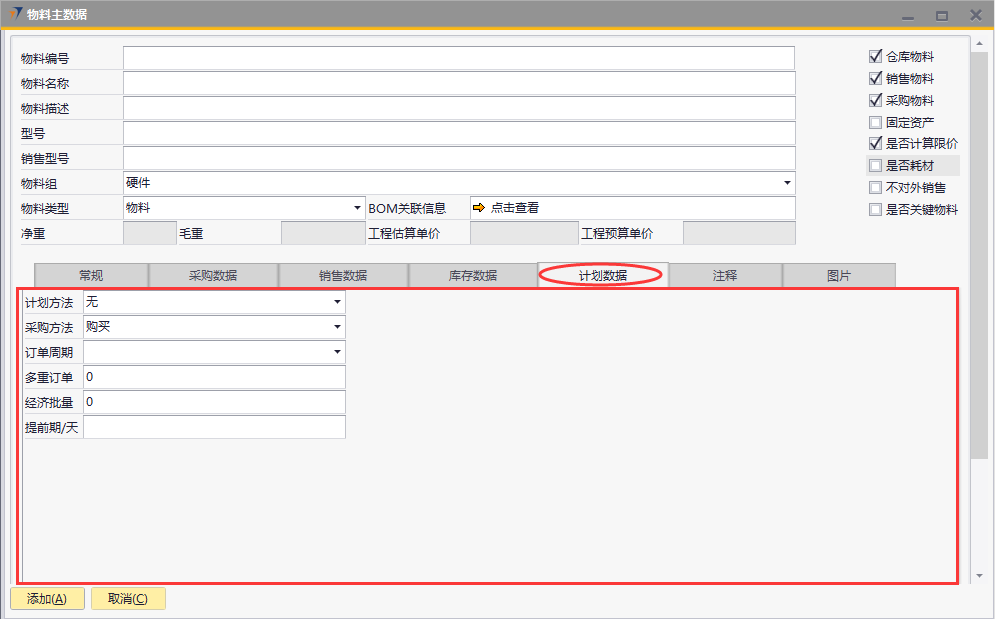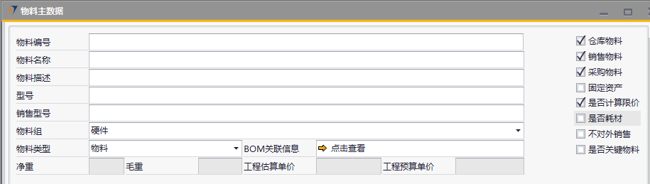 # 1 目的与作用 为了指导和规范相关人员物料主数据录入,提升效率,规范管理 # 2 界面介绍 路径:库存价格管理 → 物料主数据  # 3 操作说明 ## 3.1 表头  说明: * + **物料编号:**必填,按规格录入物料编号 + **物料名称:**必填,详细无误的物料名称 + **物料描述:**必填,详细无误的物料描述 + **型号:**选填,详细无误的物料型号 + **销售型号:**选填,对外销售的物料型号 + **物料组:**必填,物料分组 + **物料类型:**必填,物料类型 + **净重、毛重、工程估算单价、工程预算单价:**选填,从其它单据回写数据过来,新建时不允许录入 + **仓库物料:**默认打勾,如果物料不是仓库物料,取消打勾 + **销售物料:**默认打勾,如果物料不是销售物料,取消打勾 + **采购物料:**默认打勾,如果物料不是采购物料,取消打勾 + **固定资产:**默认不打勾,如果物料是固定资产,打勾 + **是否计算限价**:默认打勾,一般不修改 + **是否耗材:**默认不打勾,新建时不允许录入,如果需要转耗材走物料转耗材申请单 + **不对外销售:**默认不打勾,如果物料不对外销售,取消打勾 + **是否关键物料:**默认不打勾,如果物料是关键物料,打勾 ## 3.2 表体 ### 3.2.1 常规  说明: * + **虚拟物料:**默认不打勾,如果是虚拟物料,打勾 + **制造商:**选填,物料制造商 + **管理物料由:**必填,默认为无,有无、序列号、批次三种管理方法 + **环保标志:**必填,默认非环保 + **物料类别:**选填,有常用物料、非常用物料、项目专用三种选择 + **物料属性:**选填,有OEM、外购、自研三种选择 + **发货方法:**必填,有倒冲和手工两种选择 + **来源分类:**选填,有共济软件、共济硬件、外购软件、外购硬件四种选择 + **品牌:**选填,物料品牌 + **产地:**选填,物料产地 + **技术支持物料:**默认打勾,如果不是技术支持物料,取消打勾 + **是否参与BOM:**默认不打勾,如果参考BOM计算,打勾 + **是否维保物料:**默认打勾,如果不是维保物料,取消打勾 + **有效期:**默认不打勾,新建时需要打勾,这样物料才能正常使用 + **停用:**默认不打勾,新建时默认状态即可。如果勾选停用,则物料不能正常使用 ### 3.2.2 采购数据  说明: * + **首选供应商:**选填,按Tab可选择首选供应商 + **采购计量单位:**采购时计量单位 + **每采购单位数量:**每个采购单位的物料数量 + **包装计量单位(采购):**采购包装单位,它是计量单位的倍数 + **每包装计量单位的数量:**定义每包装单位的数量 + **关税组:**如果进口采购物料,请输入关税组。这样,就可以计算关税费用 + **税收组:**税收组以及采购物料时的应税税率 + **采购经理:**物料采购经理 + **价格来源:**采购物料价格来源 + **采购备货周期:**采购备货的周期 + **长度、宽度、高度、体积、毛重、净重:**指的是采购单位,而不是基本单位,物料采购时的长度、宽度、高度、体积、毛重、净重 ### 3.2.3 销售数据  说明: * + **销售计量单位:**销售时计量单位 + **每销售单位数量:**每个销售单位的物料数量 + **包装计量单位(销售):**销售包装单位,它是计量单位的倍数 + **每包装计量单位的数量:**定义每包装单位的数量 + **税收组:**税收组以及销售物料时的应税税率 + **采购经理:**物料采购经理 + **长度、宽度、高度、体积、毛重、净重:**指的是销售单位,而不是基本单位,物料销售时的长度、宽度、高度、体积、毛重、净重 ### 3.2.4 库存数据  说明: * + **仓库个别管理:**选择该字段可以定义最小和最大库存数量的计算方法 + **设置总账科目依据:**默认为仓库,不允许修改 + **库存计量单位:**必填,管理库存的单位类型 + **评估方法:**默认为移动平均,不允许修改。移动平均,该方法的依据是计算每个销售和采购交易中物料的平均成本 + **负责人:**仓库负责人 + **必需的(采购计量单位):**保持最小库存水平的必需数量 + **最低库存:**最小库存水平 + **最高库存:**最高库存水平 + **安全库存:**安全库存水平 + 明细行显示物料在对应仓库的详细情况 ### 3.2.5 计划数据  说明: * + **计划方法:**有无和MRP两种选择 无 — 不通过 MRP 计划物料采购,并且不为物料创建任何生产订单或采购订单建议 MRP — 使用 MRP 系统计划物料采购 * + **采购方法:**有购买和生产两种选择 + **订单周期:**订单间的时间间隔 + **多重订单:**输入数字值以定义MRP的批次大小,如果该值为12,则用订购的物料乘以12。因此,如果您需要20个物料,并且值为12,则 MRP 建议订购24个物料 + **经济批量:**最小批次大小 + **提前期/天:**从订购物料到接收或生产物料之间的天数 ### 3.2.6 注释  说明: * + 物料相关的备注说明 ### 3.2.7 图片  说明: * + 可以为物料插入、导出、浏览与物料相关的图片 ## 3.3 操作步骤 ### 3.3.1 录入表头信息  ### 3.3.2 录入表体信息 #### 3.3.2.1 录入常规信息  #### 3.3.2.2 录入采购数据  #### 3.3.2.3 录入销售数据  #### 3.3.2.4 录入库存数据  #### 3.3.2.5 录入计划数据 录入计划数据,相关数据录入完整无误后,点“添加”提交  # 4 注意事项 无
