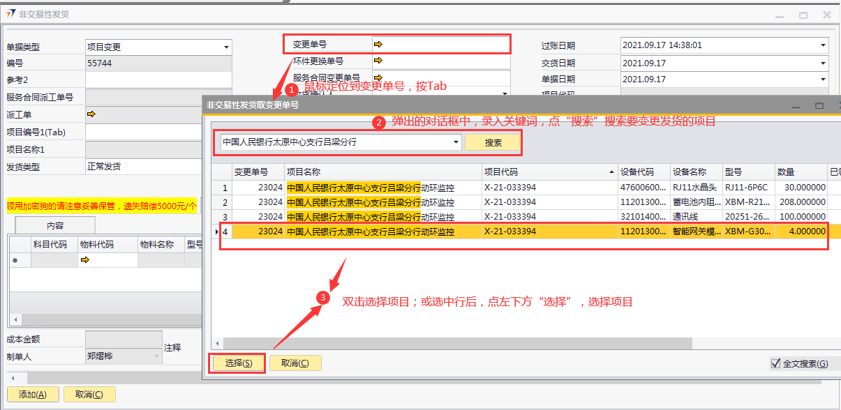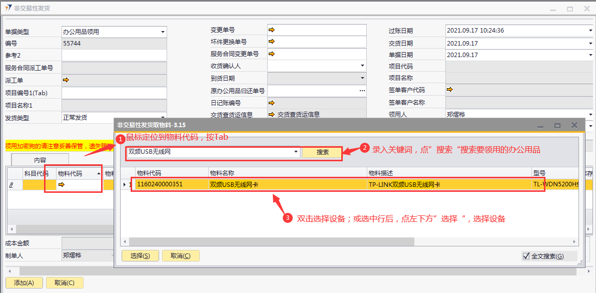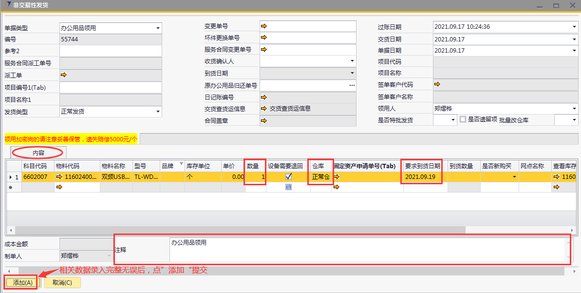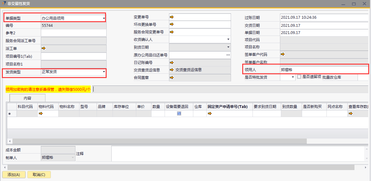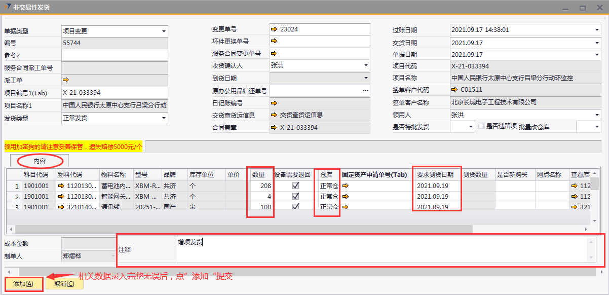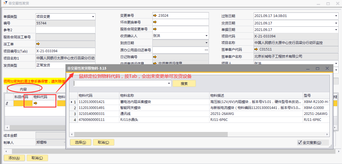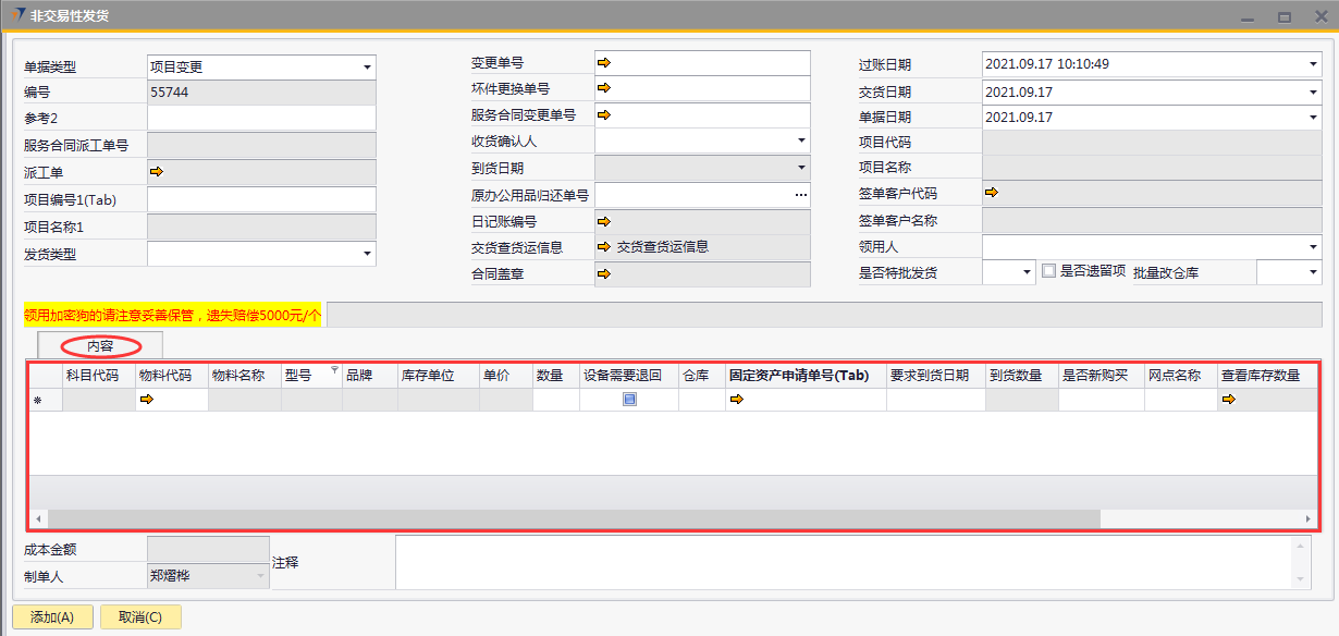 # 1 目的与作用 为了指导和规范相关人员非交易性发货单录入,提升效率,规范管理 # 2 界面介绍 路径:库存价格管理 → 非交易性发货  # 3 操作说明 ## 3.1 表头  说明: * + **单据类型:**必选,目前有十三种类型,发货时,**一定要选对单据类型**,类型如下 项目变更:项目增项变更发货,**一定要**关联“变更单号”或“服务合同变更单号” 坏件更换:坏件更换发货,**一定要**关联“坏件更换单号” 维保领料:售后服务部维保领料 在建工程领用:一般用于展厅设备领用 研发领用设备:研发设备领用 外发加工设备出库:仓库外发加工设备领用 维修领用设备:维修设备领用 库存调账:用于盘亏调账 耗材领用:耗材领用 固定资产领用:固定资产领用,明细行里**一定要**关联“固定资产申请单” 办公用品领用:办公用品领用 存货转固定资产:存货转固定资产,此类型暂时未启用 不能回收的设备领用:不能回收的设备领用,此类型暂时未启用 * + **项目编号、项目名称:** **单据类型**是项目变更、坏件更坏,选择**变更单号/服务合同变更单号、坏件更换单号**,系统会自动带出项目编号和项目名称,不需要录入也不需要修改; **单据类型**是维保领料、在建工程领用,必须录入项目编号、项目名称,按Tab选择项目编号,项目名称会自动带出 **单据类型**是研发领用设备、外发加工设备出库、维修领用设备、库存调账、耗材领用,跟项目有关的,按Tab选择项目编号,项目名称会自动带出 **单据类型**是固定资产领用、办公用品领用,不关联项目编号、项目名称 * + **变更单号:**单据类型是项目变更且是X项目变更时,必填,按Tab选择 + **坏件更换单号:**单据类型是坏件更换时,必填,按Tab选择 + **服务合同变更单号:**单据类型是项目变更且是W项目变更时,必填,按Tab选择 + **收货确认人:**必填,发货单收货确认人 + **过账日期:**必填,系统默认当天,不修改 + **交货日期:**必填,系统默认当天,可修改 + **单据日期:**必填,系统默认当天,不修改 + **领用人:**必填,设备领用人 + **是否特批发货:**如果是项目变更发货,必填 + **是否遗留项:**如果是遗留项发货,必打勾 + **批量改仓库:**如果需要批量修改表体明细行中仓库,明细行录入后,选批量改仓库,所选仓库会自动刷新到明细行 ## 3.2 表体  说明: * + **物料代码:**必填,按Tab选择。单据类型如果是**项目变更、坏件更换**,应先选择变更单号/服务合同变更单号、坏件更换单号,表体明细行会关联对应单号明细内容 + **物料名称、型号、品牌、库存单位、单价:**选择物料代码后,系统会自动带过来,不能录入也不允许修改 + **数量:**必填,物料发货数量 + **设备需要退回:**默认打勾,一般不修改,如果特殊物料不需要退回去掉打勾 + **仓库:**必填,发货仓库 + **固定资产申请单号:**单据类型是固定资产领用,必填,按Tab选择 + **要求到货日期:**必填,设备要求到货日期 + **是否新购买:**选填,默认为空,如果是新购买录选**是** + **网点名称:**选填,联网项目时使用,目前可不录入 ## 3.3 操作步骤 以办公用品领用、X项目变更增项发货为例 ### 3.3.1 办公用品领用 1. 单据类型选择**办公用品领用**,录入发货类型、领用人  2. 鼠标定位到物料代码,按Tab 弹出的对话框中,录入关键词,点“搜索”搜索要领用的办公用品 双击选择设备;或选中行后,点左下方“选择”,选择设备  3. 录入数量、仓库、要求到货日期,录入注释,相关数据录入完整无误后,点“添加”提交  ### 3.2 项目变更增项发货 1. 单据类型选择**项目变更**,录入发货类型、领用人  2. 鼠标定位到变更单号,按Tab 弹出的对话框中,录入关键词,点“搜索”搜索要变更发货的项目 双击选择项目;或选中行后,点左下方“选择”,选择项目  3. 变更单号选中后,项目编号、项目名称相关信息会带出来  4. 变更单号选中后,项目编号、项目名称相关信息会带出来 鼠标定位到明细行物料代码,按Tab,会出来变更单可发货设备  5. 选择要发货设备,录入数量、仓库、要求到货日期,录入注释 相关数据录入完整无误后,点“添加”提交  # 4 注意事项 非交易性发货单,一定要选择正确的单据类型,单据类型的选择影响到发货后的后续单据操作和相关报表的数据准确性