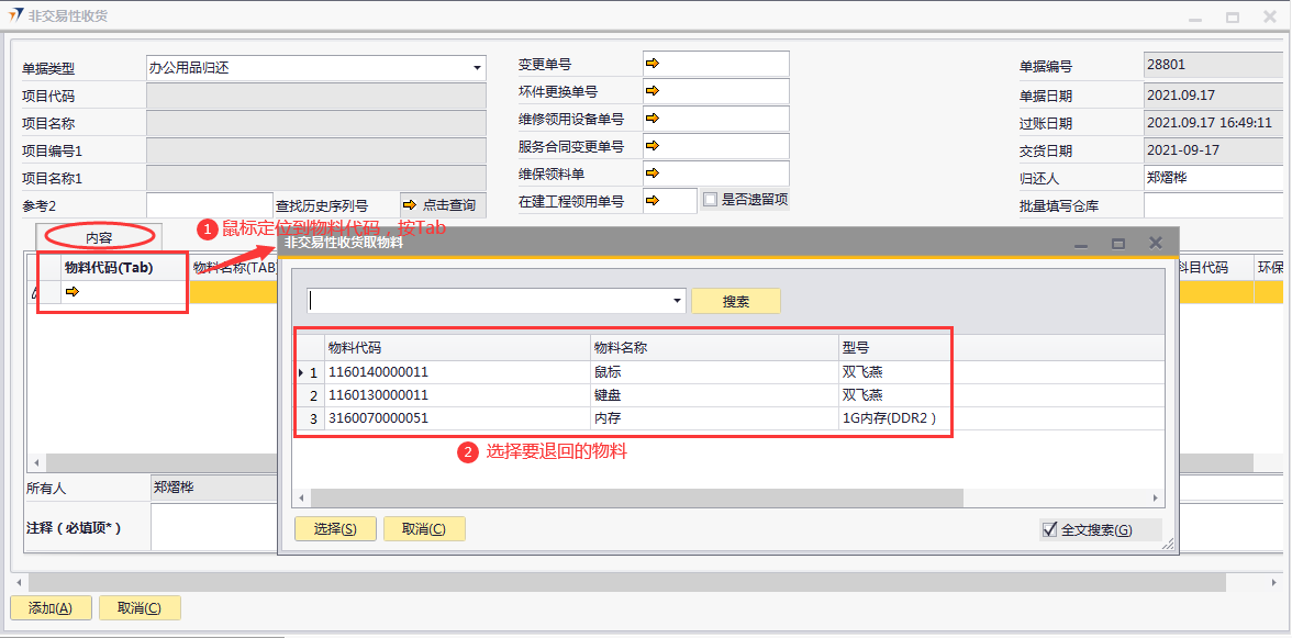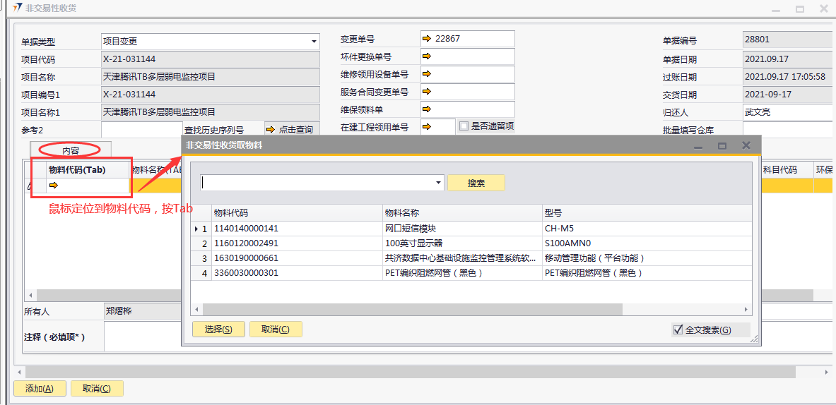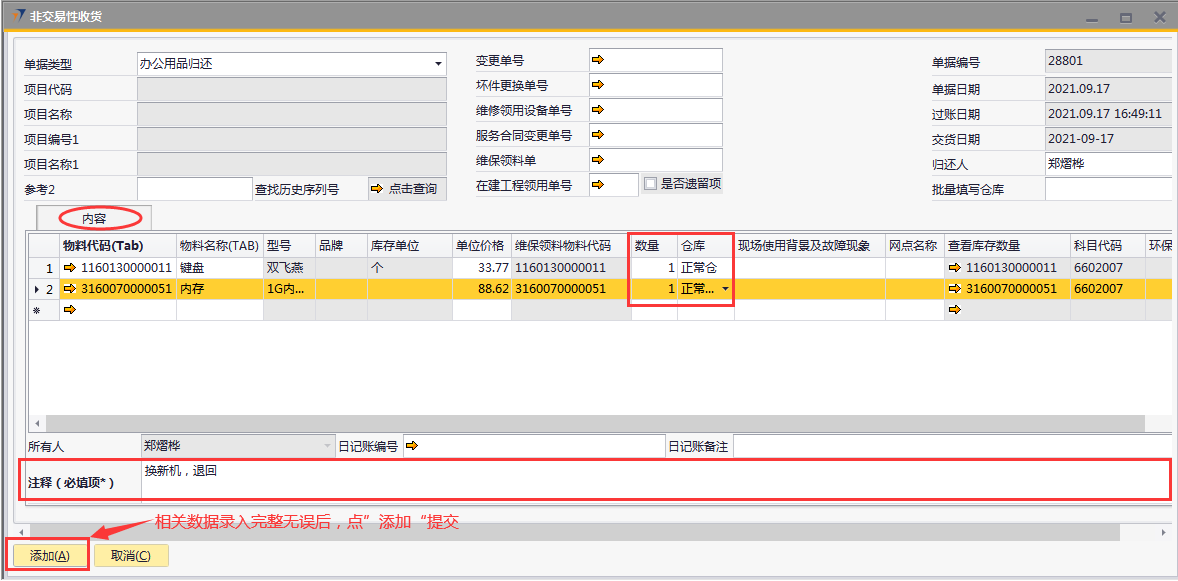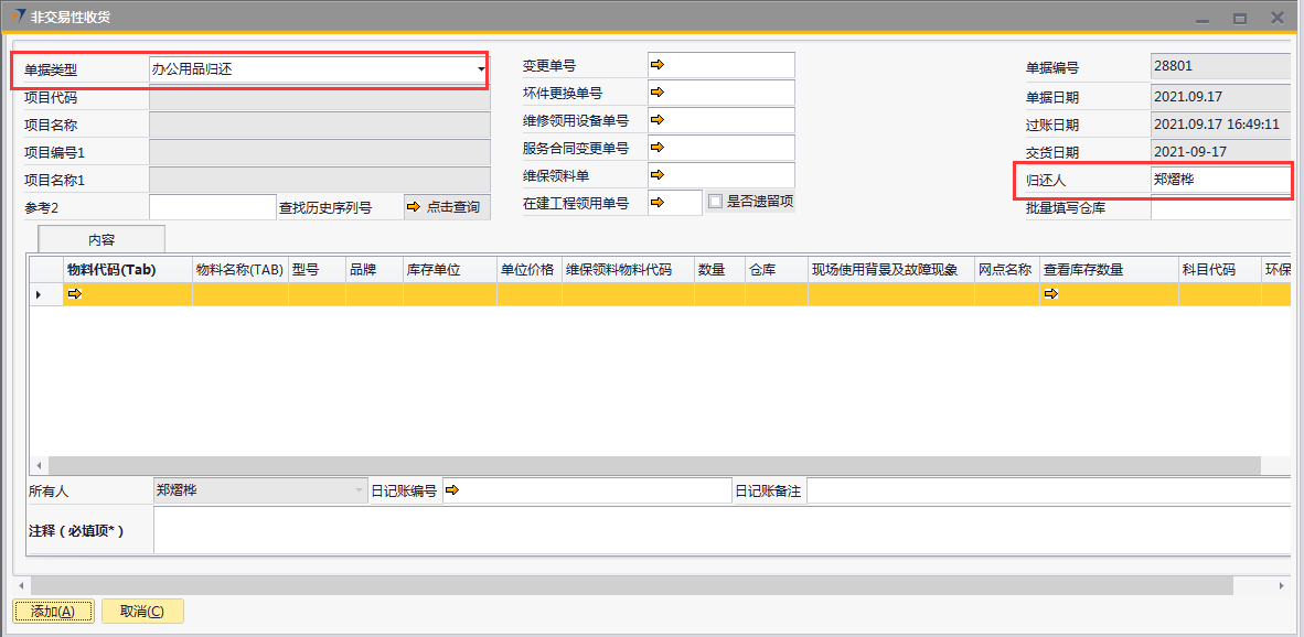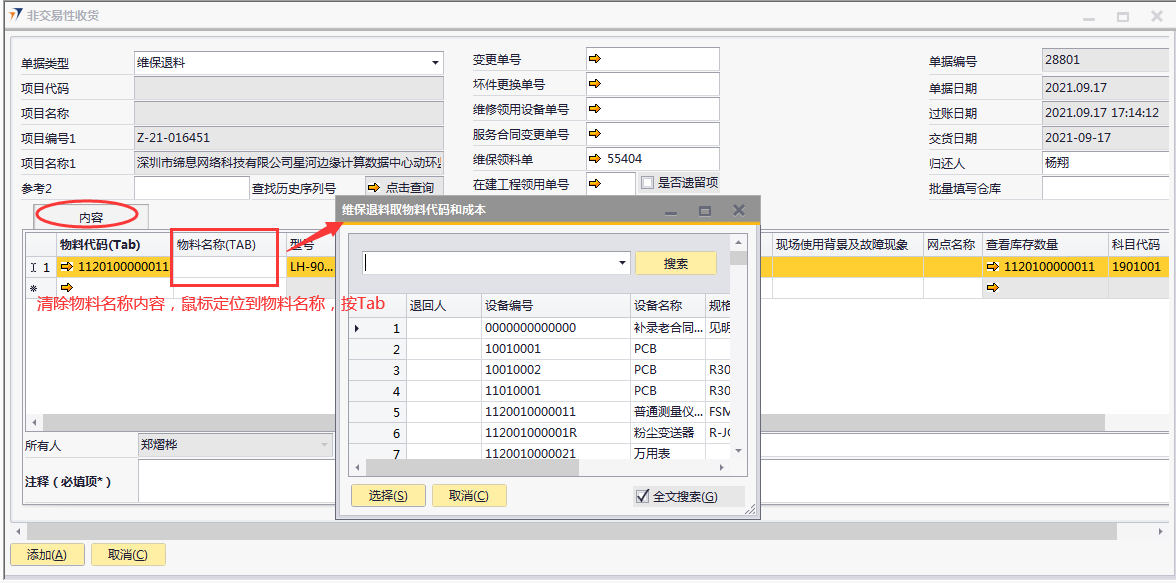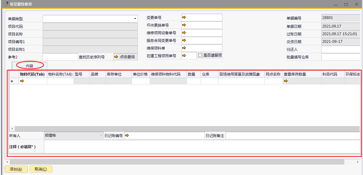 # 1 目的与作用 为了指导和规范相关人员非交易性收货单录入,提升效率,规范管理 # 2 界面介绍 路径:库存价格管理 → 非交易性收货  # 3 操作说明 ## 3.1 表头  说明: * + **单据类型:**必选,目前有十三种类型,发货时,**一定要选对单据类型**,类型如下 项目变更:项目增项变更收货,**一定要**关联“变更单号”或“服务合同变更单号” 坏件更换:坏件更换发货,**一定要**关联“坏件更换单号” 维保退料:售后服务部维保退料,**一定要**关联“维保领料单号” 在建工程退回:在建工程设备退回,**一定要**关联“在建工程领用单号” 维修退回设备:维修设备退回,**一定要**关联“维修领用设备单号” 研发领用退还:研发领用设备退还 办公用品归还:**一定要**先选择办公用品归还并录入领用人,明细行才会选到领用人对 应领用办公用品 库存调账:用于盘赢调账 耗材退回:耗材退回 固定资产入库:固定资产入库 换货:此类型暂时未启用 其他:此类型暂时未启用 * + **项目编号、项目名称:** **单据类型**是项目变更、坏件更坏、维保退料、在建工程退回、维修退回设备,选择**变更单号/服务合同变更单号、坏件更换单号、维保领料单、在建工程领用单号、维修领用设备单号**,系统会自动带出项目编号和项目名称,不需要录入也不需要修改 **单据类型**是研发领用归还、库存调账、耗材退回,跟项目有关的,按Tab选择项目编号,项目名称会自动带出 **单据类型**是固定资产入库、办公用品归还,不关联项目编号、项目名称 * + **变更单号:**单据类型是项目变更且是X项目变更时,必填,按Tab选择 + **坏件更换单号:**单据类型是坏件更换时,必填,按Tab选择 + **维修领用设备单号:**单据类型是维修退回设备时,必填,按Tab选择 + **服务合同变更单号:**单据类型是项目变更且是W项目变更时,必填,按Tab选择 + **维保领料单:**单据类型是维保退料时,必填,按Tab选择 + **在建工程领用单号**:单据类型是在建工程退回时,必填,按Tab选择 + **归还人:**必填,设备归还人 + **过账日期:**必填,系统默认当天,不可修改 + **交货日期:**必填,系统默认当天,不可修改 + **单据日期:**必填,系统默认当天,不可修改 + **领用人:**必填,设备领用人 + **是否遗留项:**如果是遗留项发货,必打勾 + **批量改仓库:**如果需要批量修改表体明细行中仓库,明细行录入后,选批量改仓库,所选仓库会自动刷新到明细行 ## 3.2 表体  说明: * + **物料代码:**必填,按Tab选择。单据类型如果是**项目变更、坏件更换、维保退料、在建工程退回、维修退回设备**,应先选择变更单号/服务合同变更单号、坏件更换单号、维保领料单、在建工程领用单号、维修领用设备单号,表体明细行会关联对应单号明细内容 + **物料名称、型号、品牌、库存单位、单价价格:**选择物料代码后,系统会自动带过来 + **维保领料物料代码:**如果是维保退料,选择物料代码后,系统会自动带过来 + **数量:**必填,物料收货数量 + **仓库:**必填,收货仓库 + **现场使用背景及故障说明:**单据类型是项目变更、坏件更换时,必填 + **网点名称:**选填,联网项目时使用,目前可不录入 ## 3.3 操作步骤 以办公用品归还、项目变更增项收货、维保退料为例 ### 3.3.1 办公用品退回 1. 单据类型选择**办公用品归还**,录入归还人  2. 鼠标定位到物料代码,按Tab,会出来归还人所有可以归还的物料 选择要退回的物料  3. 录入数量、仓库,录入注释,相关数据录入完整无误后,点“添加”提交  ### 3.3.2 项目变更减项收货 1. 单据类型选择**项目变更**,录入归还人 鼠标定位到变更单号,按Tab选择变更单号,选择后,会出来项目相关信息  2. 鼠标定位到物料代码,按Tab,会出来可变更减项收回的设备  3. 选择要退回设备、录入数量、仓库、现场使用背景及故障现象、注释,相关数据录入完整无误后,点“添加”提交  ### 3.3.3 维保退料 维保退料可能会有A退B的特殊业务(比如维保领一个512G硬盘A,换回2个256G硬盘B,所以维保退回时不是1个A,而是2个B),本次以A退B为例 1. 单据类型选择维保退料,录入归还人 鼠标定位到变更单号,按Tab选择维保领料单,选择后,会出来项目相关信息  2. 鼠标定位到物料代码,按Tab,会出来对应维保领料单里的设备,选择设备  3. 因为是A换B,所以维保领料物料代码不需要修改,但物料代码需要修改。 清除物料名称中内容,鼠标定位到物料名称,按Tab  4. 录入关键词,点“搜索”,查找并选择维保退回实际物料  5. 可以看到,物料代码跟维保领料代码不是同一个代码 录入数量、仓库,相关数据录入完整无误后,点“添加”提交  # 4 注意事项 1. **项目变更、坏件更换退回**只能选择工程服务部待检仓或微模块待检仓:如果项目是非微模块项目,退回工和服务部待检仓;如果项目是微模块项目,退回微模块待检仓 2. 非交易性收货单,一定要选择正确的单据类型,单据类型的选择影响到领用单的对应选择和相关报表的数据准确性