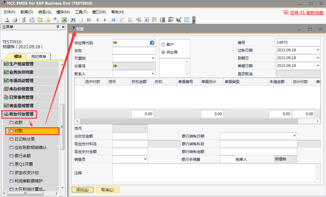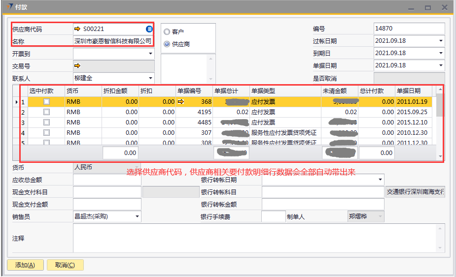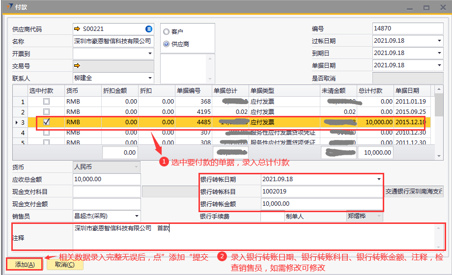 # 1 目的与作用 为了指导和规范财务人员收款单录入,提升效率,规范管理 # 2 界面介绍 路径:收款付款管理 → 付款  # 3 操作说明 ## 3.1 表头  说明: * + **供应商代码:**必填,按Tab选择 + **名称:**必填,选择供应商代码后,供应商名称会自动带出来 + **过账日期、到期日、单据日期:**必填,系统默认当天日期,如需要修改可修改,但修改日期一定要是会计期间解锁内日期 ## 3.2 表体  说明: * + 选择供应商代码后,表体明细行会带过来该供应商的应付数据,自动填充 + **货币:**默认为RMB + **折扣金额:**有折扣金额,录入 + **折扣:**系统自动计算 + **单据日期:**对应单据日期 + **单据编号:**对应单据编号 + **单据总计:**对应单据总计 + **单据类型:**有预付款、应付发票等 + **未清金额:**还未付款金额 + **总计收款:**付款金额 ## 3.3 其他  说明: * + **货币:**必填,人民币 + **应收总金额:**必填,付款金额,等于明细行总计付款总额 + **现金支付科目:**暂不录入 + **现金支付金额:**暂不录入 + **银行转账日期:**必填,录入当天日期,也可以不是当天 + **银行转账科目:**必填,转账科目,目前为交通银行 + **银行转账金额:**必填,付款金额,等于应收总金额 + **银行手续费:**选填,支付给银行的手续费 + **销售员:**必填,付款采购员 + **注释:**必填,需要说明的相关事项 ## 3.4 操作步骤 1. 选择供应商代码,供应商相关要付款明细行数据会全部自动带出来  2. 选中要付款的单据,录入总计付款 录入银行转账日期、银行转账科目、银行转账金额、注释,检查销售员,如需修改可修改 相关数据录入完整无误后,点“添加”提交  # 4 注意事项 无