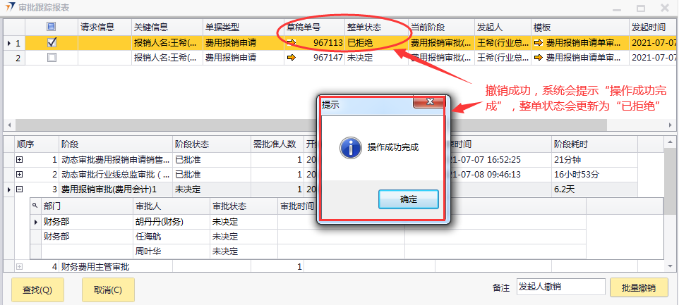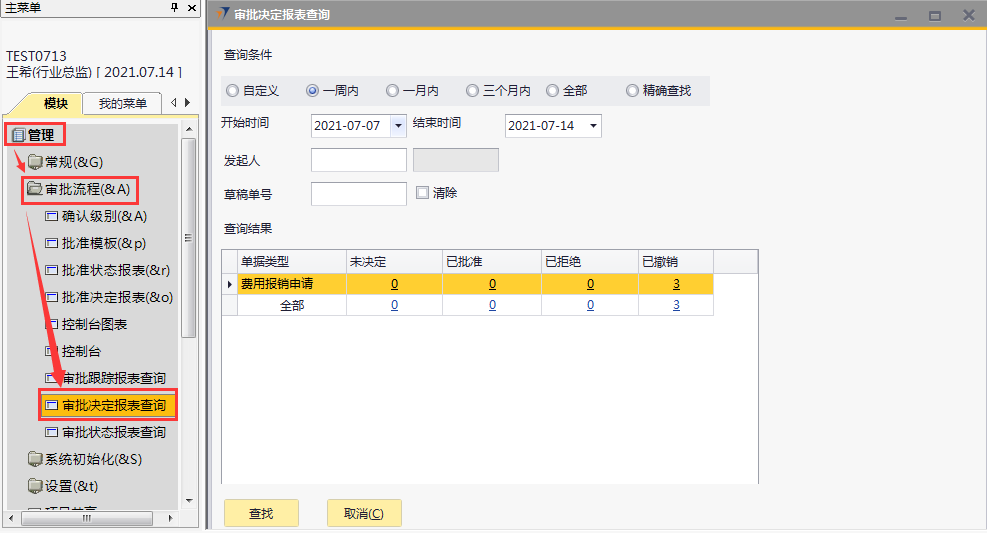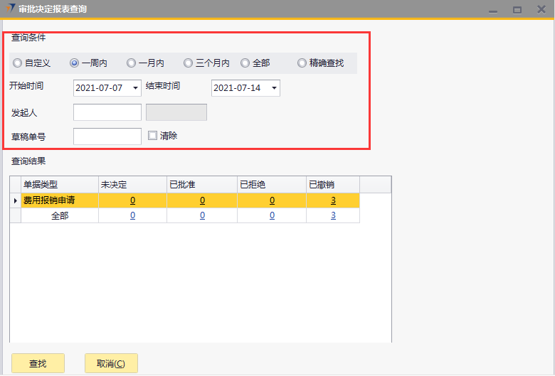 # 1 目的与作用 为了指导和规范ERP操作人员**查询自己审批的单据**审批情况 # 2 界面介绍 路径:管理 → 审批流程 → 审批决定报表查询  # 3 操作说明 先设置**查询条件**,再点左下方**查找**,可查询条件范围内所有结果 ## 3.1 查询条件  说明: * + **自定义:**自定义跟**开始时间**、**结束时间**一起用,查询自定义时间范围的单据 + **一周内:**查询一周内的单据 + **一个月内:**查询一个月内的单据 + **全部:**查询所有单据 + 查询结果显示的数字,可点击查看明细数据 ## 3.2 查询结果  说明: * + **单据类型:**单据名称 + **未决定:**已提交正在审批且未审批完的单据 + **已批准:**已经审批完成**但**未添加成正式订单的单据 + **已拒绝:**被审批人拒绝的单据 + **已生成:**已经审批完成**且**已经添加成正式订单的单据 + **已撤销:**提单人自己撤销的单据 ## 3.3 单据撤销 **未决定**状态的单据用户可随时撤销 点数字,进入到未完成审批的单据  将看到如下效果,撤销前,可点草稿单号查看草稿单据内容明细 如果需要撤销,先选定要撤销的单据那行并**打勾**,再点右下方**批量撤销**即可  撤销成功,系统会提示“操作成功完成”,整单状态也会更新为“已拒绝”