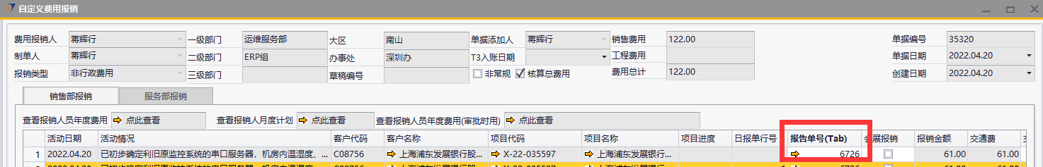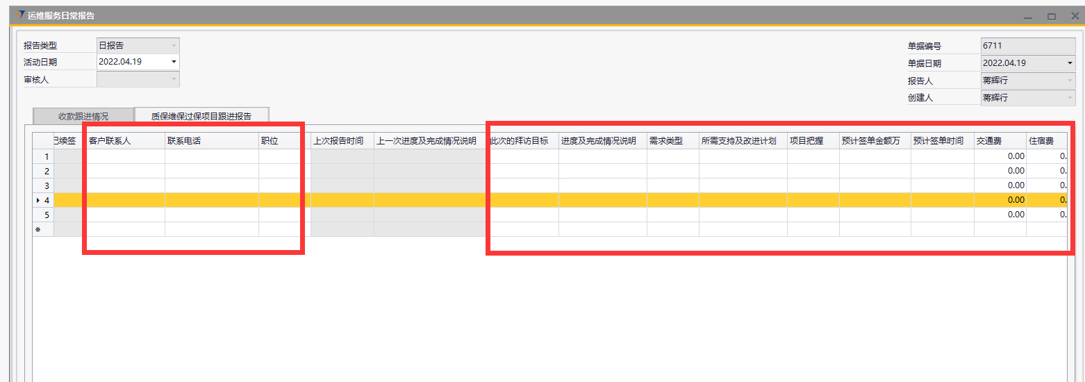 # 1 目的与作用 指导和规范运维人员质保维保过保报告、报销操作,准确快捷地录入内容,提升工作效率 # 2 整体逻辑 1. 报告单仅允许TAB未取消的报备单、销售订单、售后合同,客户仅允许TAB未冻结的;有权限控制,下级TAB自己的,上级TAB下级加自己的; 2. 报告单仅允许报告3天之内的,且同一个人、同一个日期、同一个项目、同一个客户仅允许报告一次; 3. 同一个报告单的同一行,仅允许报销一次;此报告单仅适用于自定义费用报销单;仅能TAB自己的报告单报销; # 3 运维服务日常报告 说明:售后人员用于报告项目、客户日常跟踪信息; ## 3.1 路径 路径:运维销售管理 → 运维服务日常报告 → 质保维保过保项目跟进报告 页签 注:此页签添加成功即为正式单据,无法修改,请认真填写!  ## 3.2 表头  说明: * + **创建人、单据编号、单据日期、创建日期:**系统默认,不需要录入,也不允许修改 + **审核人:**不用录,这个字段是用于之前历史页签的; + **活动日期:**必须录,即报告日期; ## 3.3 表体  说明: * + **灰色字段:TAB选择数据后,系统自动填充**; + **项目编号:**必填,TAB范围为权限范围内正常的报备单+销售订单+售后合同; + **业主单位代码:**当项目代码为空时必录,TAB范围为所有客户; + **客户联系人:**必填,联系人姓名; + **联系电话:**必填,长度必须是11位; + **职位:**必填,联系人的职位; + **此次的拜访目标:**必填,此次拜访的目标; + **进度及完成情况说明:**必填,此次拜访完成的进度及情况说明; + **其他字段:**选填,如果是费用字段,金额必须大于等于0; # 4 操作方法 ## 4.1 质保维保过保项目跟进报告操作 1. 填入活动日期后,按截图顺序按TAB选择数据,选择后,会自动填充数据;可根据项目或者客户报告,但是项目和客户不允许同时为空;    注:活动日期仅允许选择当前日期3天之内的! 2. 填入报告相关内容(客户联系人、联系电话、职位、此次的拜访目标、进度及完成情况说明为必填,其他选填),其中费用请特别注意,一定要认真填写,一次性填写正确,否则后面无法修改;  3. 可选填整体注释和行备注; 4. 检查填入的数据无误后,点击添加; 注意: (1)金额不能为负数; (2)客户联系人、联系电话、职位系统会默认带出该客户的第一个联系人信息,可修改,但是同一个客户的同一个手机号码,不允许有不同的职位和联系人姓名; (3)如果填入的联系人信息在客户档案不存在,则插入到客户档案的联系人中; ## 4.2 自定义费用报销操作 1)自定义费用报销单→销售部报销页签中,TAB时根据当前报销人加载数据,所有字段共用以前的;  注: 1、报告单号TAB,如果当前日期是10号之前,则只能TAB上个月的报告单;如果当前日期是10号之后,则只能TAB本月的报告单,所以报告单填写了费用后,请及时报销! 2、同一个报告单的同一行,仅允许报销一次; 3、仅允许报销自己的费用; 4、费用金额不可修改,自动取报告单数据; # 5 报表操作 ## 5.1 报表说明 1. 【自定义报表】→【售后服务部报表】→【客户项目跟进报告统计透视表】 2. 【OA报表】→【数据】→【M7售后维保质保过保报表】→【A2、A3、A5、A6、A8页签】 # 6 注意事项 ## 6.1 注意事项说明 1. 报告单务必一次性填正确,否则影响报告数据统计和报销; 2. 使用报告单报销时,报销金额必须小于等于报告单的合计金额; 3. 使用报告单报销是,费用名称不允许修改; 4. 如看到的界面或者字段不一样,请重新登录,或者自己往后面拖拉一下,把自己想要的字段调整到前面; 5. 报告单中的费用务必保证只有销售费用,否则造成问题,后果自负!
