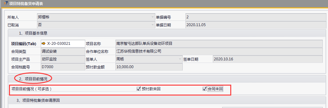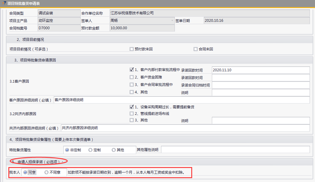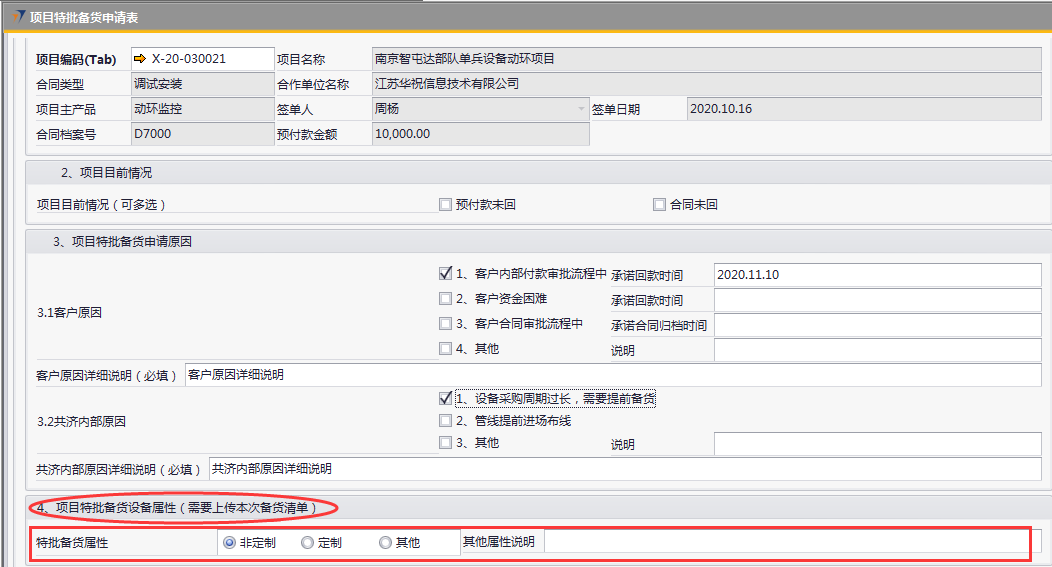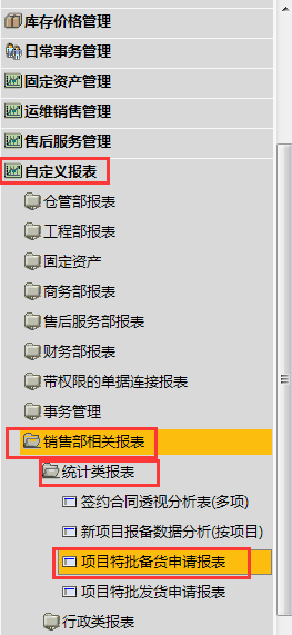 # 1 目的与作用 为了指导和规范销售人员项目特批备货,规范管理 # 2 界面介绍 路径:销售应收管理 → 项目特批备货申请表  # 3 操作说明 ## 3.1 项目特批备货申请录入 ## 3.1.1 项目基本信息  说明: * + **项目编码:**必填,Tab选择 + **项目名称**、**合同类型、合作单位名称、项目主产品、签单人、签单日期、合同档案号、预付款金额**跟**项目编码**自动带出 ## 3.1.2 项目目前情况  说明: 必填,可多选,依照项目当前实际情况填写 ## 3.1.3 项目特批备货申请原因  说明: * + 客户原因或共济内部原因,至少选择一个 + **客户原因:**可勾选多个,原因选1、2、3时,请务必录入对应日期;原因选“4、其他”时,请说明其他相关原因 + **客户原因详细说明:**如果客户原因有勾选,必须录入客户原因详细说明 + **共济内部原因:**可勾选多个,原因选“3、其他”时,请说明其他相关原因 + **共济内部原因详细说明:**如果共济内部原因有勾选,必须录入共济内部原因详细说明 ## 3.1.4 项目特批备货设备属性  说明: 必填,有三个选项,如果选择“其他”,需要在“其他属性说明”里说明情况 ## 3.1.5 申请人担保承诺  说明: 必填,选“同意”或“不同意” ## 3.1.6 客户向我司申请的依据  说明: 必填,三个选项,并按选项内容上传附件 ## 3.2 查询报表 路径:自定义报表 → 销售部相关报表 → 统计类报表 → 项目特批备货申请表