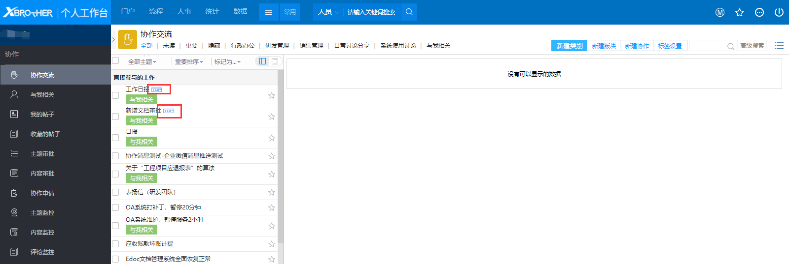 # 一、概述 拥有【协作监控】权限的人员可以在【主题监控】中对所有版块中的主题进行监控,可以结束某个主题,可以将某个主题置顶等等。 # 二、结束主题 1、在监控中结束主题是一个非常重要的工作,如图1所示,为监控人提供了两个非常有用的菜单【负责人一年未更新】和【参与人一年未更新】,对于长时间未更新的主题,就不需要在协作交流中展示,这个时候通过监控的菜单可以将这些主题结束掉。  图1 2、除了宏观上对主题进行监控外,监控人还可以将某些主题进行置顶或撤销置顶,如果置顶的话,那么被置顶的主题在协作交流的主题列表中会显示在最上面,标题后显示top字样,如图2所示。  图2