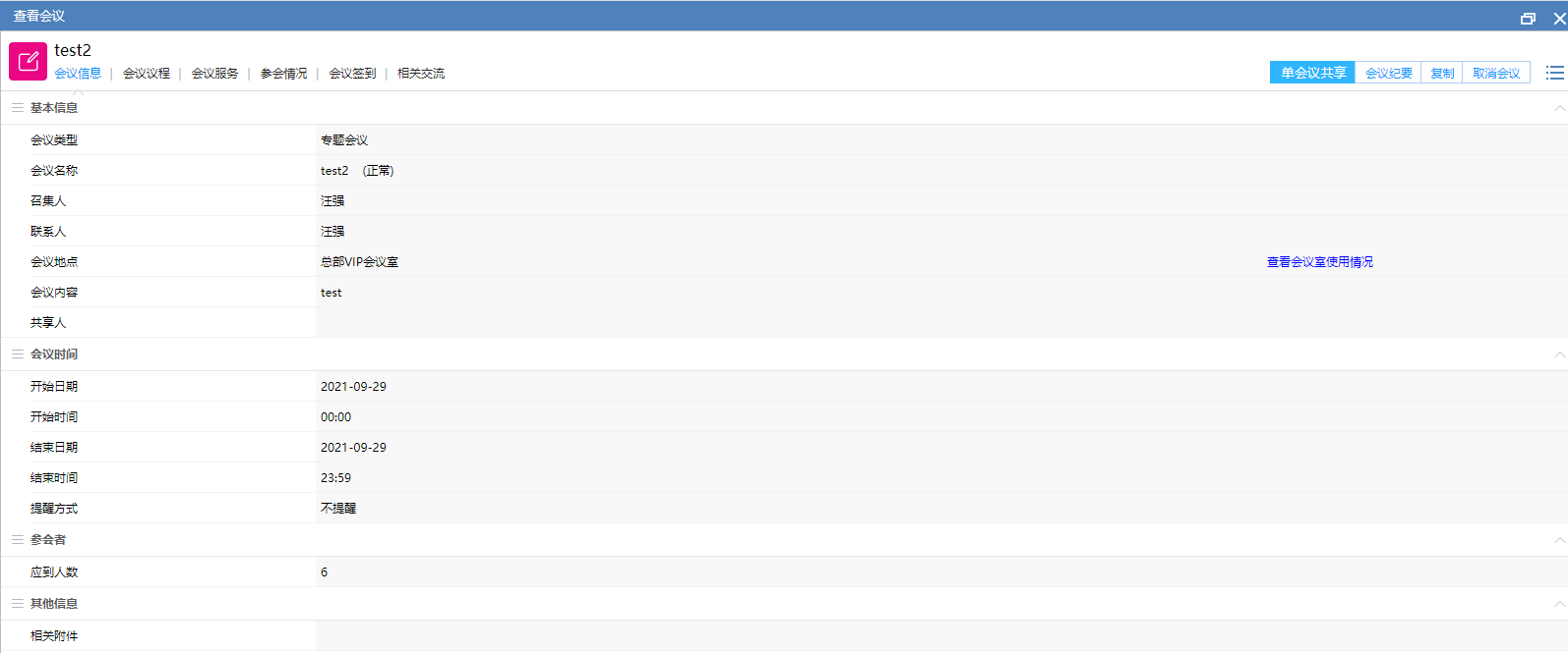 # 一、概述 会议日历是采用日历的方式显示需要参加的会议情况,这样用户可以更加清楚的了解最近时间段之内需要参加的会议,在会议日历中,除了查看会议之外还可以在日历上直接创建会议,如果有下级的话,通过人员组织列表还可以查看下属的月会议情况,如图1所示。  图1 # 二、菜单 点开会议日历之后,在顶部有一排菜单,功能如下 - :新建会议按钮,点击后可以创建会议; - :会议室使用情况按钮,点击后可以进入会议室使用报表页面,可以查看同月的会议室使用情况; - :本月按钮,因为查看日历的时候也许已经翻到其它月份了,点击此按钮之后,下方的日历会回到当前所在月份; - :月份选择,点击后可以根据年份和月份直接进行跳转,点击月份左右箭头可以翻到上个月或者下个月; - :显示方式切换,可以在当前的日历方式和列表方式之间进行切换; - :刷新,点击后刷新当前月份,如果有新到的会议刷新后就会显示。 # 三、月历说明 在图1所示的月历上,黄色的日期代表当天,如果有会议的话会在日期中进行显示,其中不同的颜色代表了不同的状态的会议,在月历的右侧有对应的颜色说明,如果会议较多,还可以通过会议状态的选择对月历中的会议进行过滤。 在会议状态下方有下一个要参加会议的详细信息。 # 四、组织结构 在会议日历中除了可以查看自己的会议,将右侧切换为【人员组织】之后,可以通过搜索的方式来查看其他人的参会情况,如果有下级的话,会将所有下级列出,方便查看,如图2所示  图2 # 五、新建会议 1、在图1所示的日历页面点击按钮或点击日历上的日期显示如图3所示的会议创建页面,会议创建页面分为了基本信息、会议时间、参会着、其他信息和4个部分。  图3 2、会议的基本信息包含了会议类型、会议负责人员、会议地点等信息,详细内容见下表 |字段|说明| |--|--| |会议类型|选择创建会议的类型,这个关系到创建的会议是否需要触发流程,召集人的范围等| |会议名称|当前创建会议的名称| |召集人|会议的召集人,在创建会议后可以管理会议的参会人员、会议决议的内容等信息,可以结束会议| |联系人|默认为会议的创建人,辅助召集人来创建会议的,会议创建成功后就不能操作了| |会议地点|选择开会地点,可以选择已有的会议地点,那么在会议室使用情况中可以看到创建的会议,如果选择的是自定义会议地点的话,就不会出现在会议室使用情况中了| |会议内容|简述会议的主题| 3、会议时间设置见图4所示,创建了从27号13点到30号17点的会议,那么这个时间段内会议室都会被占用,如果希望创建的是27号至30号每天下午13点至17点才使用的话,必需创建4次会议才可以满足要求。  图4 4、参会人员设置见图5所示,  图5 5、点击图3页面中的【会议议程】菜单后显示如图6所示,在这里可以添加会议的议程,其中有个【公开】按钮,选中后其他参会人员查看会议的时候也可以看到议程,没有选中的话就不能查看会议的议程,,没有公开的议程只有会议召集人和会议联系人才能查看到。  图6 # 六、参与会议 1、普通的会议参会人员在会议日历中点击会议名称后可以查看会议, > 在【会议信息】中参会人员可以了解会议的召集人、会议地点、会议时间等会议有关的基础信息,如图7所示  图7 > 在【会议议程】页面,普通参会人员可以看到公开的会议议程,如图8所示,会议召集人和联系人,可以维护会议议程的内容;  图8 > 会议服务:会议服务这里可以查看选择的相关会议服务及服务人,这里会议创建完成后只能查看,不能编辑和修改。  图9