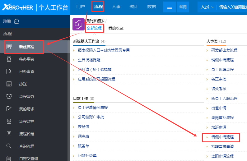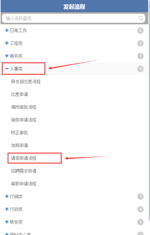 方法一:登录企业微信APP后,依次选择/查看:工作台——工作流程——发起流程——人事类——请假申请流程