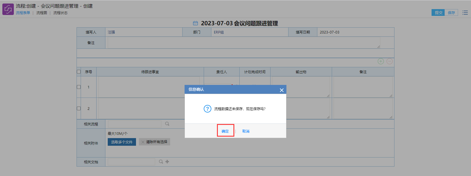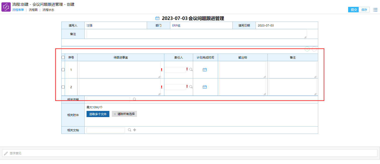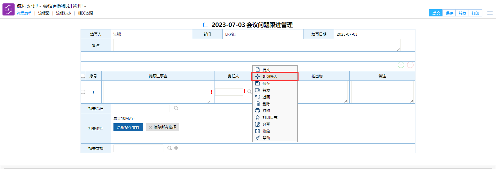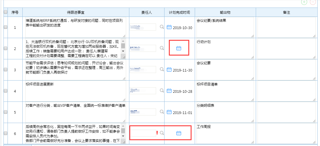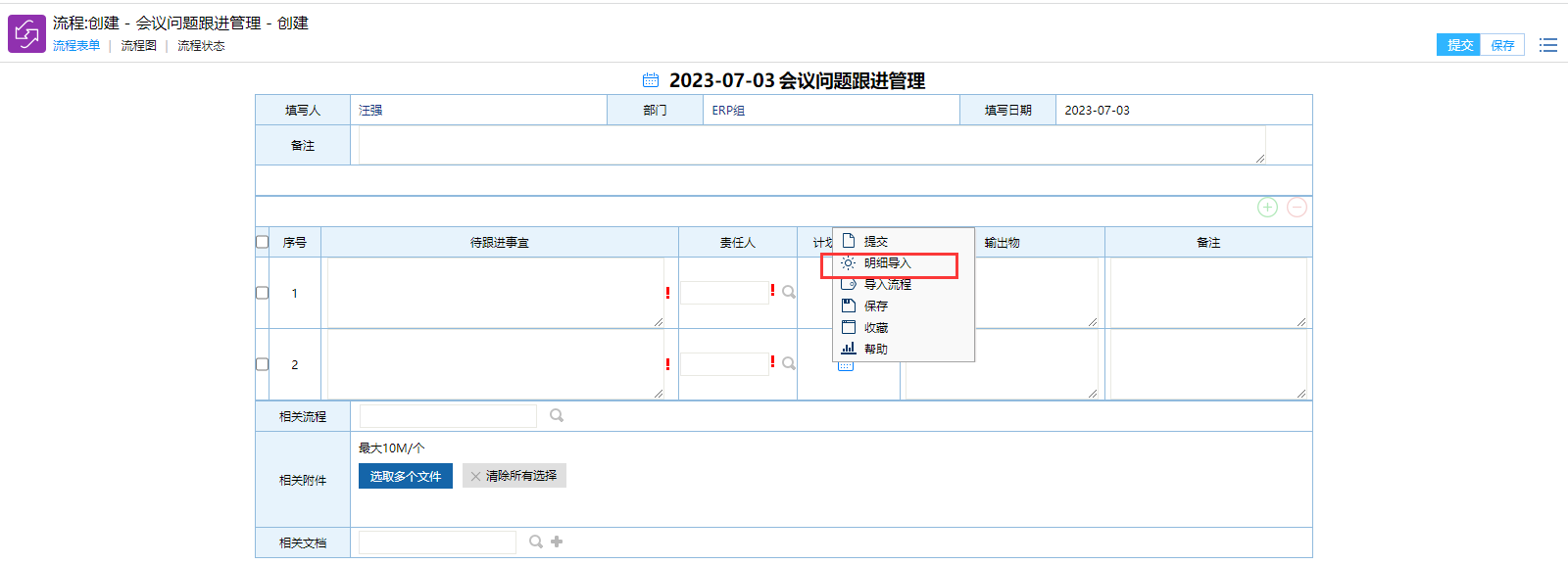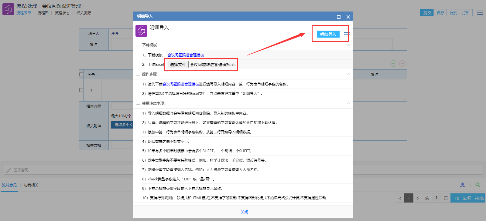 # 一、概述 提供一个周例会会议纪要待跟进事宜管理,方便管理层查看了解。 # 二、发起待跟进事宜 ## 1、路径 会议----会议纪要任务发起  图1 ## 2、操作步骤 **手工录入明细信息.** >此种方式适合待跟进事项较少的情况。  图2 **Excel导入明细** >此种方式适合待跟进事项较多的情况 鼠标点击右键,选择明细导入,如图3所示  图3 弹出“流程数据还未保存,现在保存吗?” 点击保存。图4所示  图4 点击鼠标右键,选择明细导入。  图5 下载系统excel模板,填写数据。  图6 点击“选择文件”,上传按照上一步下载的excel模板的数据文件, 然后点击“明细导入”。图7所示  图7 当数据格式出错时,会提醒出错(如计划完成日期,责任人名字不支持ALL等),遇到这种情况点击确定。  图8 手工补录格式出错未录入的数据。  图9 数据填写后,点击提交即可。 >备注:提交后,每个责任人会收到一条代办流程(PC端,手机微信端都有),如图10  图10 # 三、责任人提交任务完成情况  图11 # 四、事宜未完成提醒 当责任人在计划完成时间前半天为完成时,系统会自动给出系统提醒工作流(PC端,企业微信)。如图12  图12 # 五、附件 明细导入模板 [【附件】会议问题跟进管理模板.xls](/media/attachment/2023/07/会议问题跟进管理模板.xls)