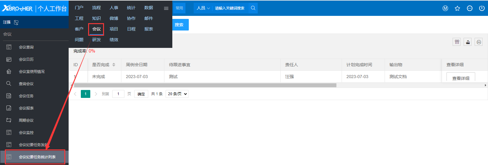 # 一、路径 会议-->会议纪要任务统计列表,如图1  图1 # 二、报表功能介绍 **1、查询** >- 初始化默认显示最新一周周例会纪要。 >- 下拉框可供选择项为已存在的会议纪要的周例会日期。  图2 **2、查看责任人提交的附件文件** > 如果责任人有提交附件,可按图3所示方式查看;点击“查看详情”会弹出信息页面, 可在“相关附件” 处查看或者下载。  图3