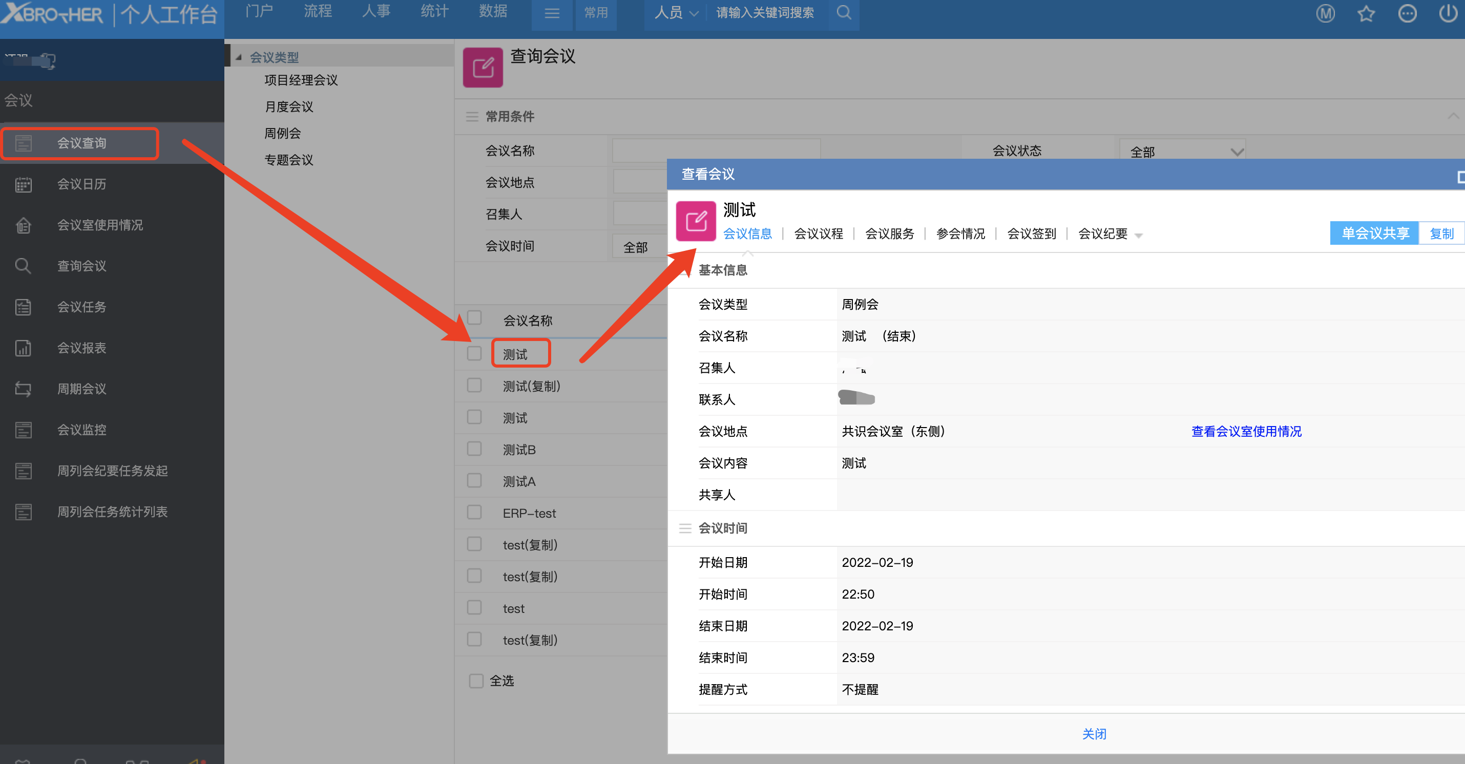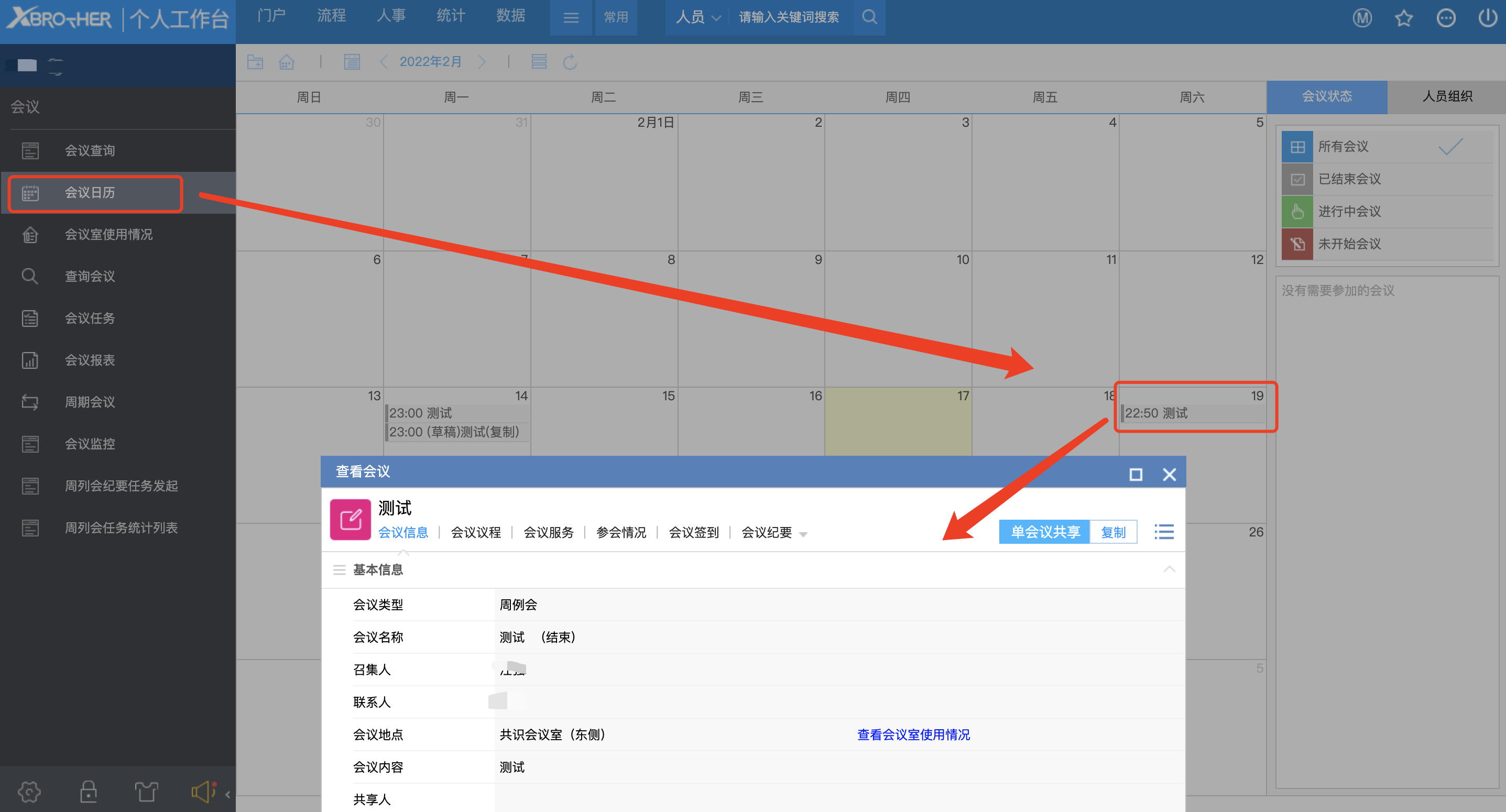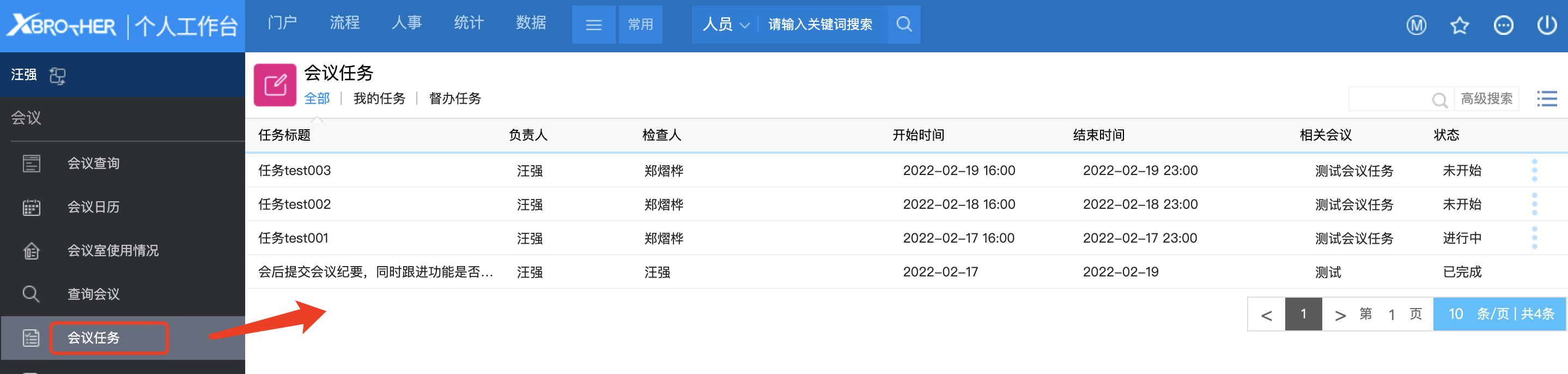 > 提供一个会议任务跟踪功能。 # 一、添加会议任务 ### 1.1 预定会议室 可参考文档预定会议:http://oa.xbrother.com:8890/project-20/doc-101/ ### 1.2 打开查看会议页面 可通过如下方式打开,任选其一 1)点击“会议查询”菜单,在页面中找到相关会议点击会议名称,即可弹出查看会议页面。如下图1所示  图1 2)点击“会议日历”菜单,在页面中找到会议时段,通过点击会议名称,即可弹出查看会议页面。如下图2所示  图2 ### 1.3 添加会议纪要 打开1.2中的弹出页面后,点击右上角“会议纪要”按钮(如图3所示),进入编辑页面(如图4所示)  图3  图4 点击右下角“”,添加任务,可同时添加多条任务,如图5所示。添加完成后,点击右上角“提交”按钮即可。 相关字段说明: - 编号:自动生成序号。 - 标题:必填项,任务标题。 - 执行人:需完成任务的责任人。(执行人会收到会议决议任务跟踪流程提醒,同时需提交流程,提交后流向检查人确认) - 检查人:审核任务执行情况。(具体可参考二中2.2说明) - 开始时间:任务开始时间。 - 结束时间:任务结束时间。  图5 # 二、任务提醒、执行、检查说明 ### 2.1 提醒、执行 任务发起后,执行人会收到任务相关的代办流程(PC网页端及企业微信会同时收到),如图6所示  图6 点击打开提醒流程后,进入详情页面,如图7所示。责任人完成任务后需提交此流程,同时会流向检查人审核。  图7 ### 2.2 检查 执行人提交流程后,检查人会收到一条流程消息,打开后如图8所示,需确认任务是否完成。 确认完成时,点击“提交”按钮;确认未完成时,点击“退回”按钮。  图8 # 三、任务列表 路径: 会议-->会议任务 如图9所示:  图9 点击右侧“”按钮,可完成任务(功能同2.1)。