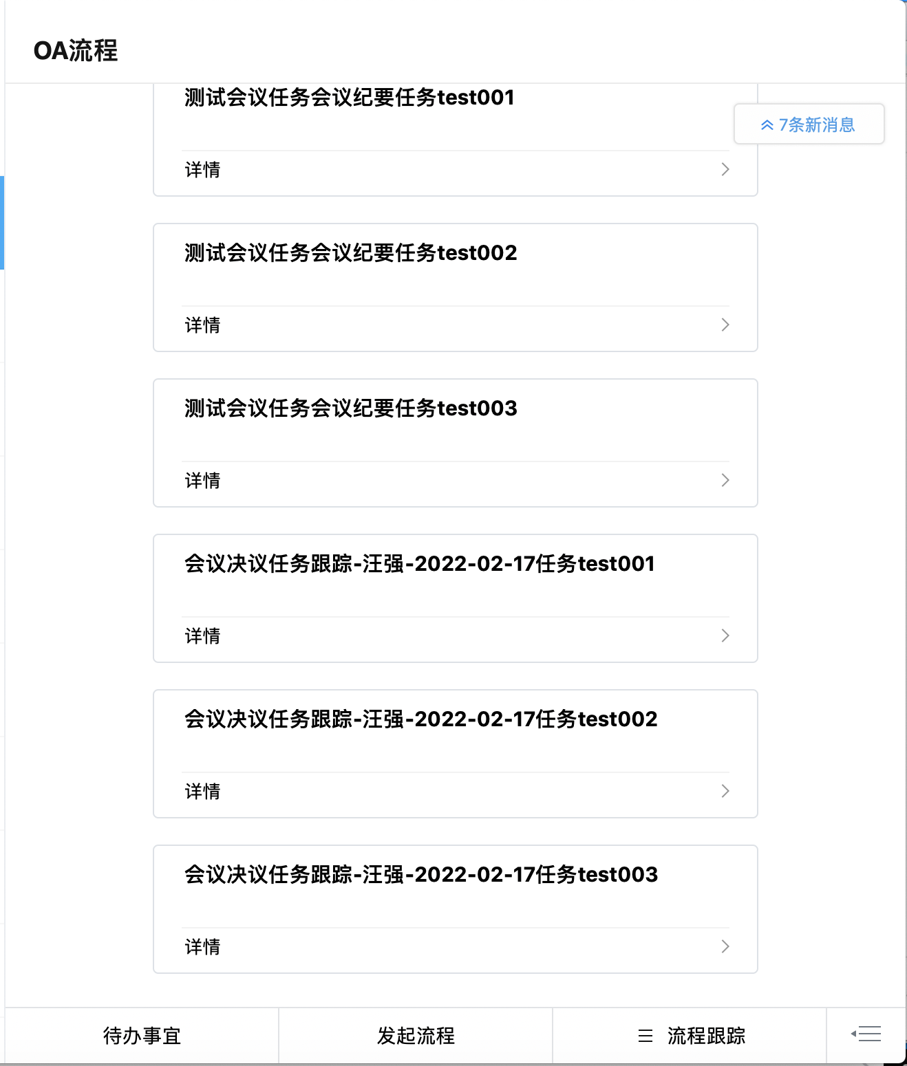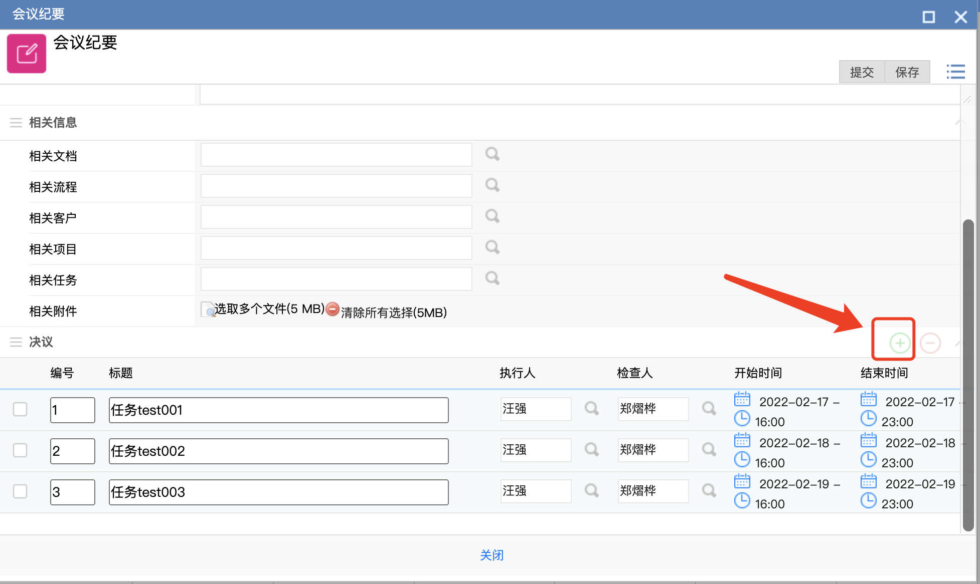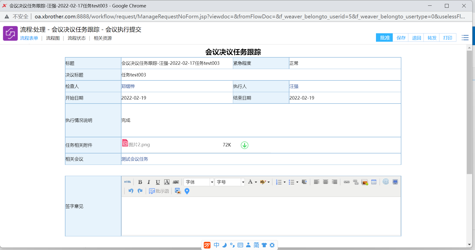 > 提供一个会议任务跟踪功能。 # 一、添加会议任务 ### 1.1 预定会议室 可参考文档预定会议:http://oa.xbrother.com:8890/project-20/doc-101/ ### 1.2 打开查看会议页面 可通过如下方式打开,任选其一 1)点击“会议查询”菜单,在页面中找到相关会议点击会议名称,即可弹出查看会议页面。如下图1所示  图1 2)点击“会议日历”菜单,在页面中找到会议时段,通过点击会议名称,即可弹出查看会议页面。如下图2所示  图2 ### 1.3 添加会议纪要 打开1.2中的弹出页面后,点击右上角“会议纪要”按钮(如图3所示),进入编辑页面(如图4所示)  图3  图4 点击右下角“”,添加任务,可同时添加多条任务,如图5所示。添加完成后,点击右上角“提交”按钮即可。 相关字段说明: - 编号:自动生成序号。 - 标题:必填项,任务标题。 - 执行人:需完成任务的责任人。(执行人会收到会议决议任务跟踪流程提醒,同时需提交流程,提交后流向检查人确认) - 检查人:审核任务执行情况。(具体可参考二中2.2说明) - 开始时间:任务开始时间。 - 结束时间:任务结束时间。  图5 # 二、任务提醒、执行、检查说明 ### 2.1 提醒、执行 任务发起后,执行人会收到任务相关的代办流程(PC网页端及企业微信会同时收到),如图6所示  图6 点击打开提醒流程后,进入详情页面,如图7所示。责任人完成任务后需提交此流程,同时会流向检查人审核。  图7 ### 2.2 检查 执行人提交流程后,检查人会收到一条流程消息,打开后如图8所示,需确认任务是否完成。 确认完成时,点击“提交”按钮;确认未完成时,点击“退回”按钮。  图8 # 三、任务列表 路径: 会议-->会议任务 如图9所示:  图9 点击右侧“”按钮,可完成任务(功能同2.1)。