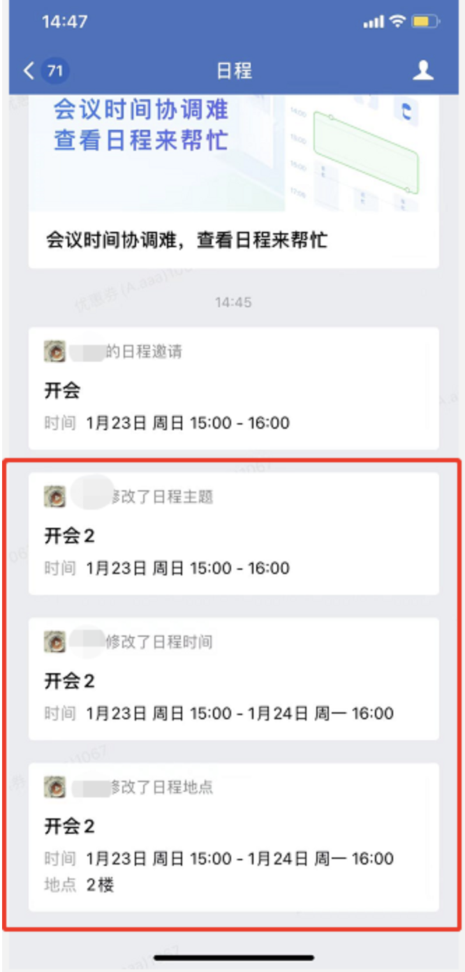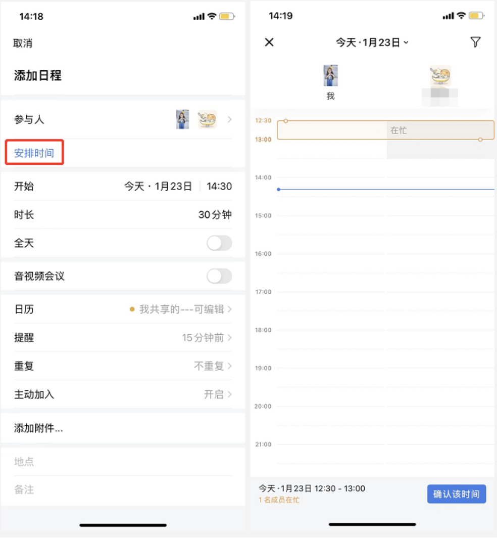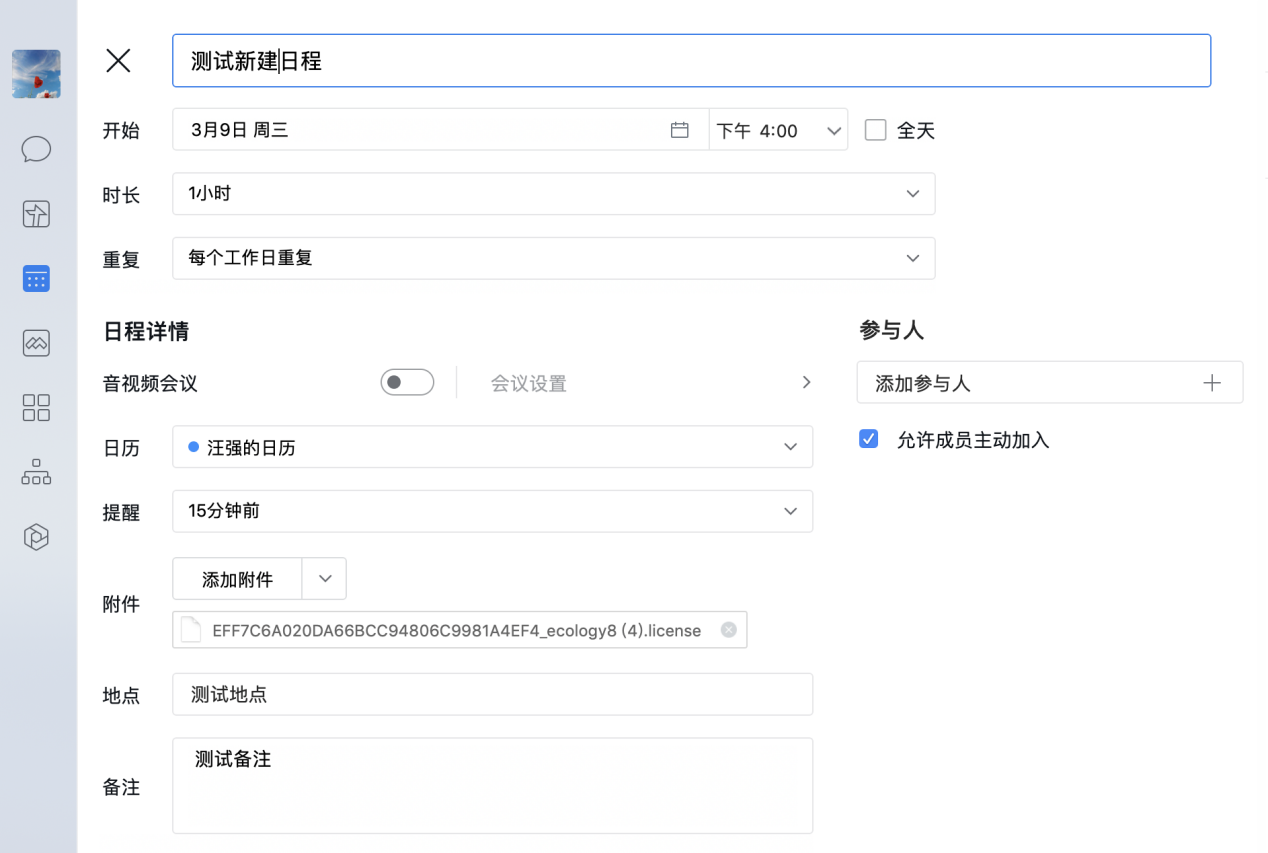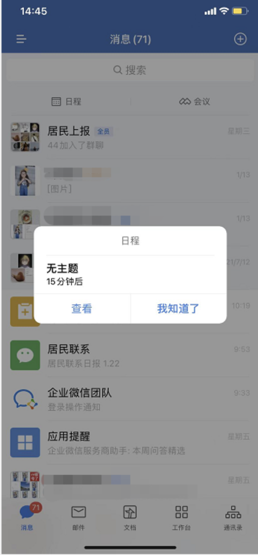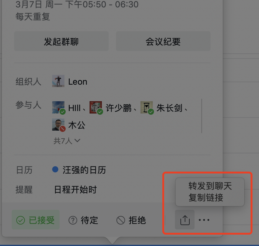 # 日程、代办、置顶相关说明 # 添加到日程 当收到一条消息来不及处理时,可以长按这条消息->选择“日程”(PC为“添加到日程”),添加日程。 ## 查看日程参与人闲忙 目前有三种方式可以查看成员日程闲忙状态。 1. 新建日程-选择参与人,点击「安排时间」后,可以查看参与人闲忙。  1. 点击个人信息页-查看日程,可以点击自己和对方的日程闲忙。  1. 点击群后信息页-查看群成员日程,可以查看群内成员的闲忙状态,找到成员共同的空闲时间,快捷创建日程。  ## 新建日程 PC端点击日程,进入新建页面(移动端点击日程后点击右上角“+”号或者底部新建日程快捷键),以PC为列说明。  相关说明: * + 1. **开始** 选择日程开始日期及具体开始时间。可选择全天,此时无需填写时长,但需确定结束日期。 * + 1. **时长** 日程持续时间,默认提供30分钟/1小时/2小时/3小时选择项供选择,也可自定义结束时间。 * + 1. **重复** 如周期性工作,可采用此设置,默认提供不重复/每天重复/工作日重复/每周重复/每两周重复/每月重复/每年重复等选择项,也可自定义重复规则。 如图设置,代表每个工作日下午4点到5点都存在日程。  * + 1. **提醒** 日程开始前提醒,提供日程开始时/5分钟前/15分钟前/1小时前/1天前等选择项选择,同时也可选择不提醒。 * + 1. **附件** 新建时可添加相关附件,附件可从本地选择,也可从微文档/微盘选择。 * + 1. **参与人** 可选择企业内同事参与,共享日程,添加后其日程面板里也会显示。 * + 1. **允许成员主动加入** 勾选后代表其他人可主动参与,可分享日程给他人,打开后点击接受即可加入。 ## 日程提醒 1. 组织人创建日程后,其他参与人将收到日程卡片提醒。  1. 日程信息(主题、时间、地点)修改后,日程应用推送日程卡片,提醒参与人关注信息变更。  1. 日程开始前,参与人将收到日程的自动弹窗提醒,避免错过会议。  ## 应用实列 建立日程提醒上下班打卡。 如图所示上班打卡提醒设置   其中重点为设置每个工作日重复及15分钟前提醒。 # 添加到代办 ### 添加到代办 当收到一条消息来不及处理时,可以长按这条消息->选择“待办”(PC端为“添加到代办”),添加提醒。在设置待办的页面,可以设置待办提醒时间以及添加待办参与人,添加完待办后,你和参与人将会收到一条系统提醒消息,同时在【待办】里查看到该提醒。  ### PC端查看代办 路径:日程--代办  ### 移动端查看代办 路径:日程--代办   # 置顶 1. 在多人聊天时,可以长按某一条消息气泡,选择“置顶”,即可把当前消息置顶到群聊窗口顶部,方便群聊成员查看,避免遗漏。 2. 群聊成员可以移除消息置顶,不影响其他成员查看。 3. 置顶创建者移除,会将所有群成员的消息置顶移除。 4. 消息置顶不会自动过期,每个群聊同一时间内只能展示一条消息置顶。
