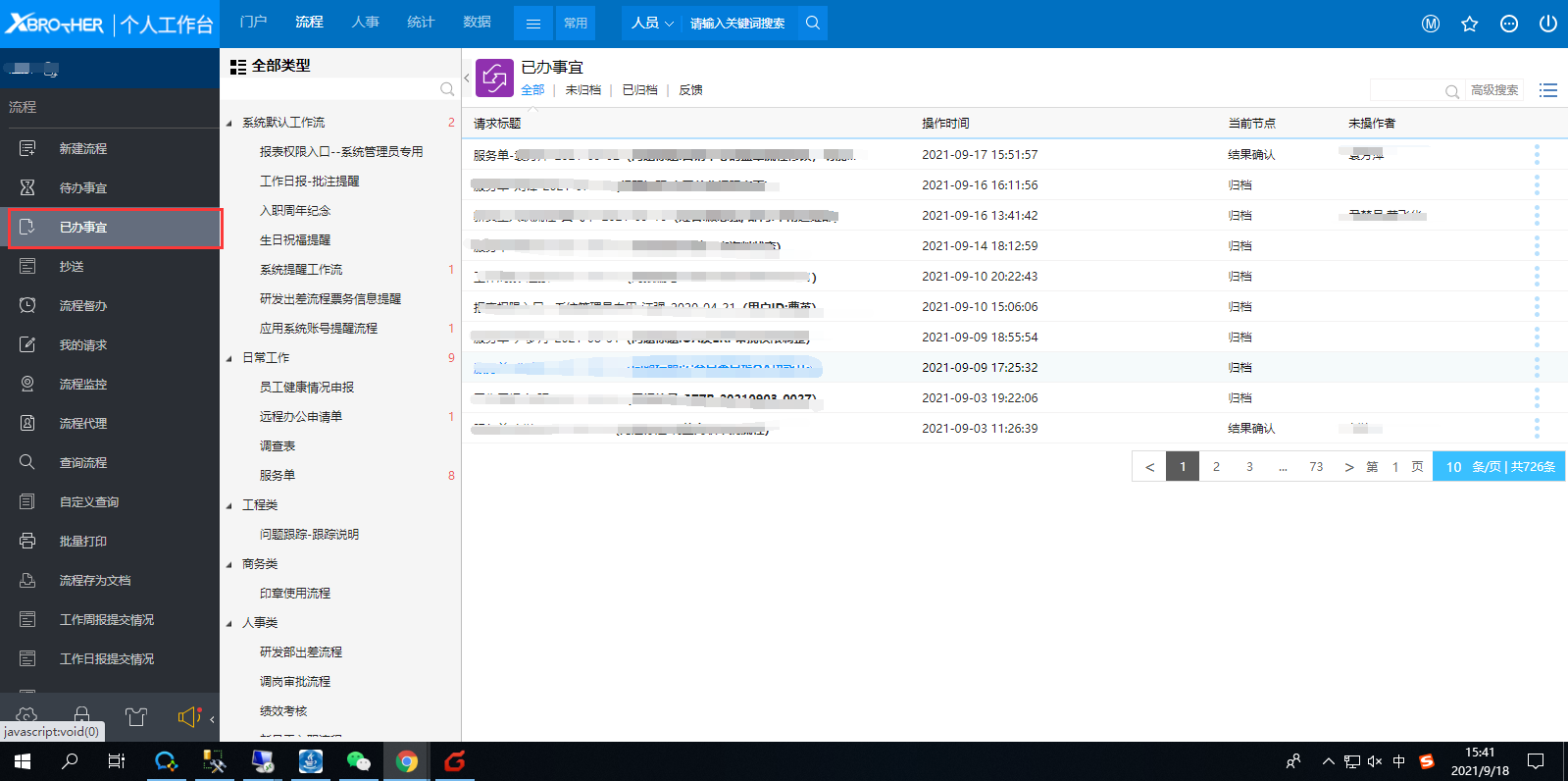 ### 一、概述 使用者可以点击已办事宜查看使用者已经处理还未归档的流程被处理的情况。 ### 二、功能说明 点击前端应用中心菜单【流程】--【已办事宜】,打开如图1所示的页面:  图1 - 默认展现【全部】标签页,可选标签页【未归档】、【已归档】和【反馈】,用于查看对应状态的流程。 - 默认左侧的流程列表树是展开的,点击可隐藏路径类型树。 - 右上角快捷查询可根据“请求标题”查询流程。 - 点击【高级搜索】,展开高级搜索。 - 对于已办事宜,鼠标覆上列表行显示的常用操作选项有【打印】,对于设置了已办事宜可转发的流程,有【转发】功能,对于启用【记录表单修改日志】功能的流程,操作选项里还有【表单日志】。 ### 三、操作选项说明 1、打印:【打印】即打印已办事宜,点击可跳转到打印页面,直接在打开的已办流程中打印效果一致。 2、转发:允许已办事宜转发的流程有此操作选项,点击打开转发窗口,同待办转发一样可选择转发接收人和填写签字意见。 3、表单日志:点击可在打开的窗口中快捷查看节点表单的修改日志。